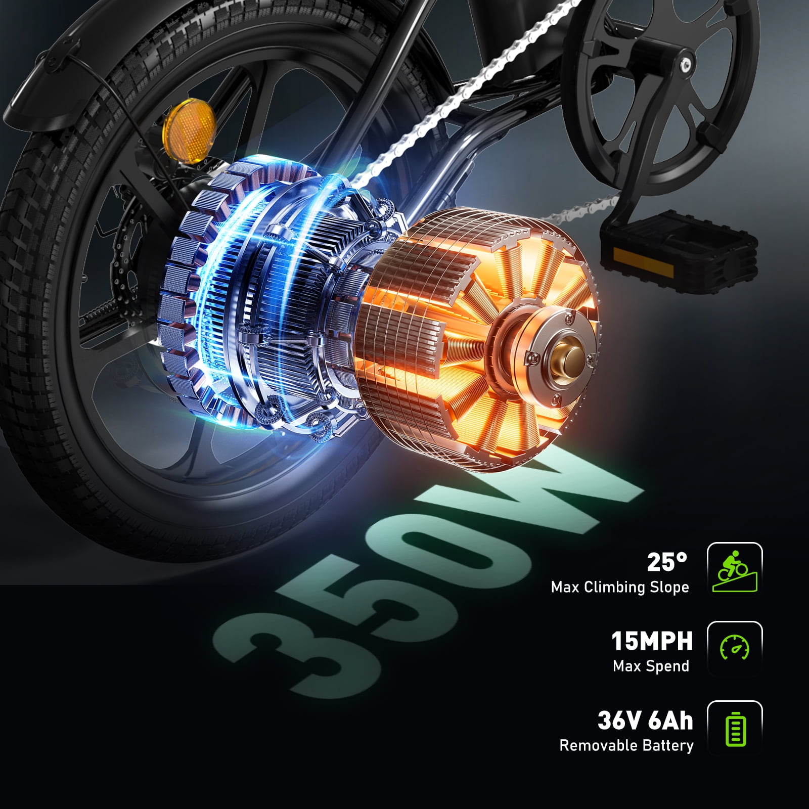 We are proud to introduce COLORWAY new electric bicycles BK35M. COLORWAY BK35M Foldable Electric Bike is the ultimate solution for effortless commuting, whether you’re cruising in the city or exploring the countryside.Perfect for any short trip or commute for women, men, and teens. Material: Aluminum alloy Expanded size: 1380*530*1030mm Folding Size: 790*440*660mm Wheel Size: 16*2.5 Packing size: 765*410*570mm Gross/Net Weight: 51.69lb/38.40lb Maximum load: 220lbs Maximum speed: 15MPH Maximum climbing angle: 25 degrees Applicable temperature: -10~45℃ Waterproof grade: IP54 Battery type: lithium-ion power battery Battery capacity: 6.0Ah Maximum endurance time: 16-37MILE Battery rated voltage: 36V Motor rated power: 350W