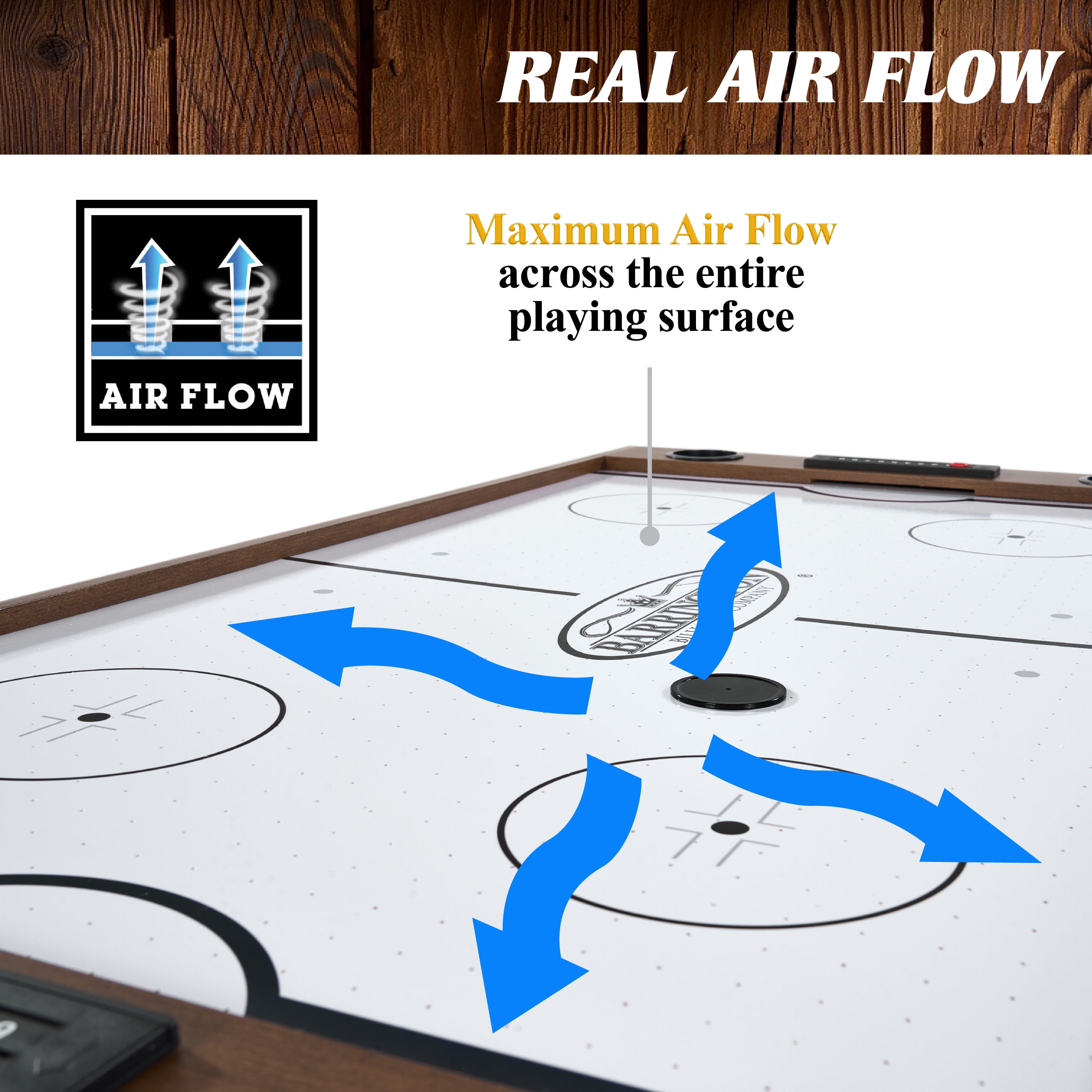 Barrington 3-in-1 Combination Game Table 54”, Foosball, Air-Powered Hockey and Table Tennis Combo Table, Multi Game Table Perfect for Family Game Rooms, All-In-One Arcade Table 3-IN-1 GAMING EXCITEMENT: Enjoy classic games with this multi game table. Table measures 54″ (hockey goal to goal) and includes Air-Powered Hockey, Foosball, and Table Tennis all in one! The table is modern, cost-effective, and fun for the whole family. AIR-POWERED HOCKEY – At 70 CFM, the hockey table’s 12V premium blower fan provides maximum airflow to glide the puck across the 45.8” x 25.3” PVC laminated surface. The table features a manual slide scorer and four built-in cup holders. FOOSBALL & TENNIS: Foosball attaches and locks onto the hockey base and measures 44.9″ x 22.3″. Players are pre-assembled on .5″ steel rods. The tennis playfield also fits over the hockey table base with a smooth PVC laminate top, measuring 53.8″ x 26.3″. CRAFTSMANSHIP: The table apron is durable and constructed of woodgrain laminated engineered wood. A wooden connection bar and block-style legs with a concrete finish add extra stability. 1.5” leg levelers keep the playing surfaces even on various floors. SIZE AND SPACE – The compact table (54″L x 26.5″W x 34.25″ H) is a space-saver. The suggested room size is 11.5’ x 8.5’. The multi-game table is a great gift, and the games are fun at parties. Get ready to compete with your friends and family. GEAR UP FOR GAME TIME: Includes Net and Post, (2) Paddles, (2) Tennis Table Balls, (2) Hockey Pucks, (2) Pushers, (2) Soccer Balls. Get ready for unforgettable moments with family and friends as you challenge each other for an exciting game night.