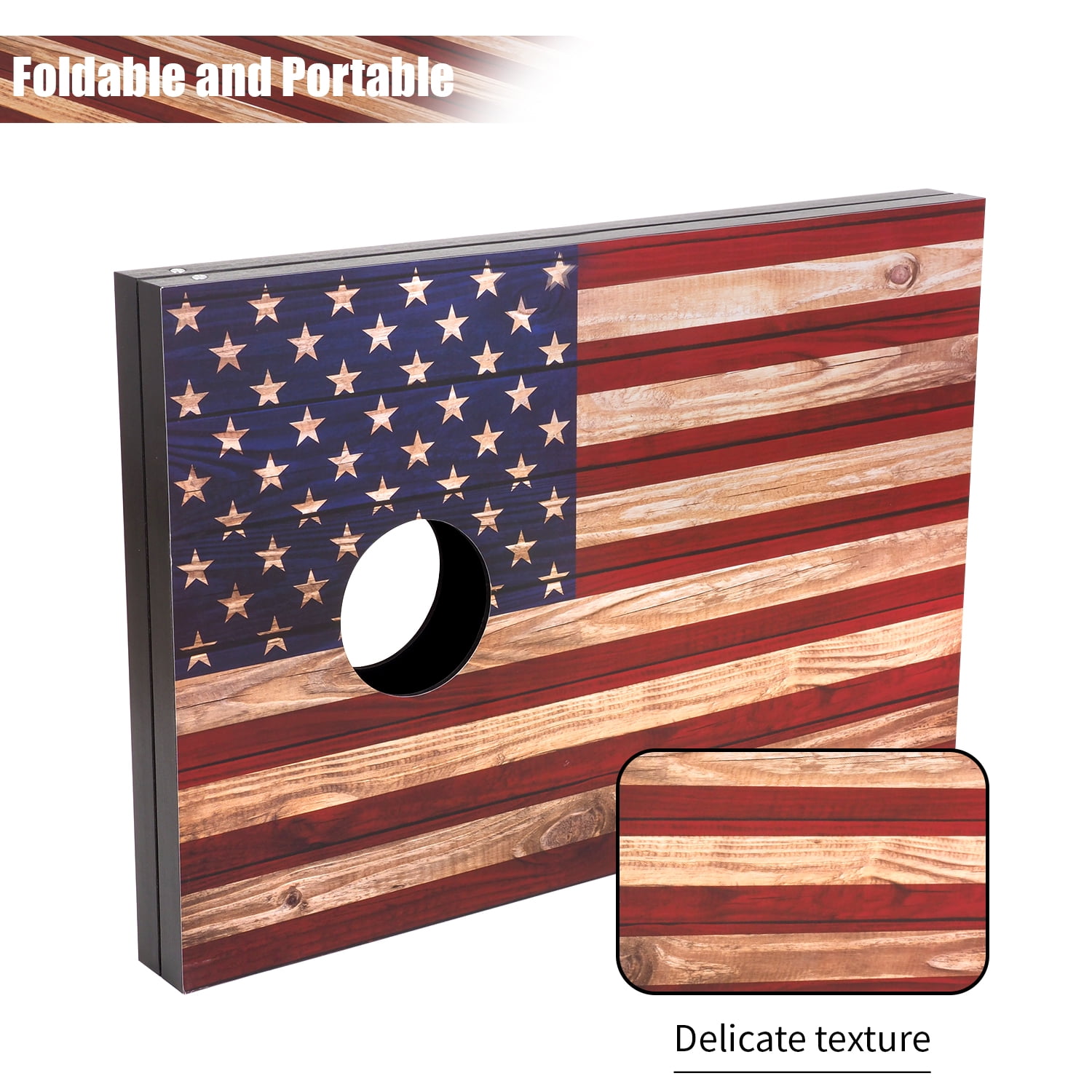 Cornhole Outdoor Game Set: Included two 35.4″ L x 23.6″ W x 1.5″H MDF target boards and eight 5.5″ x 5.5″ 12ounce toss bags (4 star and 4 stripe). Flag Pattern The Vintage Style: The surface of the MDF target board with flag wood grain sticker design makes the game a classic. Dual Sided Bean Bag: Cornhole beans bags are made with durable duckcloth fabric, Easy to push or maneuver the blocker bags with slick side. Size: 2’x 3′ size is suitable for all occasions. Transportation: The two corn hole boards are attached together with Velcro, and the board set has a handle for easy transportation. Great For Outdoor Fun: Great for barbecues,cookouts, campsites,parties, weddings, backyard fun
