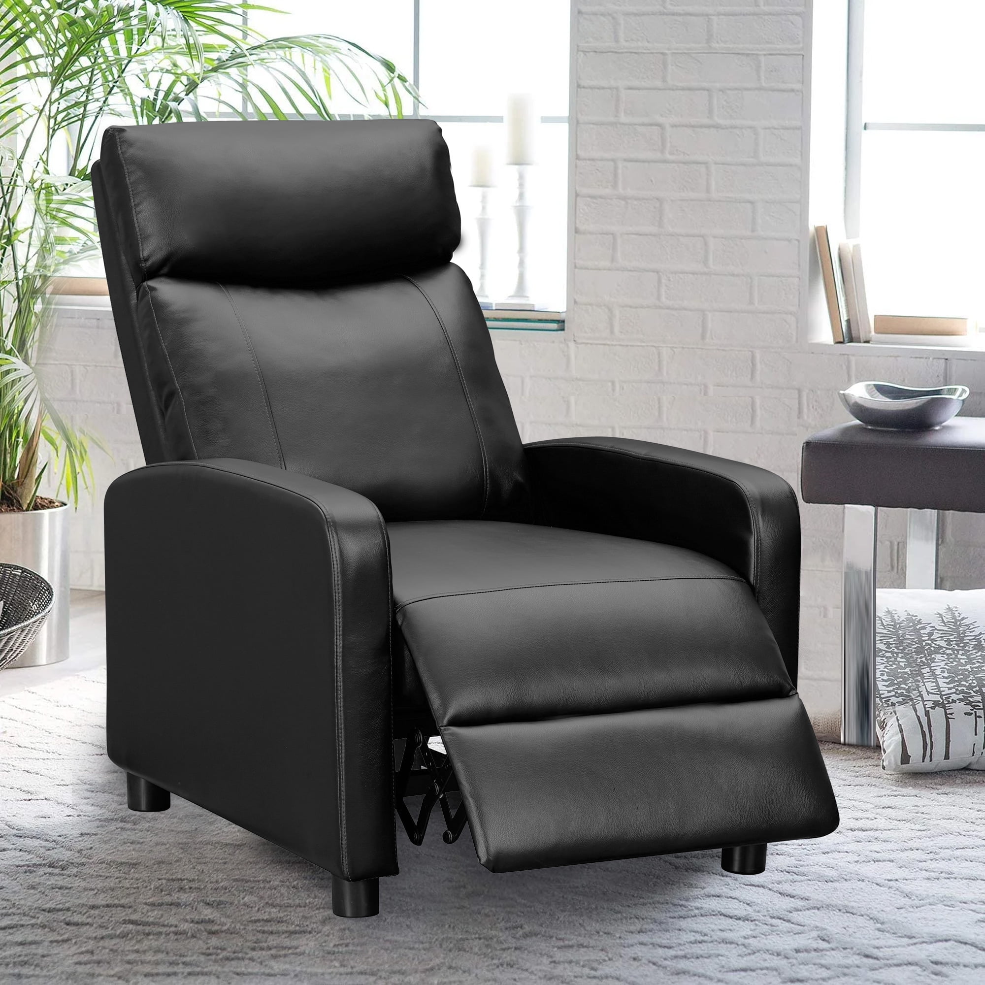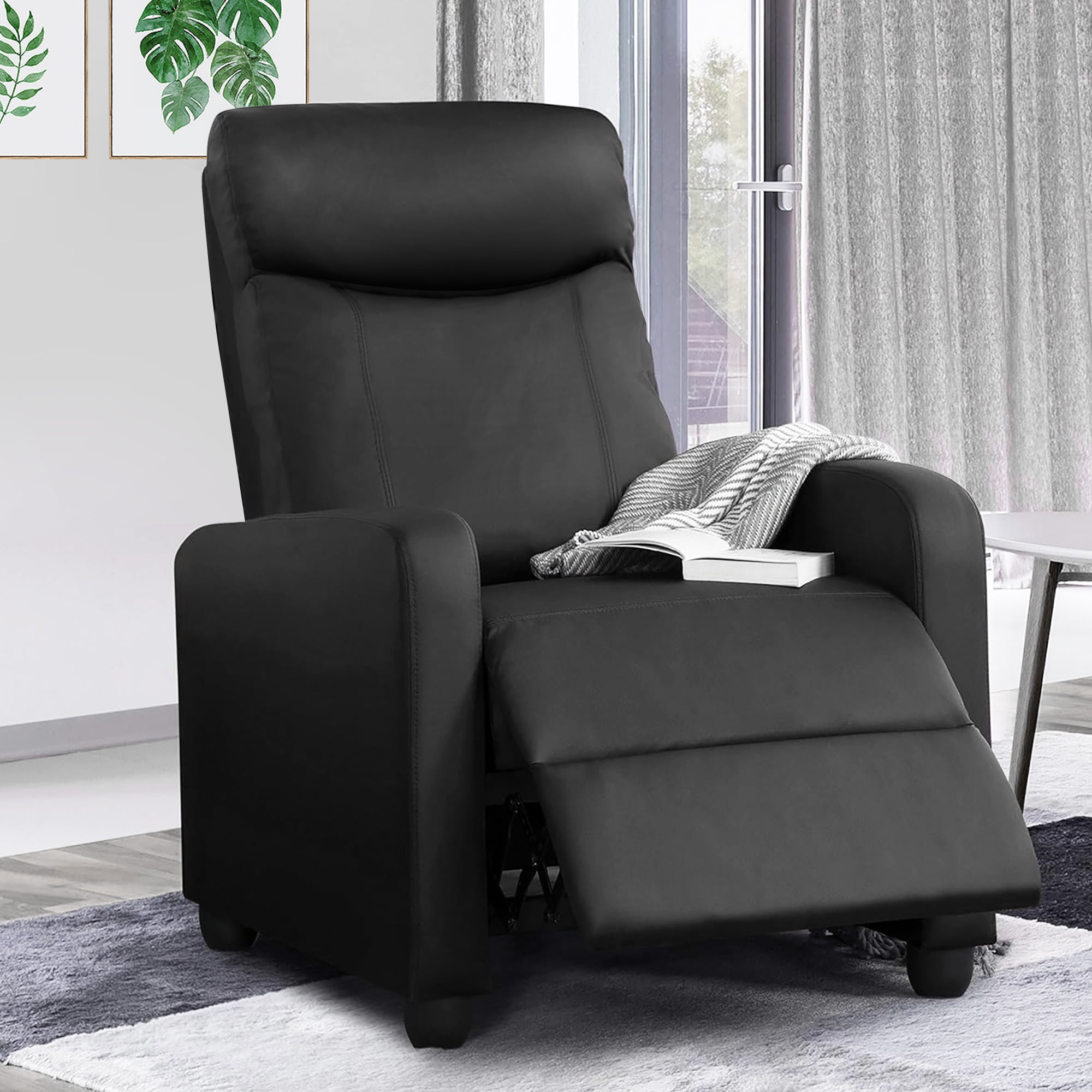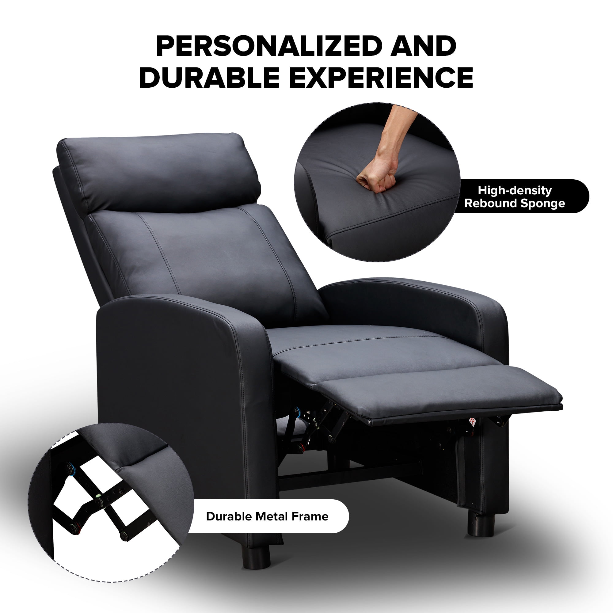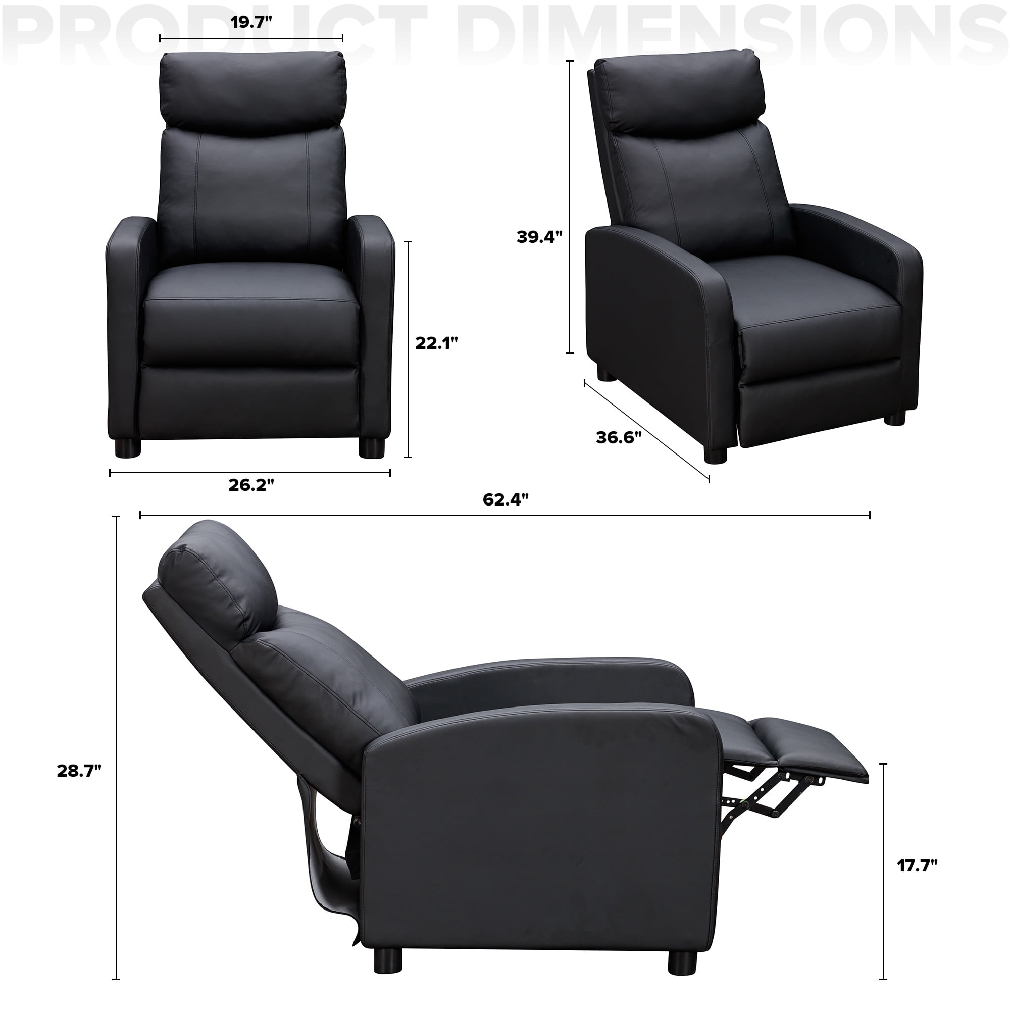 COMHOMA Faux PU Leather Push-Back Recliners, Black Indoor recliner designed for comfort and relaxation Thick padded seat and back for enhanced comfort Easy adjustment modes to suit your needs Overall dimensions: 26.18 x 36.61 x 39.37″ (W x D x H) Fully reclined dimensions: 26.18 x 62.44 x 17.68″ (W x D x H) Net weight: 57.5 lb Gross weight: 64.4 lb