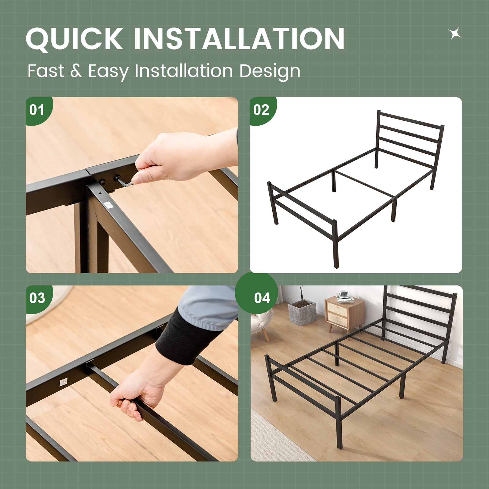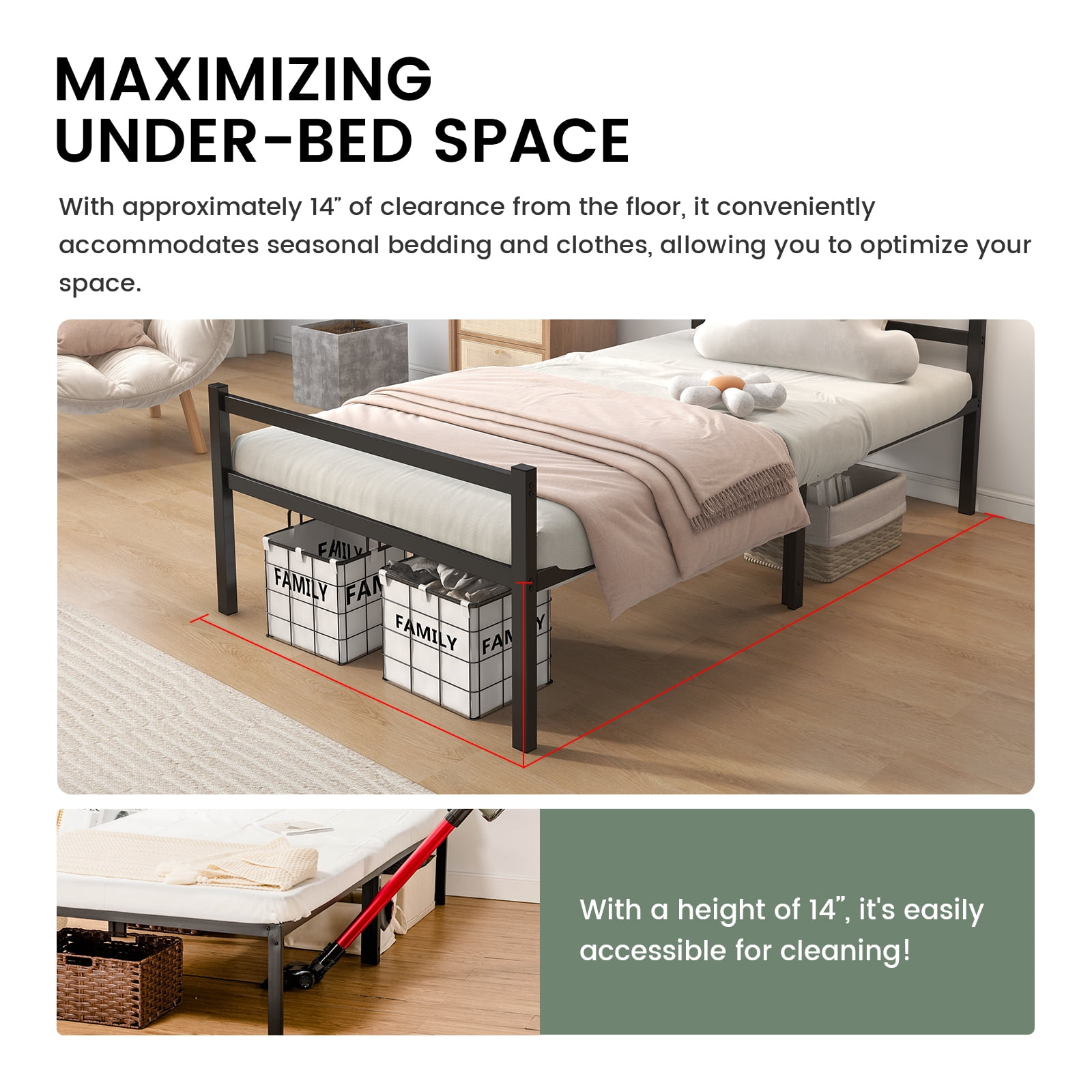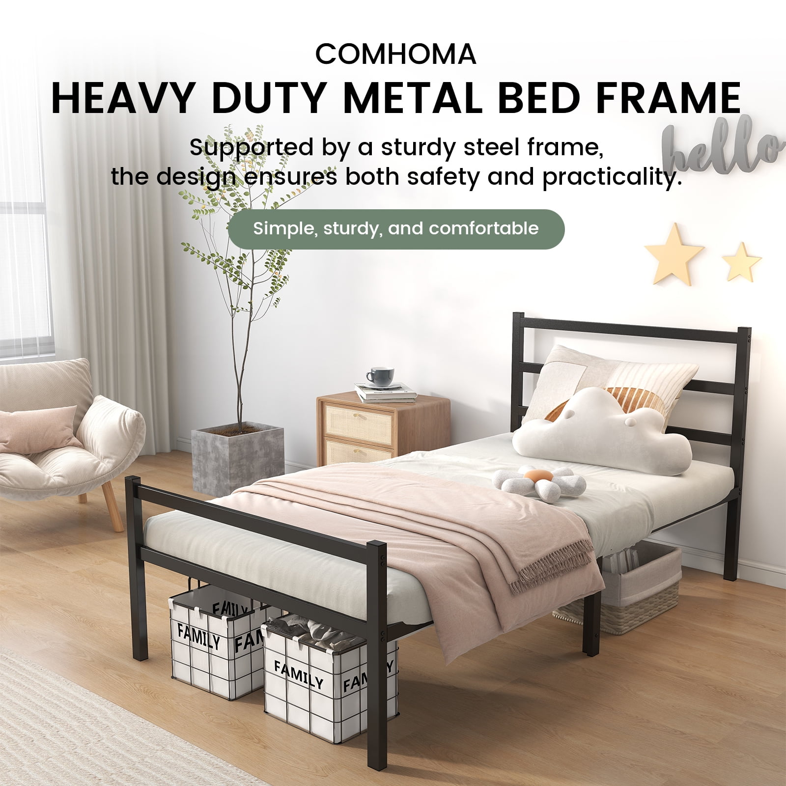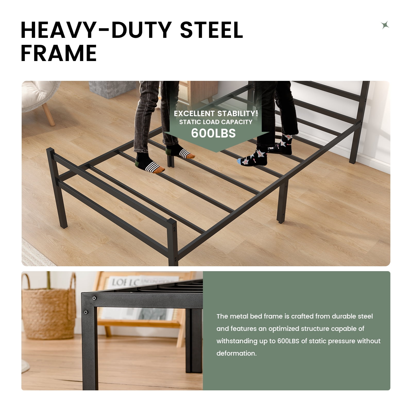 COMHOMA 14 inch high elevated platform boast premium quality construction to ensure lasting durability. With a heavy-duty capacity of 600 pounds, sturdy rail slats 9 solid legs and no need for a box spring or a trundle, these mid century fancy frames offer reliable support for your mattress. Whether it’s a twin, full, queen or king frames come in versatile sizes to fit your needs. [Modern to Rustic]: Say goodbye to squeaky frames with our minimalistic western design that blends seamlessly with any decor style, from modern to rustic. It upgrades your bedroom with sleek, sturdy, and stylish theme. [SAFE FOR YOUR FAMILY] : Unlike wood beds, metal beds are bug-resistant, making them ideal for a clean and healthy sleep environment. Dissimilar to upholstered beds that can get stained over time, our metal bed requires minimal upkeep. [MORE ROOM FOR YOUR BEDROOM] : Create more breathable space in your bedroom with this iron cast frame, providing 14 inches of under-bed clearance to floor for extra storage. Reduce clutter and increase organization with ample space for bedding, books, dog or cat bed, stow away goods and essentials, minimizing the need for repetitive tidying. [CLASSIC FURNITURE] : Metal bed frame base with tall head board is the perfect fit for doubles, adults, toddlers, kids, teenagers, daughters, sons, boys, and girls alike. Whether it’s for a cozy toddler’s room or a stylish teen’s space, its easy assembly and adjustable features make it a practical choice for any room.