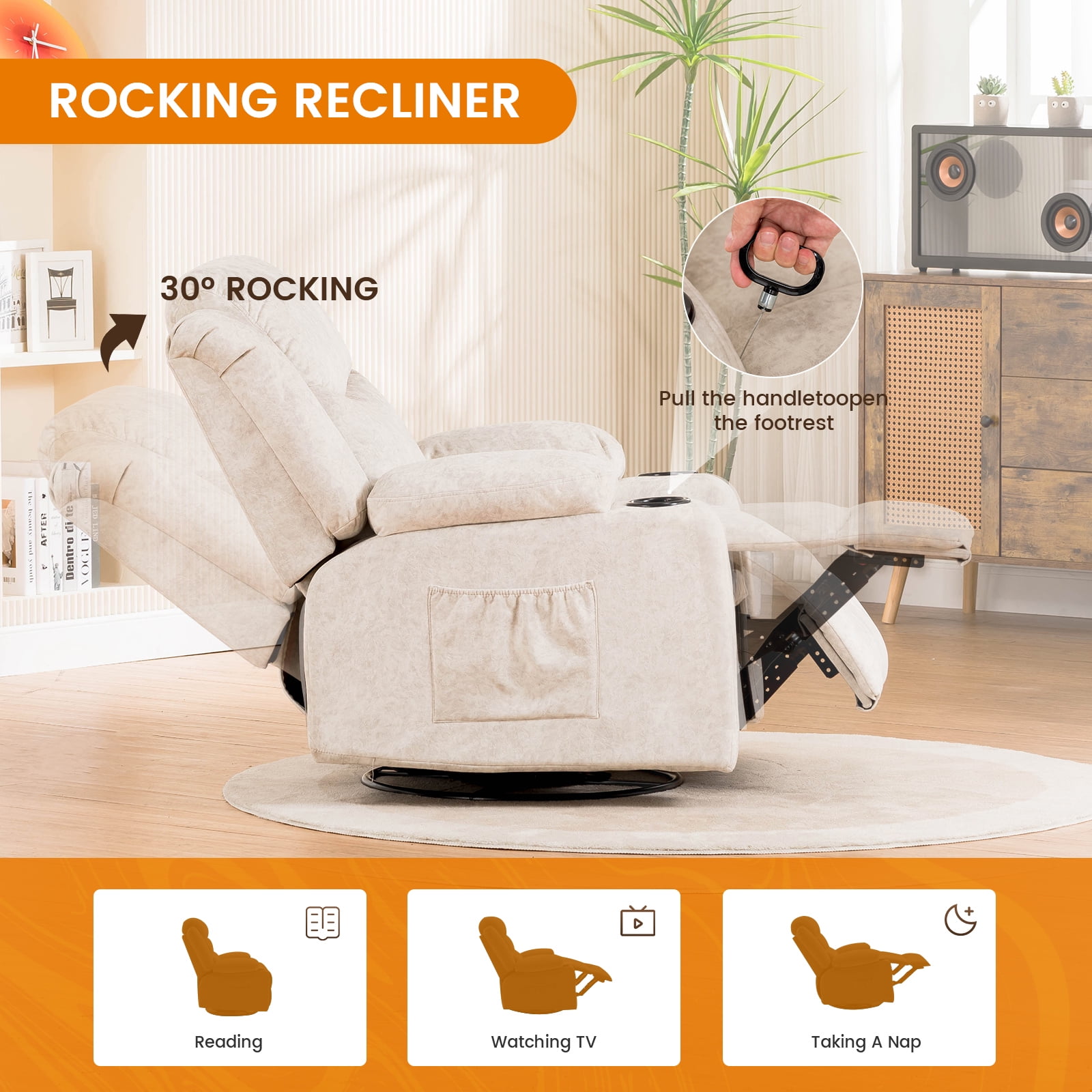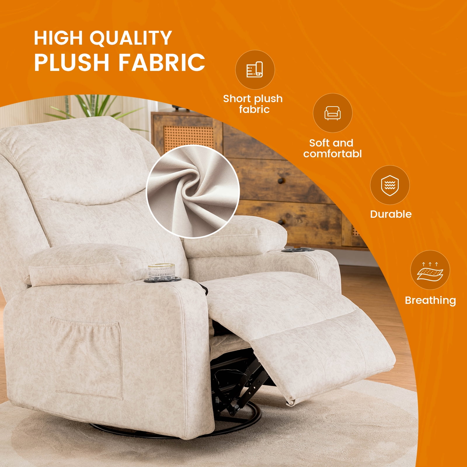 COMHOMA Plush Fabric Swivel Rocker Recliner with Heat, Massage, and Adjustable Footrest, White