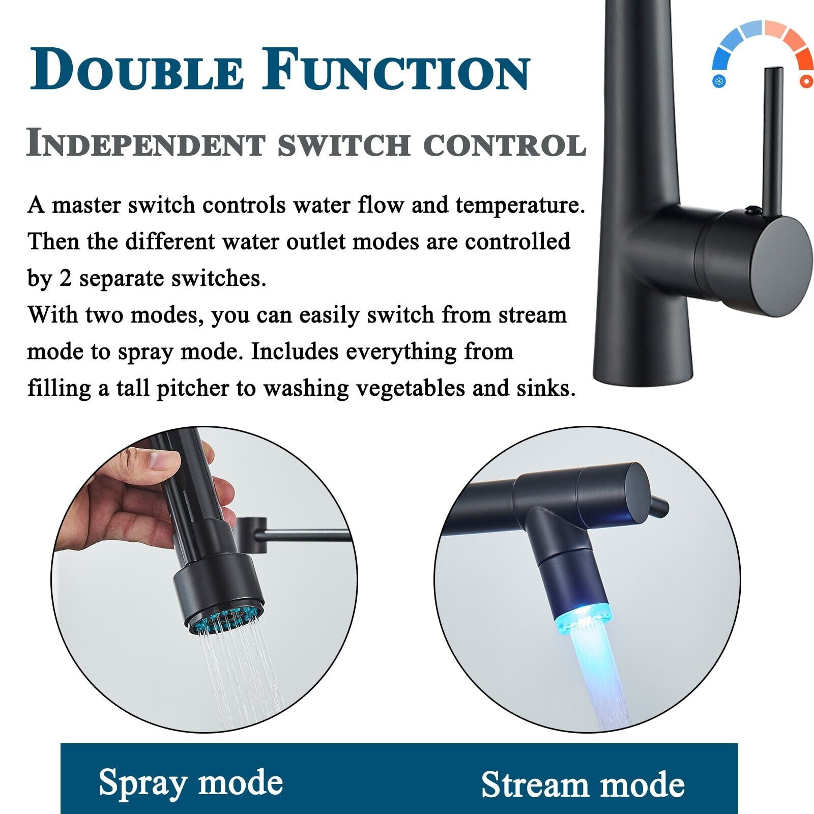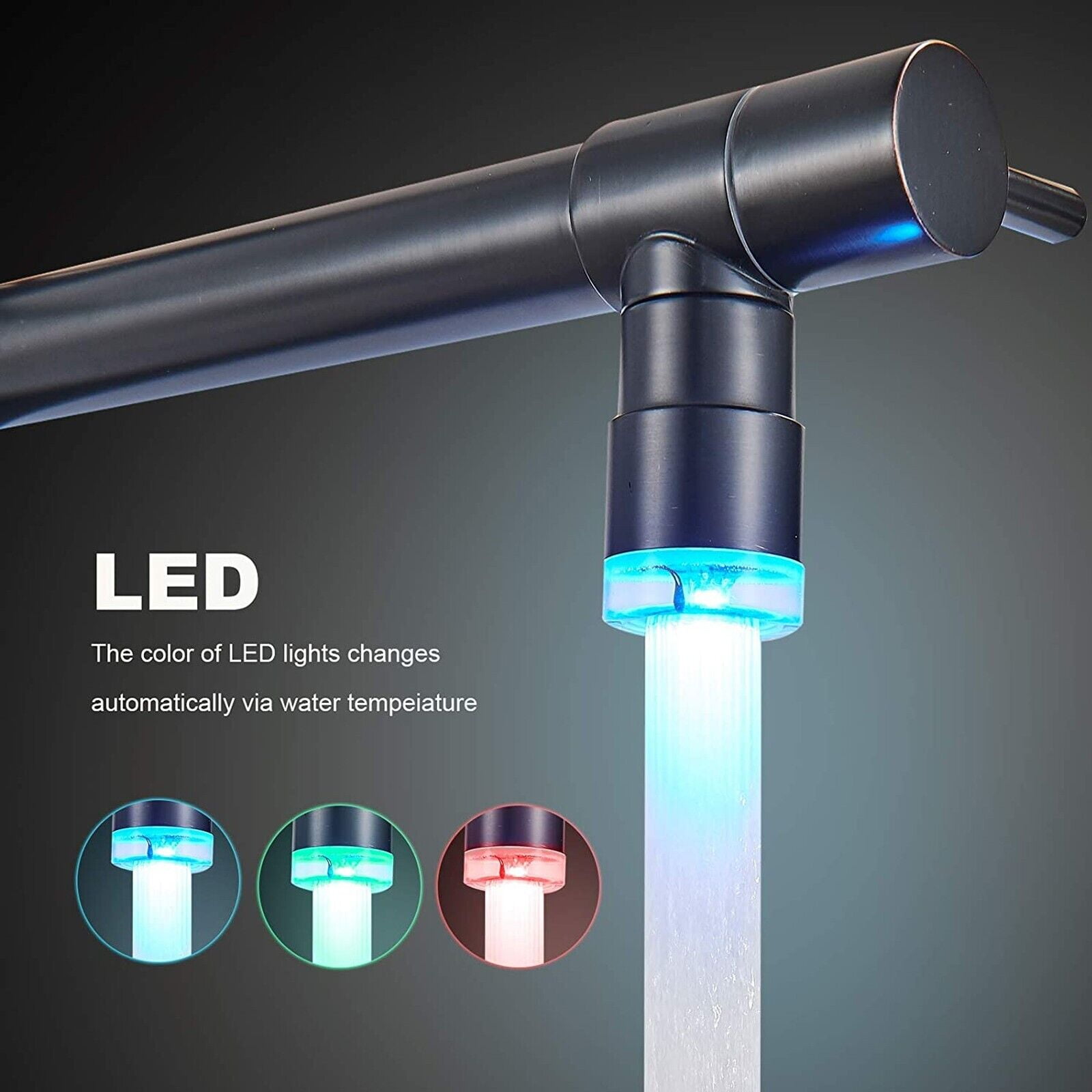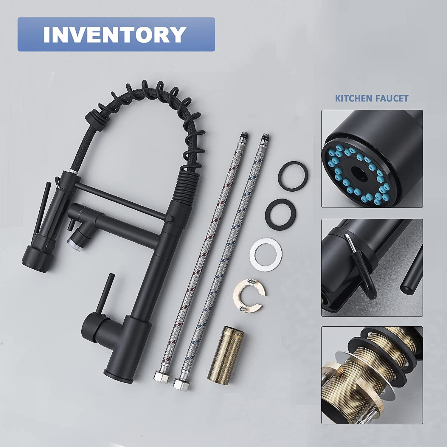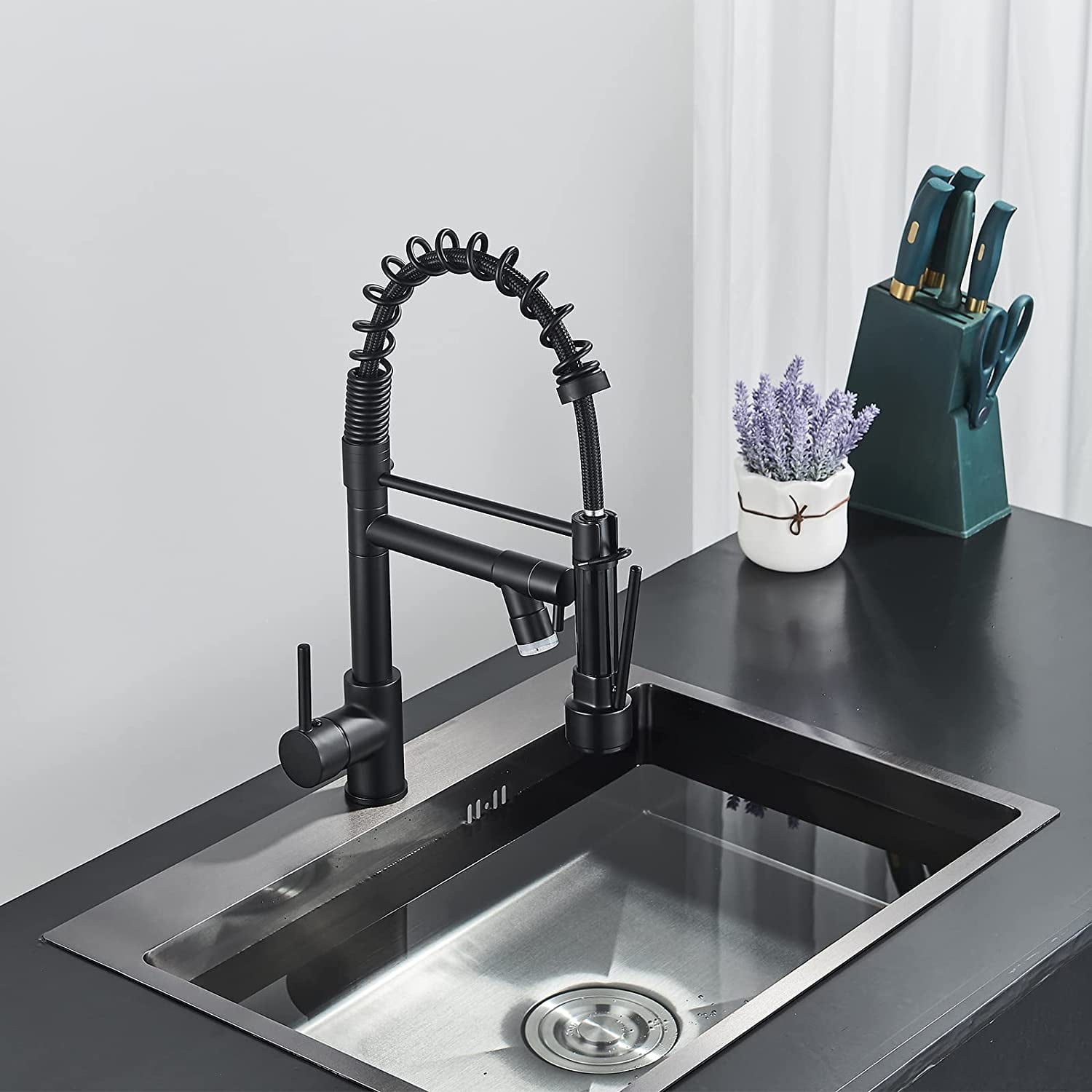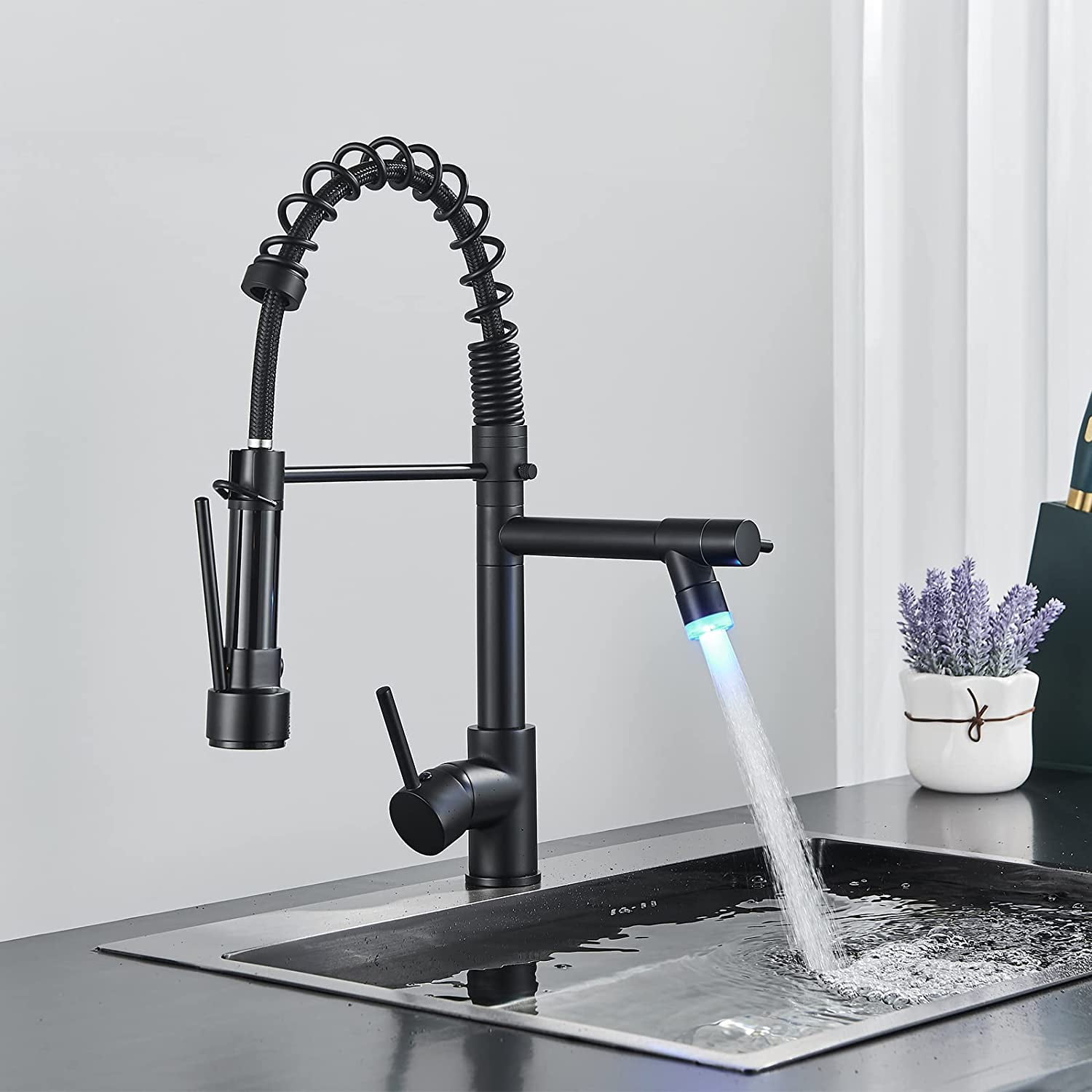 Feature a modern look and high-grade spring with extreme flexibility Two nozzles of different uses satisfy your specific needs high-pressure nozzle provides a powerful, high- volume spray while the other one has a steady stream The two nozzles are removable to rinse every part of cookware and sink Made of top grade brass with the Brushed finish, exceptionally durable and resistant to scratching, tarnishing, corrosion and discoloration.Installation Method: Surface Mount / Desk Mount Water Mode: One Spout with Stream Water,another Spout with Spray Water Water Pressures: Minimum 0.3mpa,Maximum1.5mpa Water Pressures Test: Each faucet is tested at high water pressure to ensure high quality and long durability Number of Handles: Single Handle Provides Both Convenience and Control Precision Use Time of Valve: The ceramic disc cartridge can survive 500,000 times open & close test.Spout Type: Swivel Feature: Pull Down Spray,LED Faucet center: Single Hole LED Power Source: Water Flow LED.Pull down hose and water Line hose altogether preinstalled in kitchen faucet to save much time under the sink,no require plumber,finish DIY installation less than 30 minutes Black with Unique LED Design Pull Down Swivel Spout Kitchen Sink Faucets ✅Solid brass body, Lead-Free Brass Construction^Convenient Single-Lever Design safe, durable. ✅Single Handle: easy control of hot and cold water.Spout rotation range: 360 degree, offers two different spray or stream ways. ✅Easy to install with its quick connect design and heavy-Duty Commercial-Style Spring Design. ✅Ceramic Disc Valves Exceed industry Longevity Standards, Ensuring Reliable Drip-free Use and Durable Performance For Fife