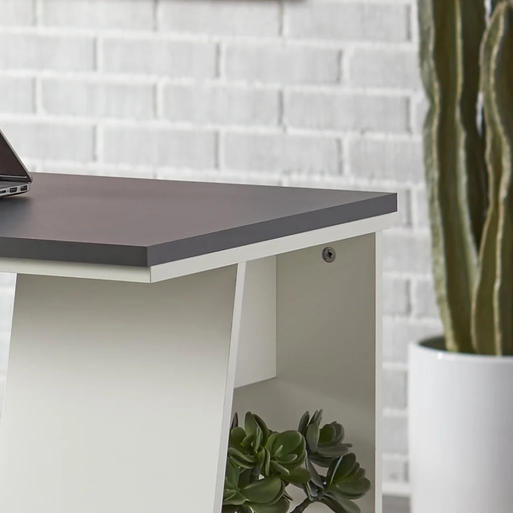 Desk has 3 drawers and 2 side shelves that are good for storing books and office supplies Number of drawers: 3 2 fixed shelves Top shelf dimensions: 15.5″W x 9″D x 10″H Bottom shelf dimensions: 15.75″W x 9″D x 10″H Overall dimensions: 52.75″W x 19.75″D x 29.75″H Assembly required Desk and task chairs sold separately. See our assortment of desk and task chairs. Made of wood composite Writing desk with shelf available finishes: black, white and white/gray
