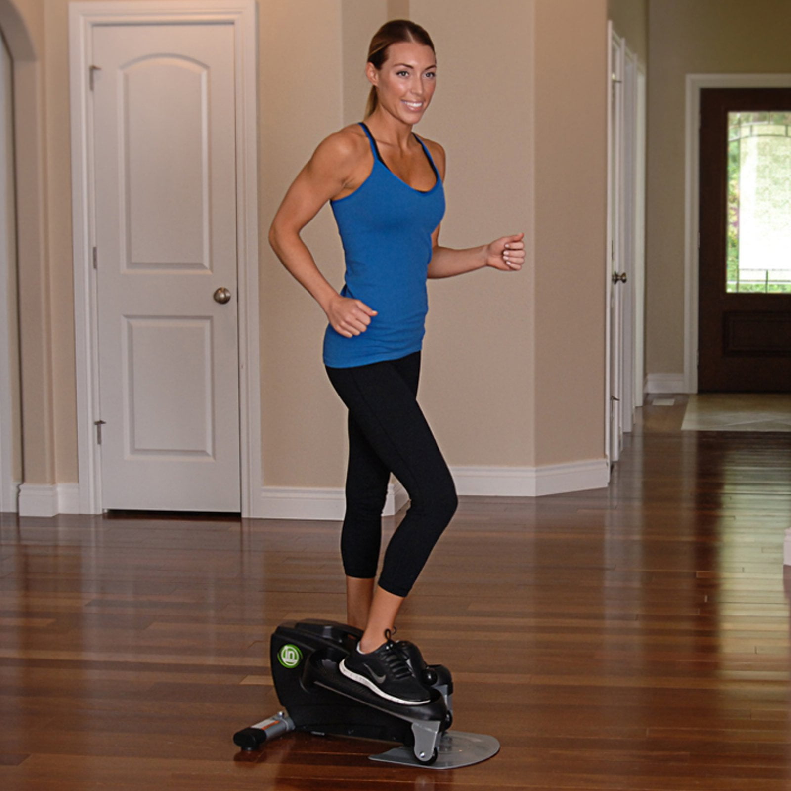 Stamina In Motion Mini Elliptical Trainer for Sitting or Standing, 250 lb. Weight Limit: Use sitting or standing for a low impact cardiovascular workout Elliptical motion provides a low impact workout to reduce stress on your joints Work and tone your lower body while you burn calories Compact design makes it a great option for a home with limited space Adjustable magnetic tension to make the workout more or less challenging Fitness monitor keeps track of distance Large, non-slip pedals Excellent choice for any level of athlete or physical fitness Model# 55-1618 Weight Limit: 250 lbs. Assembled Dimensions: 24.5″ x 17″ x 12″