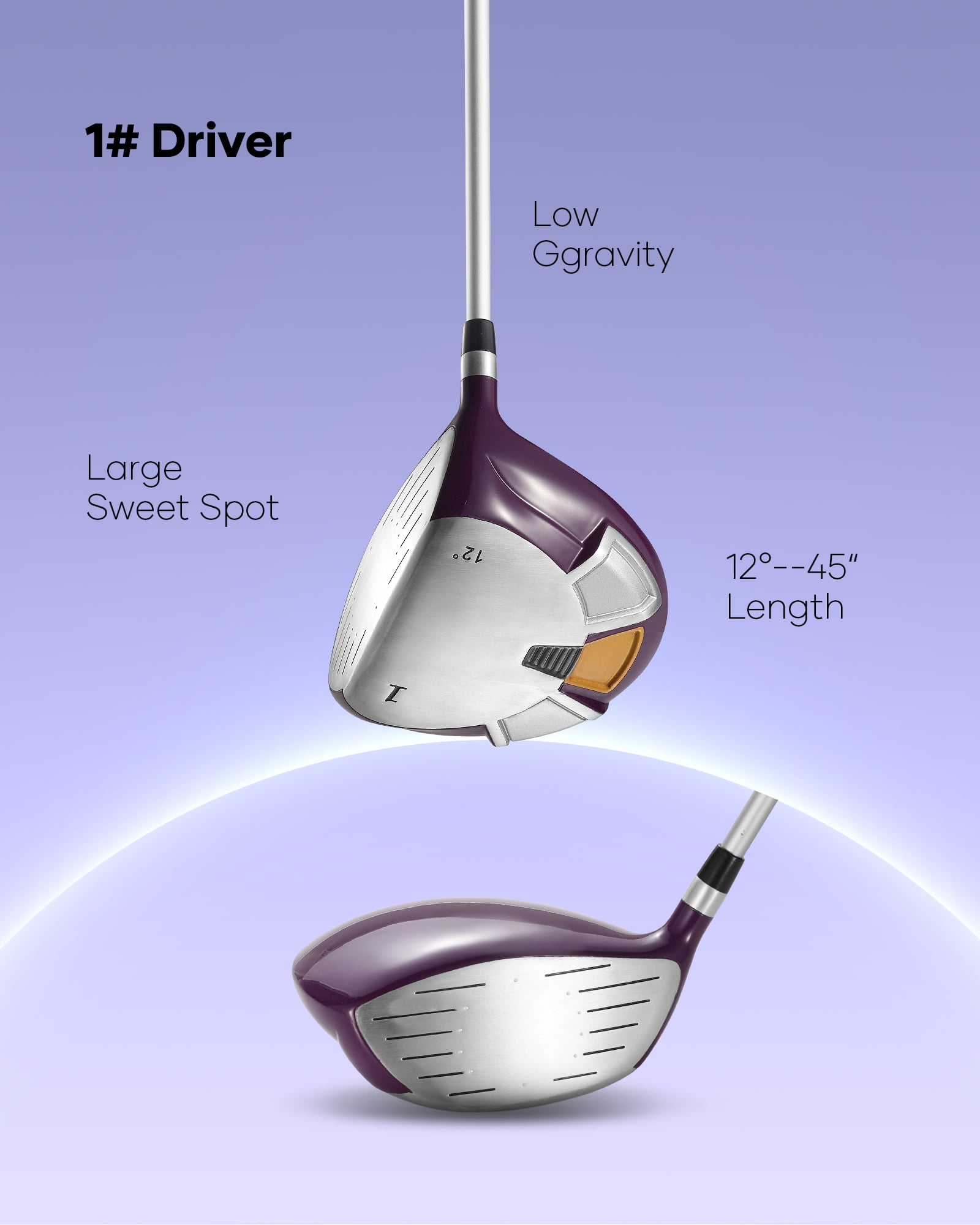 ????Acoustic Structure Technology – The complete golf club sets combination of advanced geometric structure and acoustic design, as well as the back badge made of a variety of materials, can reduce the vibration of complete golf club sets and give golfers a more confident hitting sound and feel. ????Low Barycenter & High Rebound Coefficient – The golf set new grooved hosel with a low barycenter, combined with a thin face with a large rebound coefficient of golf clubs, can provide golfers with a continuous and stable hitting effect. The golf set 360° deep space concave back design of the golf clubs reduces the weight at the top line, redistributes the weight, and lowers the barycenter, while the tuning structure can help absorb vibration. ????New Forging Process – The golf club set forging process of the golf clubs can achieve better pitch and fault tolerance for the club. Under suitable temperature and stress conditions, the forging process increases the density of the material, which greatly increases the hardness and strength of the golf club set, and brings durability in use. ????New Material Structure + Apportioned Counterweight – The shaft of the golf clubs is made of multiple layers of black fiberglass for lighter weight. The complete golf club sets wooden club heads match with aluminum alloy; iron club heads match with stainless steel; and putter clubheads match with titanium alloy to improve stability and fault tolerance professionally and bring a confident experience to golfers. ???? Complete Golf Clubs Set for Male – The 9 golf clubs set are designed for maximum performance right out of the box. The set includes Driver, Fairway, Hybrid, 7 – 9 Iron, PW, Putter, Stand Bag, and 3 Headcovers. Package Included (12 Pieces in Total)Driver- #1 Wood- 10.5°-45“Length- 1PCSFairway- #3 Wood- 15°-43″ Length-1PCSHybrid- #4H Wood- 24°-40″Length-1PCS7 Iron-32°-37″ Length- 1PCS8 Iron-36°-36.5″ Lenth- 1PCS9 Iron-41°-36″ Length-1PCSPW Iron- 45°-35.5” Length-1PCSPutter- 3°-34“ Length- 1PCSHead Covers-3PCSStand Bag- 1PCS