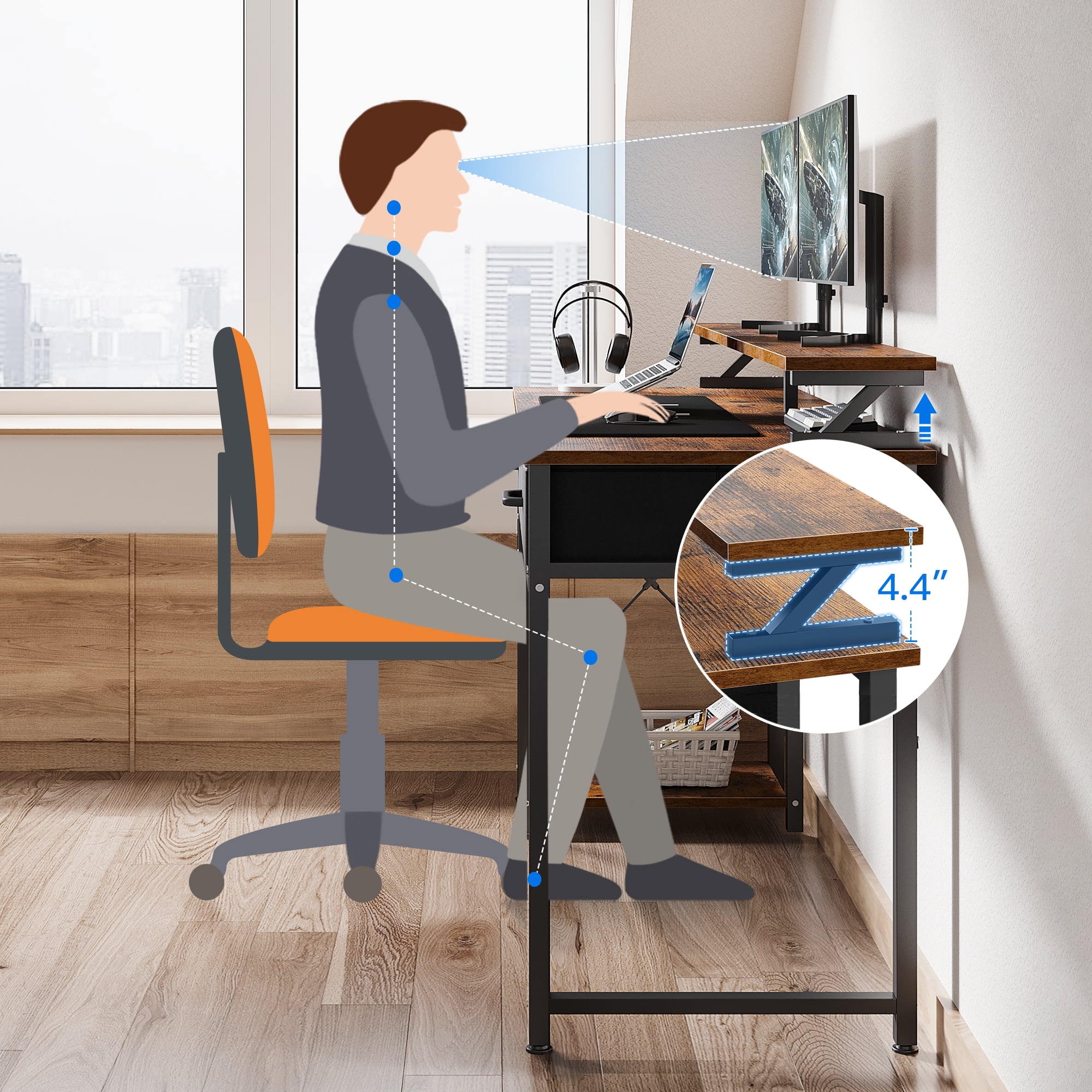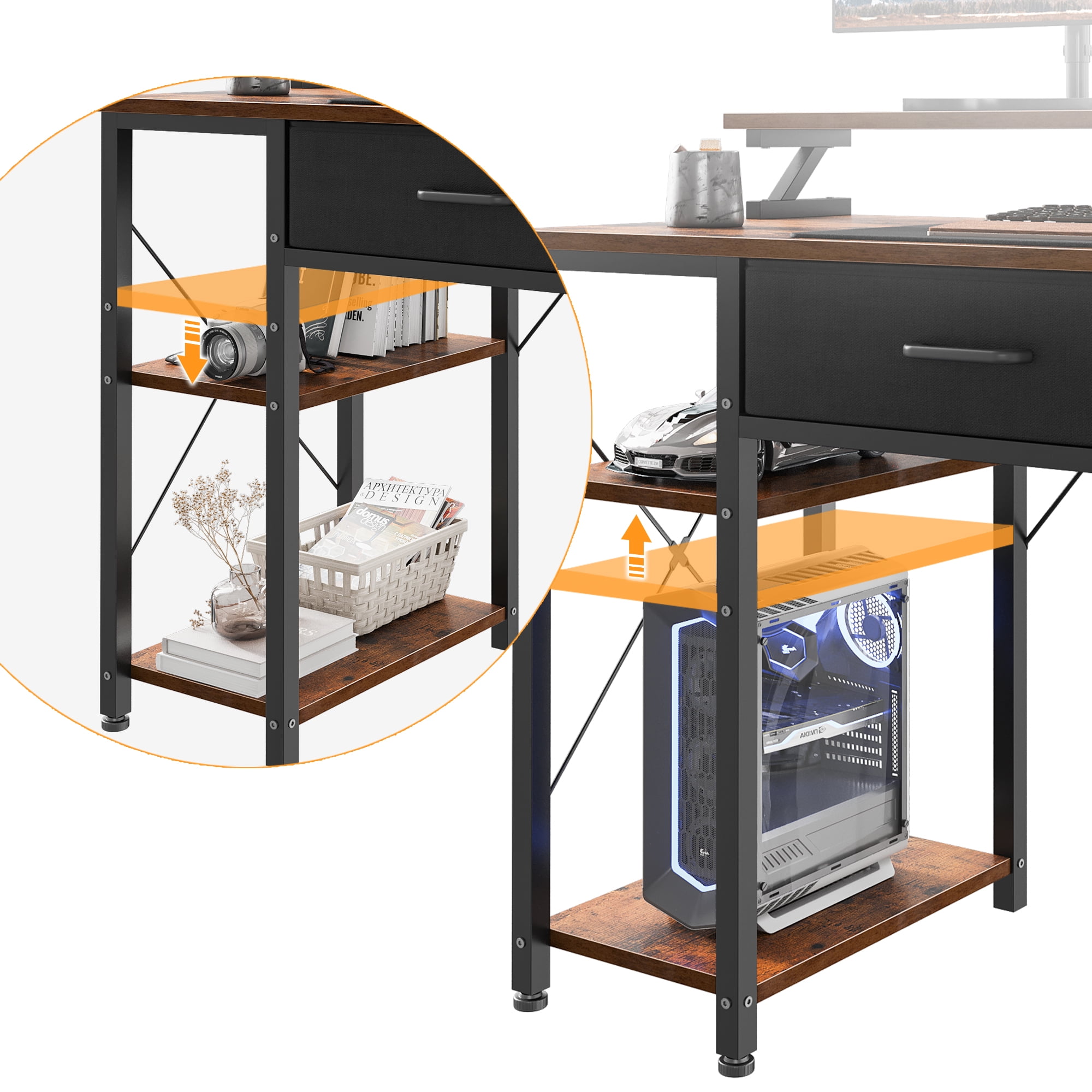 Desk with 2 Fabric Drawers: Two storage drawers provide ample space to store books, files, headphone and other daily necessities; the drawers are made of non-woven fabrics(NOT WOOD DRAWER), its more convenient for assembling compared to traditional wooden drawers, it also can meet your storage needs, using your desktop space more freely. Multi-Functional Monitor Stand: This modern computer desk has an incredible multi-functional monitor stand. The size of this desk monitor stand allows you to have two monitors at the same level. This computer desk with monitor shelf not only allow you to have more storage space on the desktop and raises your screen for improved visibility, but also you can install the monitor stand under the desk to turn this monitor stand into an under table bookshelf. Scratch Resistance Surface: The home office desk top is made of medium-density fiberboard with two layers of a glossy finish which gives a smooth and high-end classic outlook to the work desk and this finish provides a great waterproof surface and scratch resistance. The adjustable footpads on the bottom can keep the desk stable on the uneven floor and prevent you scratch the floor by moving this wood computer desk. Computer Desk For Multifunction: This computer desk is simple but practical that allows you to work, write, and type in a comfortable and organized way. It’s perfect use as a computer desk, office desk, writing table, gaming desk, makeup desk, console table.