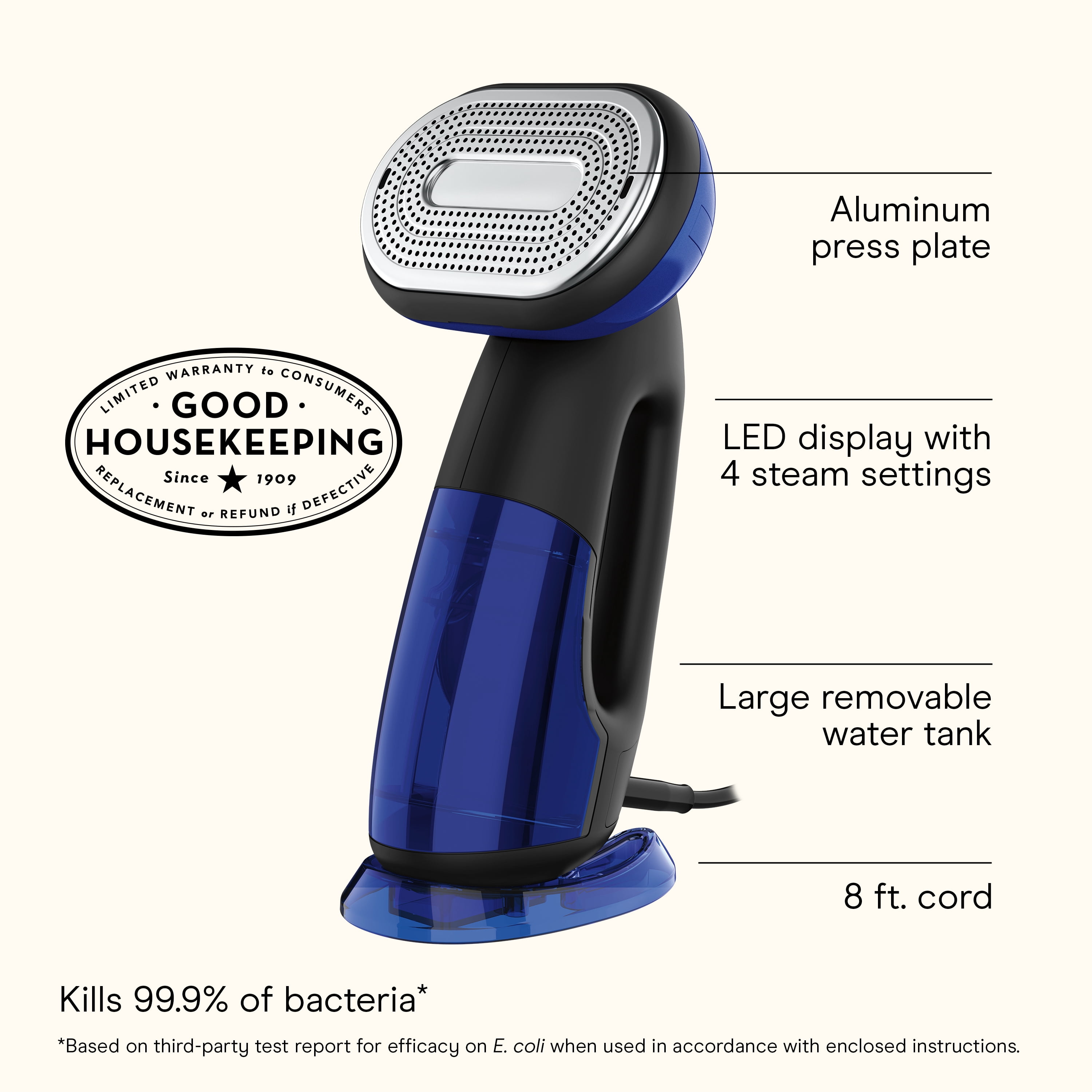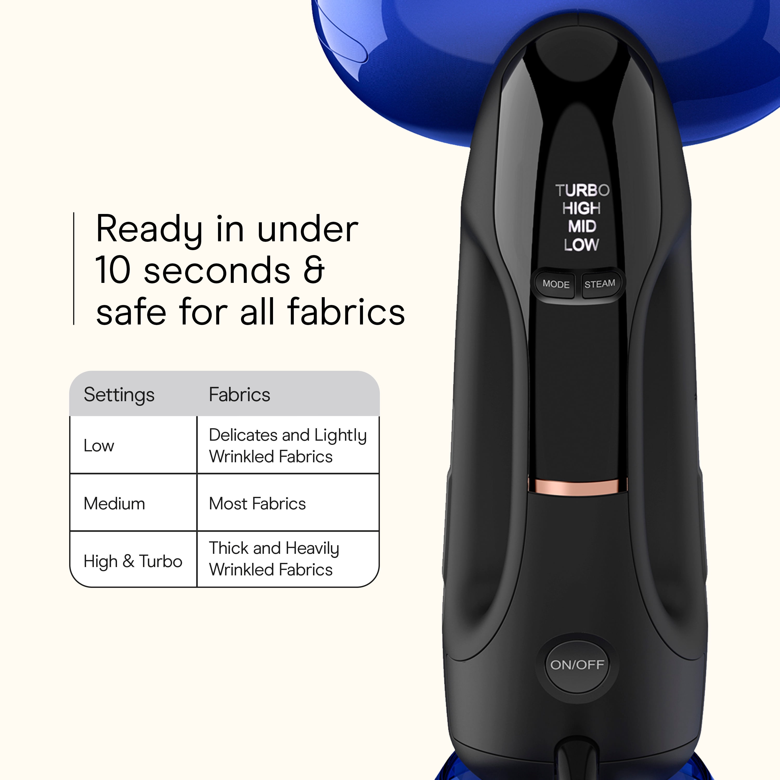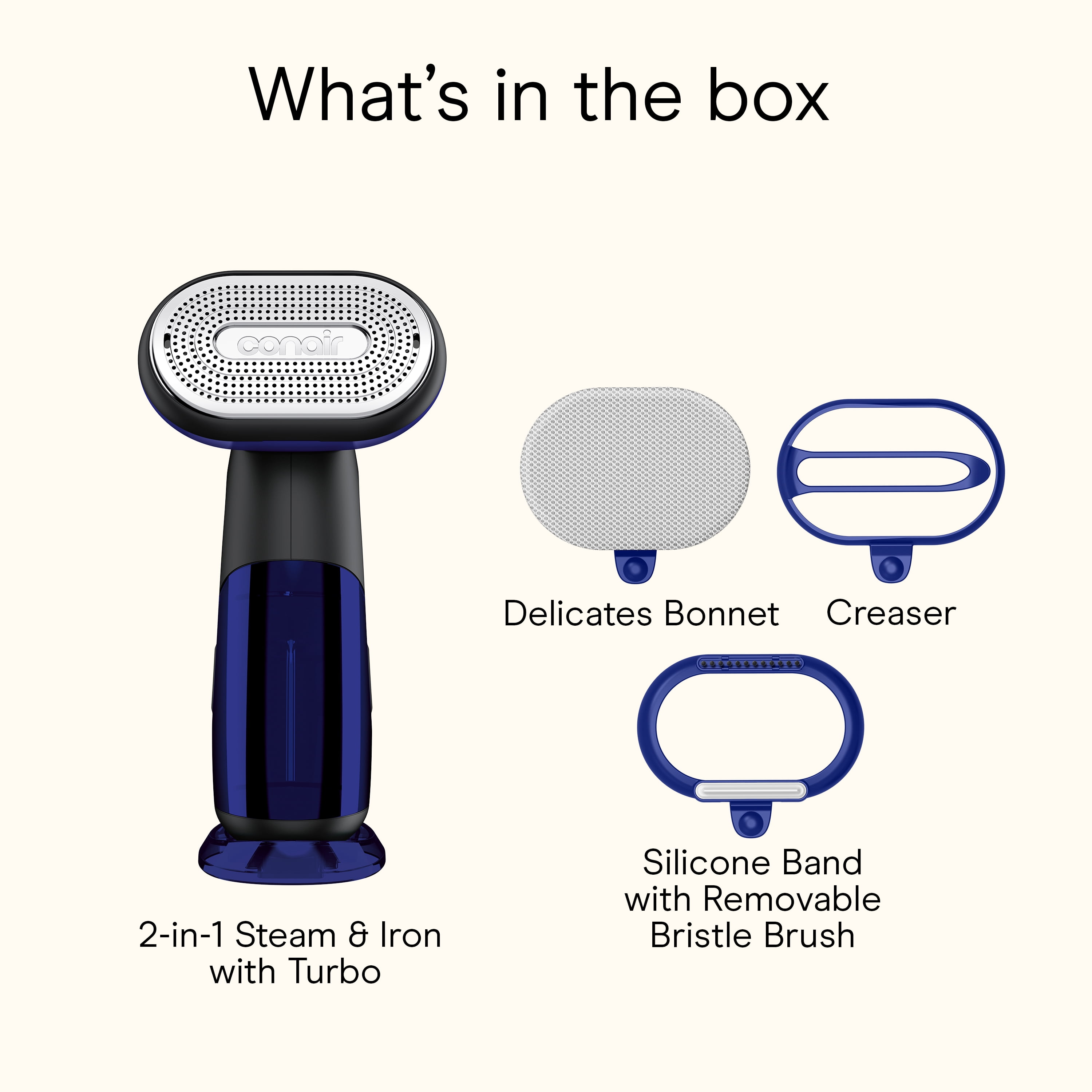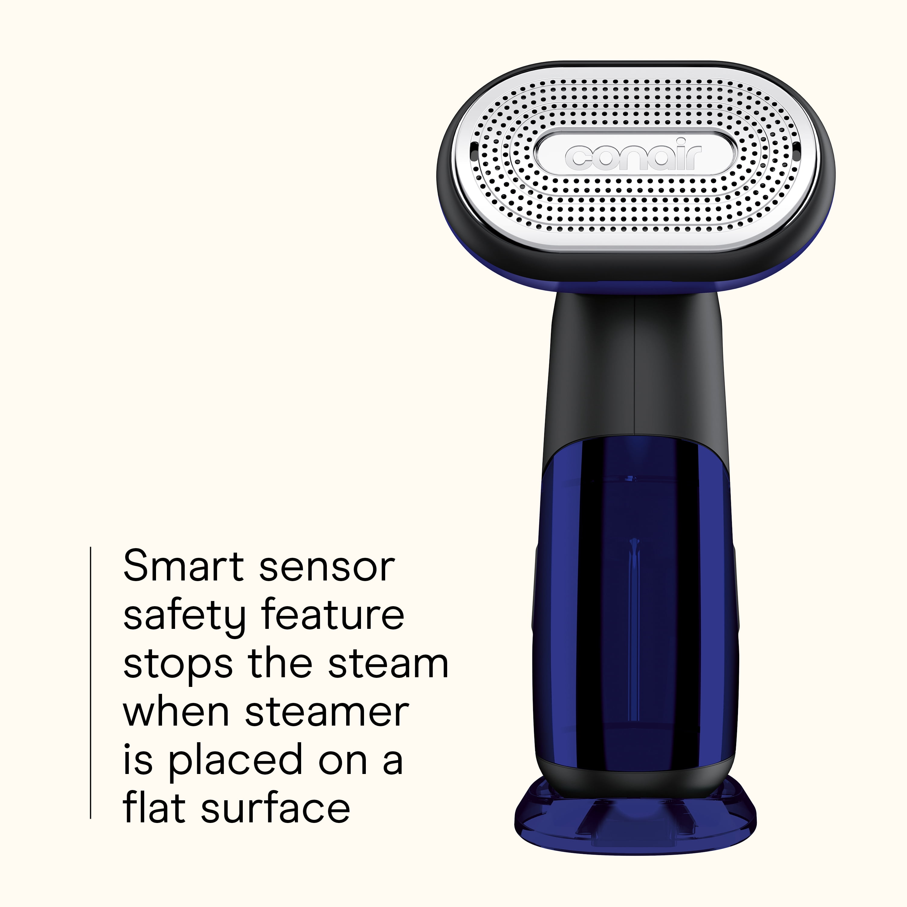 Turbo Handheld Steamer: This 2-in-1 steamer doubles as an iron to quickly and easily release wrinkles. Use vertically as a steamer or horizontally as an iron. Instantly smooth out wrinkles Easy to Use: This freestanding steamer features 4 steam settings, 10-second heat-up & 8.5-ounce water tank for up to 10 minutes of continuous steam. Smart Sensor Safety Feature stops steam when placed on flat surface & starts steaming again when picked up Bonus Accessories: Delicates Bonnet for fine fabrics, Creaser for perfect pleats & folds, 2-in-1 Silicone Band + Bristle Brush: Silicone Band pulls fabrics taut for better results and Bristle Brush ensures steam penetrates fibers even on heavy fabrics Conair Fabric Steamers: Our garment steamers have earned the Good Housekeeping Seal and keep your clothing, upholstery, curtains and other home fabrics smooth and fresh. Check out entire line including handheld, upright and travel steamers Innovative Garment Care: From fabric shavers and traditional irons to garment steamers, both handheld and full size, we make high-quality garment care accessories