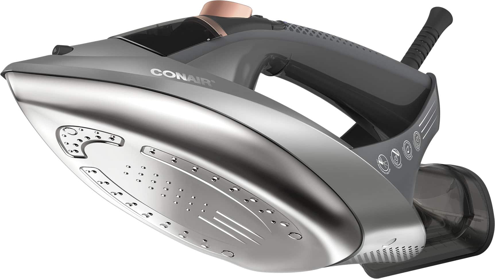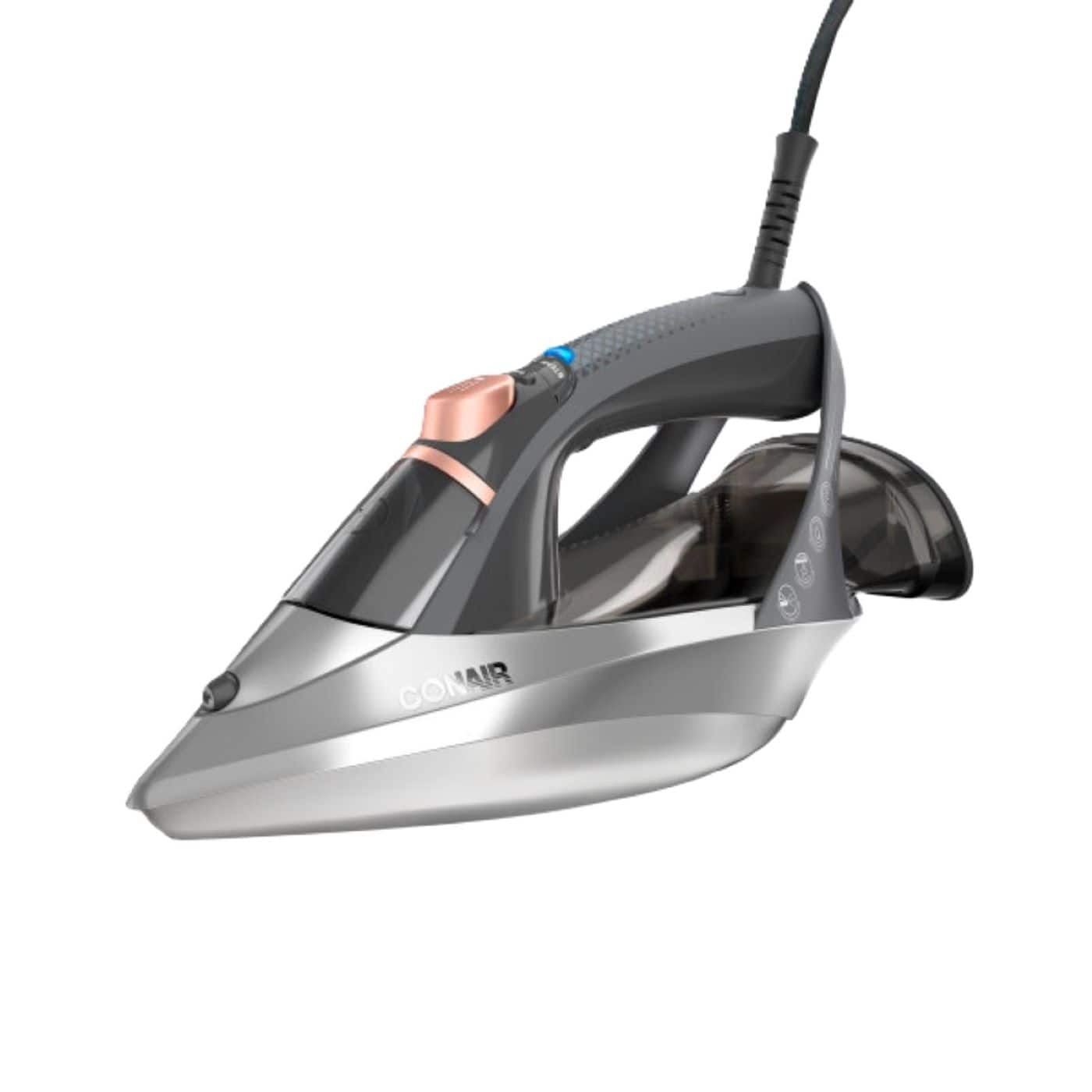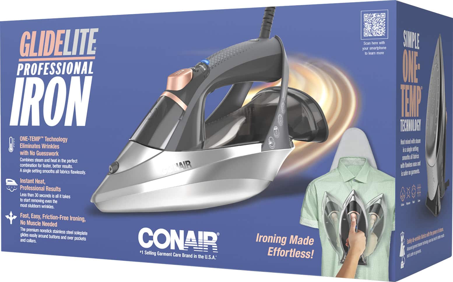 Safely de-wrinkle fabrics with advanced garment steamer technology in a single-setting iron. The GlideLite Professional Iron by Conair combines steam power with less heat to achieve superior smoothing quickly and more easily, so you look perfectly pressed without any stress. ONE-TEMP technology provides a single heat setting that smooths all fabrics safely and effectively. With its premium nonstick stainless steel soleplate, you can iron over collars and pockets and between buttons with 360° maneuverability. Fill the water tank and in 30 seconds the water is heated and ready to remove the most stubborn wrinkles. Choose from regular and turbo steam options. Less heat and more steam is safer on cotton, polyester, wool, and linen garments. Features a self-clean button, spray button, and a flexible power cord for easy navigating. For ironing made effortless, press on with the GlideLite Professional Iron by Conair.