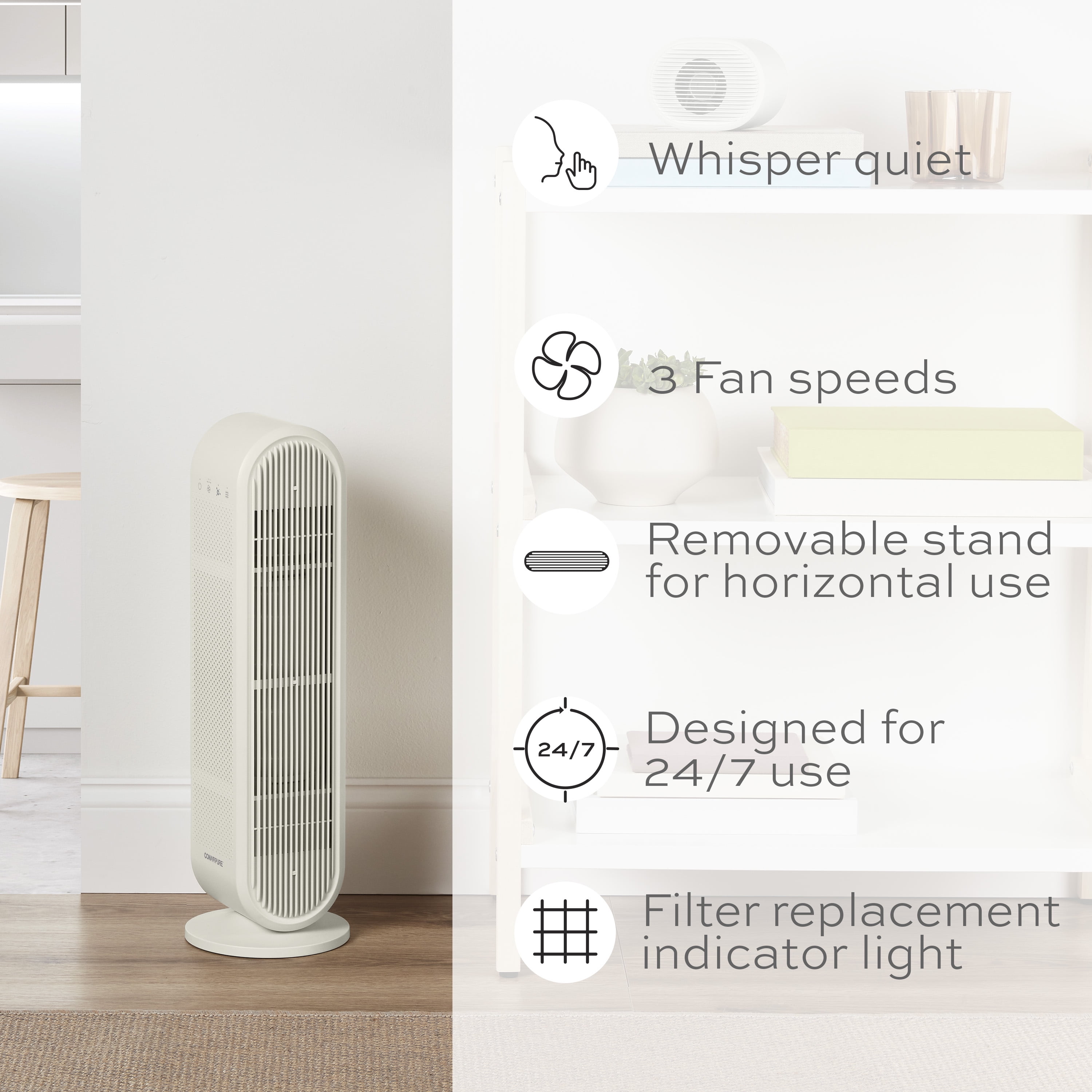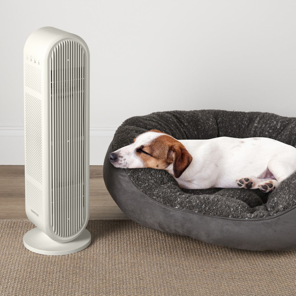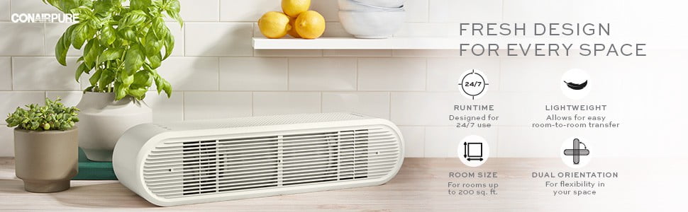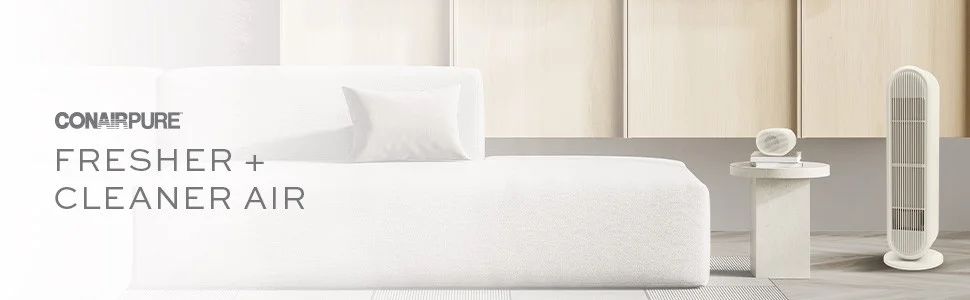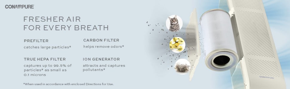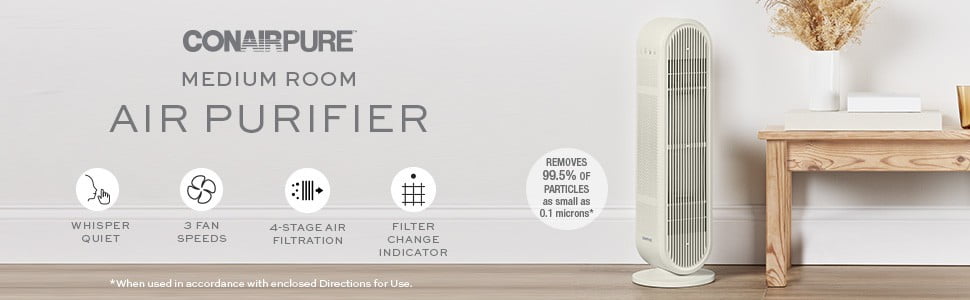Four-Stage Filtration System: Prefilter catches large particles, activated carbon filter helps removes odors, true HEPA filter removes up to 99.5% of particles as small as 0.1 microns, positive and negative ion generator attracts and captures pollutants in the air (when used in accordance with enclosed Directions for Use). Fresh Air: Captures dust and dirt, volatile organic compounds, smoke, pet dander, and pollen. Quiet Operation: BLDC motor has 3 fan speeds Slender Profile: Blends into every decor with thin design and neutral color. Replace Filter Indicator: Lights up when filter needs to be replaced. Dual Position Design: Use upright with included stand or lay it flat on its side. Cycles air up to 200 sq. ft 2x every hour (ACH): Perfect for bedrooms, playrooms, living spaces, offices. Easy Filter Replacements: Join the ConairPure™ Community and register for replacement filter reminders and special offers at register.conair.com.