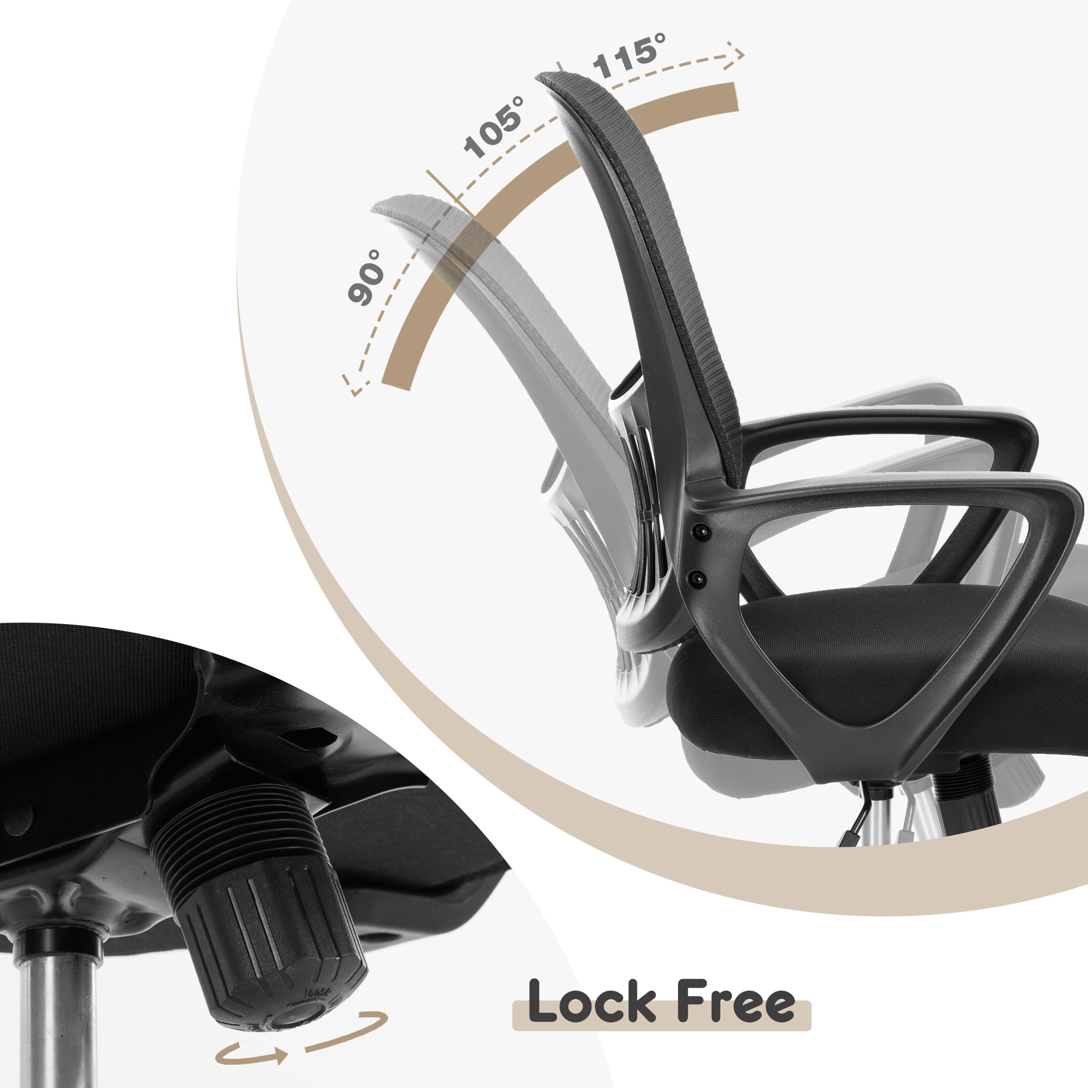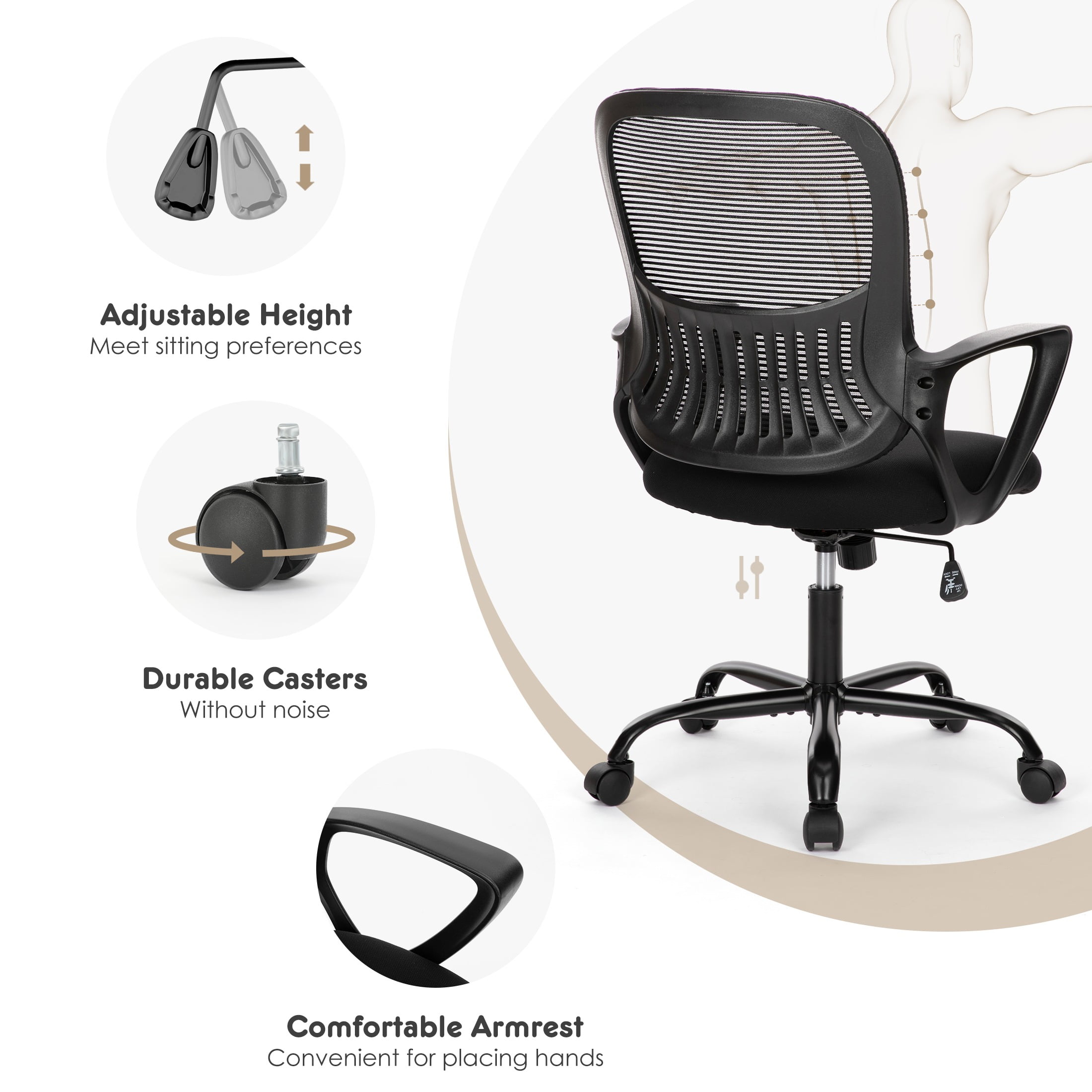 【Ergonomic Office Chair】Provides good lumbar support. The widened backrest is designed to fully conform to your back, providing stable support for your spine. Using a swivel chair helps maintain the natural curvature of your spine, corrects your posture, and makes long periods of sitting less tiring. 【Stylish and Comfortable】This office chair comes in three classic colors – black, grey, and pink – for you to choose from. The mesh design allows for breathability and dryness, while the seat cushion is made of high-quality sponge. With a moderate softness and comfortable sitting experience. 【Adjustable Functions】With the adjustment lever underneath the seat, the seat height of the office chair can be easily adjusted between 47cm and 57cm. This allows you to adjust the height according to different body types and different desks from a kid to an adult. 【Sturdy and Durable】The computer chair features a large five-star base, which is very stable and durable, with a maximum weight capacity of up to 250lbs. For users with a larger body size, there is no need to worry about the product’s lifespan under heavy weight. 【Easy to Install】Simply follow the instructions or installation video to enjoy this stylish and comfortable office chair!
