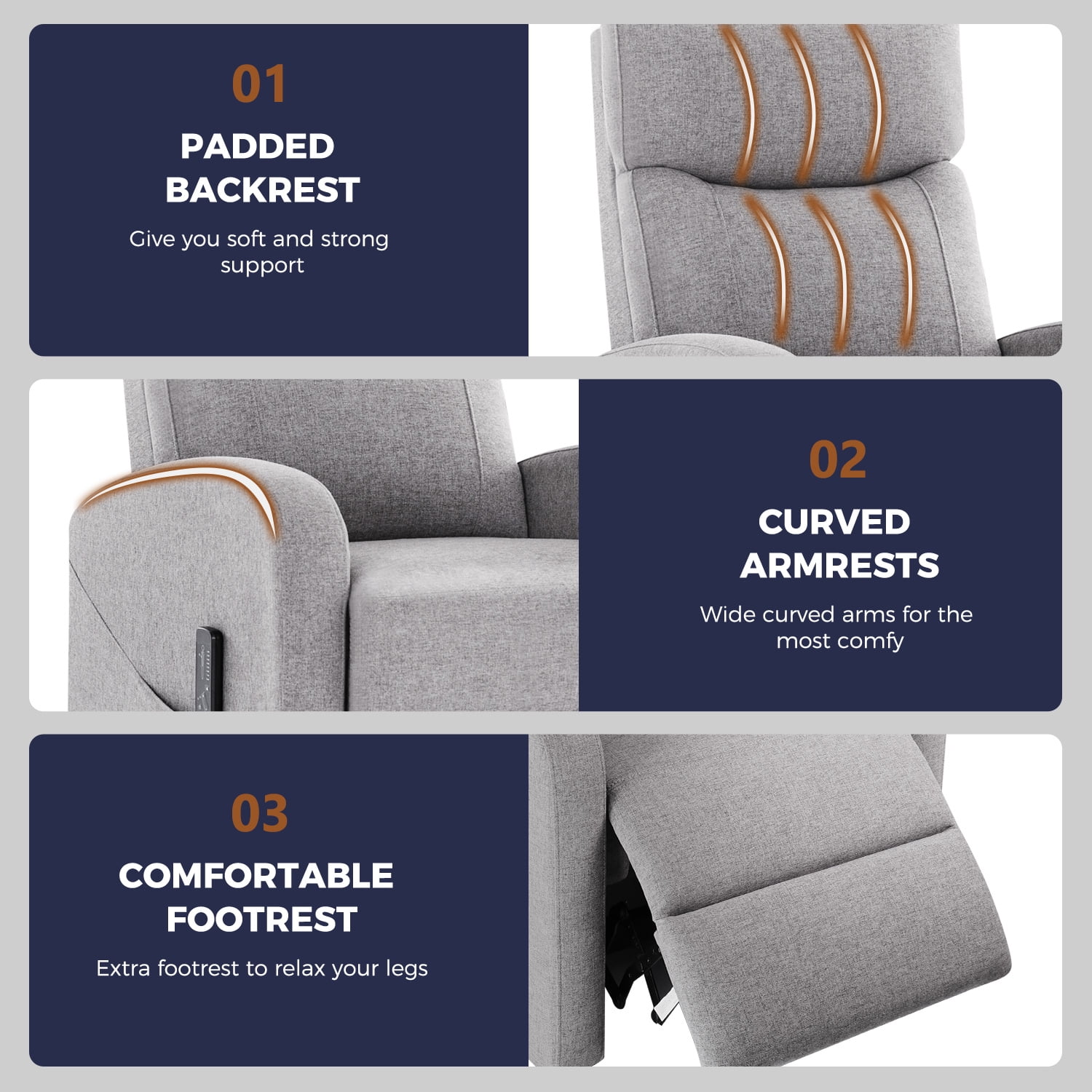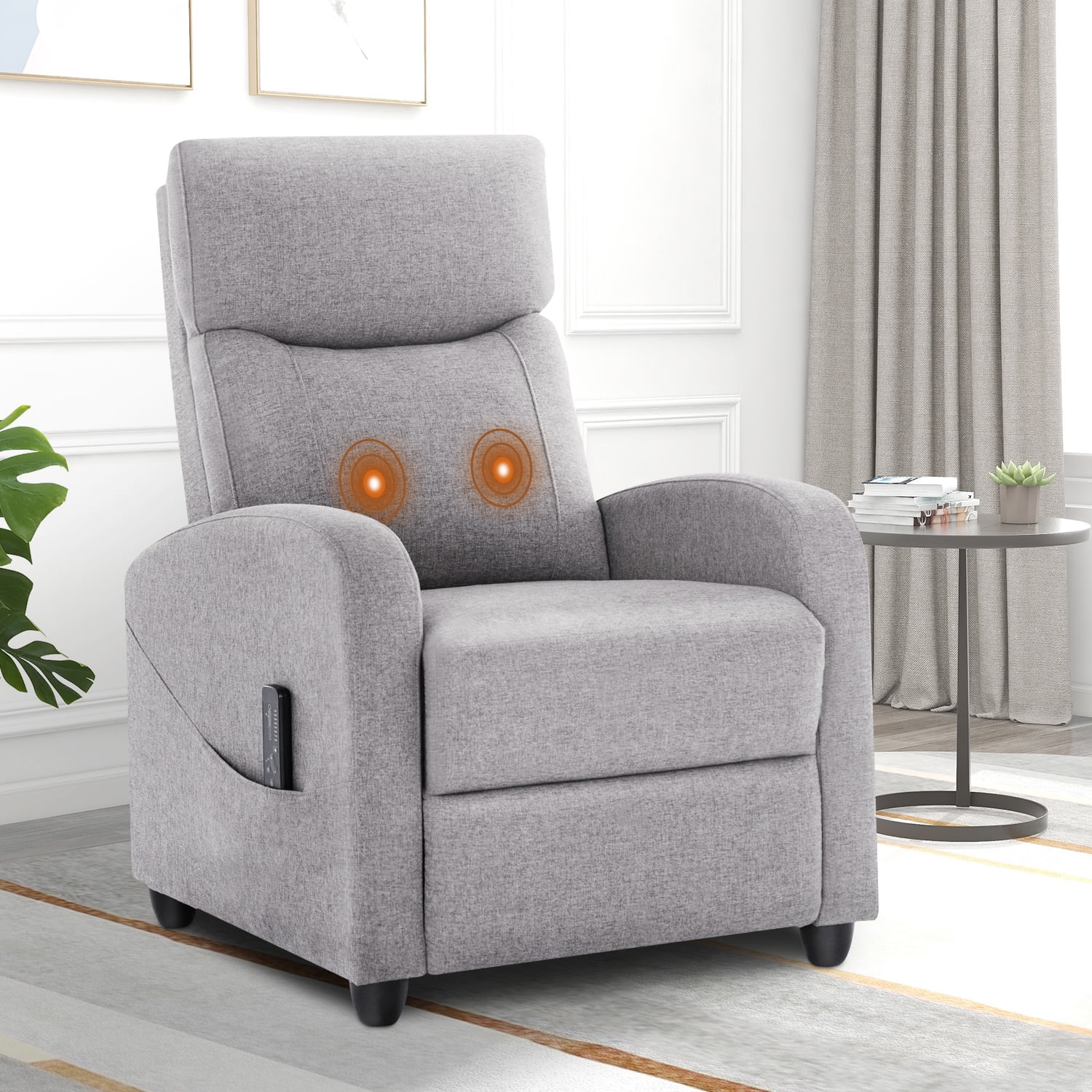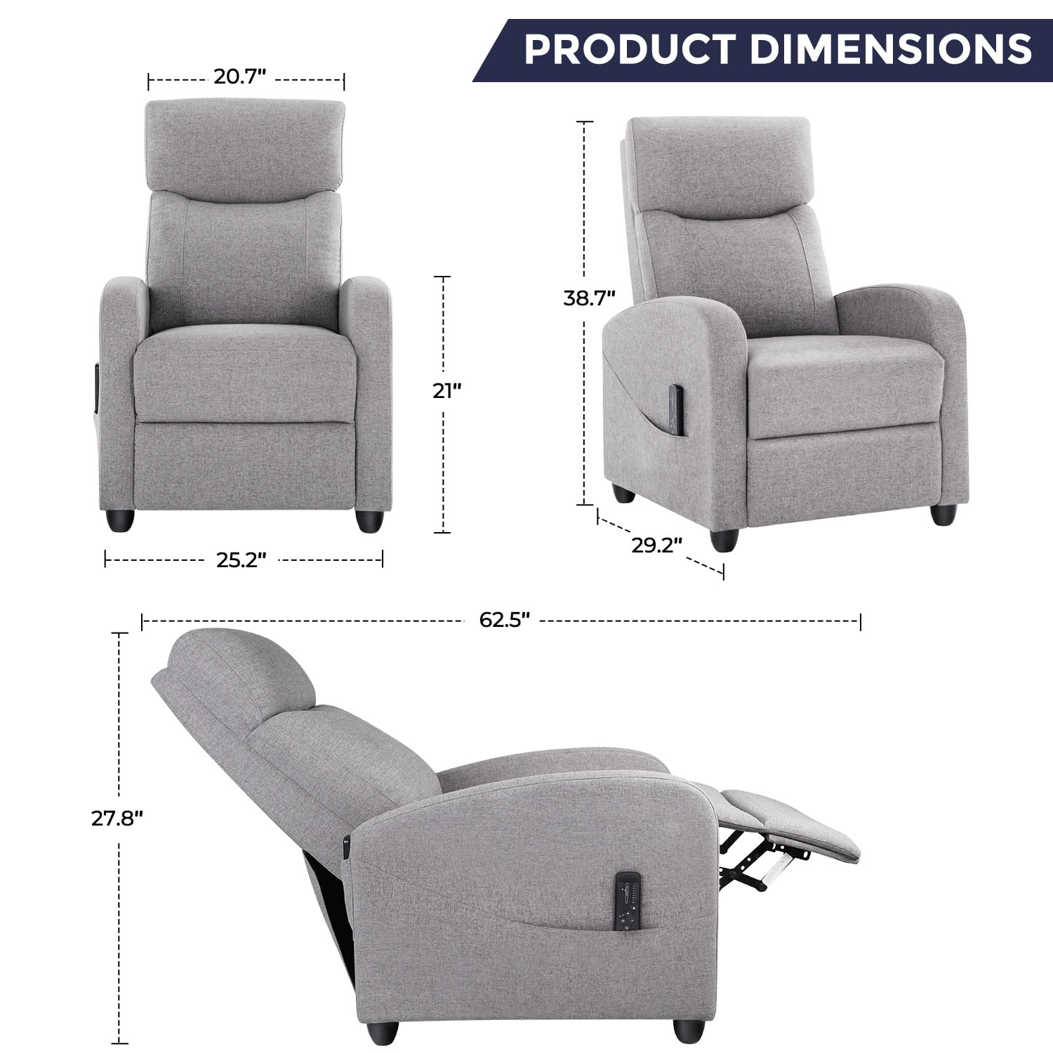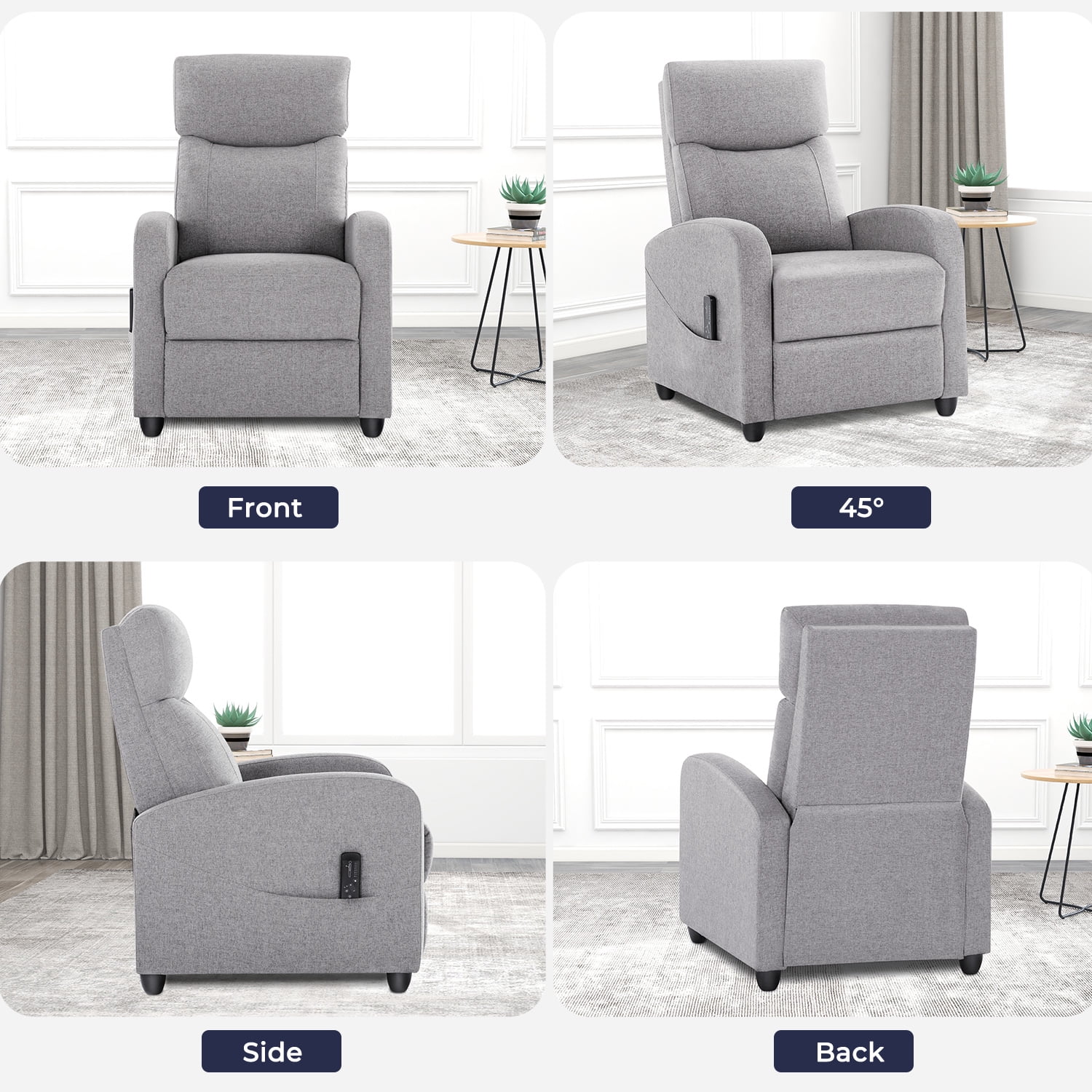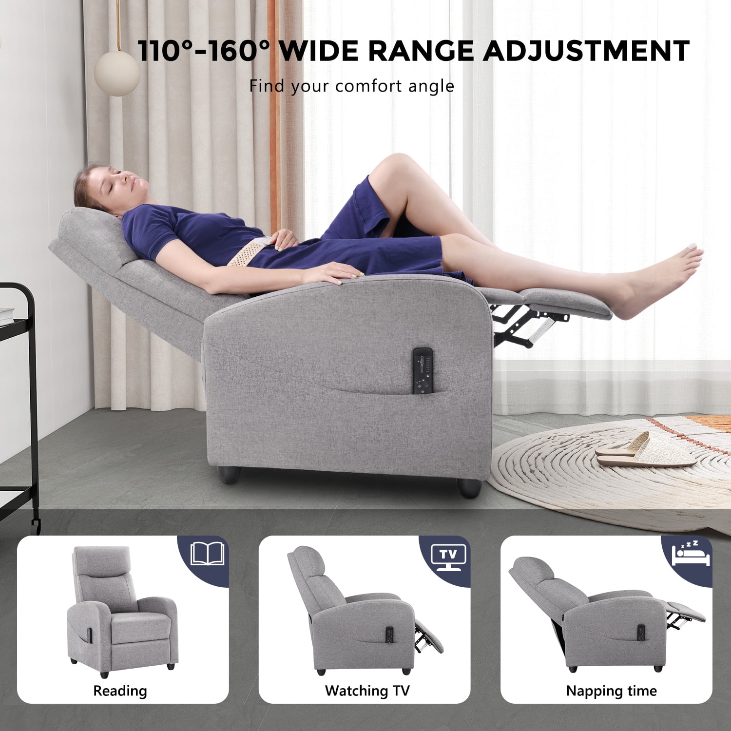 【Adjustable Reclining Comfort】Effortlessly switch between 90° and 160° reclining positions to suit your needs, whether it’s sitting upright, lounging with your feet up, or lying flat for ultimate relaxation. The dual foot extension and reclining back design ensure a personalized and comfortable experience, making it perfect for various activities like reading, napping, or watching TV. 【Comprehensive Massage Functionality】Indulge in a full-body relaxation experience with 8 unique massage modes, 2 vibration settings, and adjustable intensity. The built-in lumbar massage zone enhances your comfort, delivering targeted relief. Easily control the massage functions with the included remote for an ideal 15-minute relaxation session. 【Premium Quality for Maximum Comfort】Crafted with high-quality fabrics and filled with a high-resilience sponge, this recliner offers superior comfort and breathability. The sturdy hardwood frame ensures long-lasting durability and reliable stability, while the ergonomic design provides fatigue-free sitting even for extended periods. 【Enhanced Footrest & Versatile Design】The upgraded footrest offers unparalleled relaxation, making it ideal for unwinding after a long day. Perfect as a cozy addition to your home or as a stylish furnishing for commercial spaces like lounges and theaters, this recliner chair supports up to 275 lbs, combining comfort with versatility. 【Quick Assembly & Reliable Support】Enjoy stress-free setup in just 5 minutes with this recliner chair. The package includes all necessary tools and instructions for easy assembly. For any issues or concerns, our dedicated customer service team is ready to provide prompt assistance.