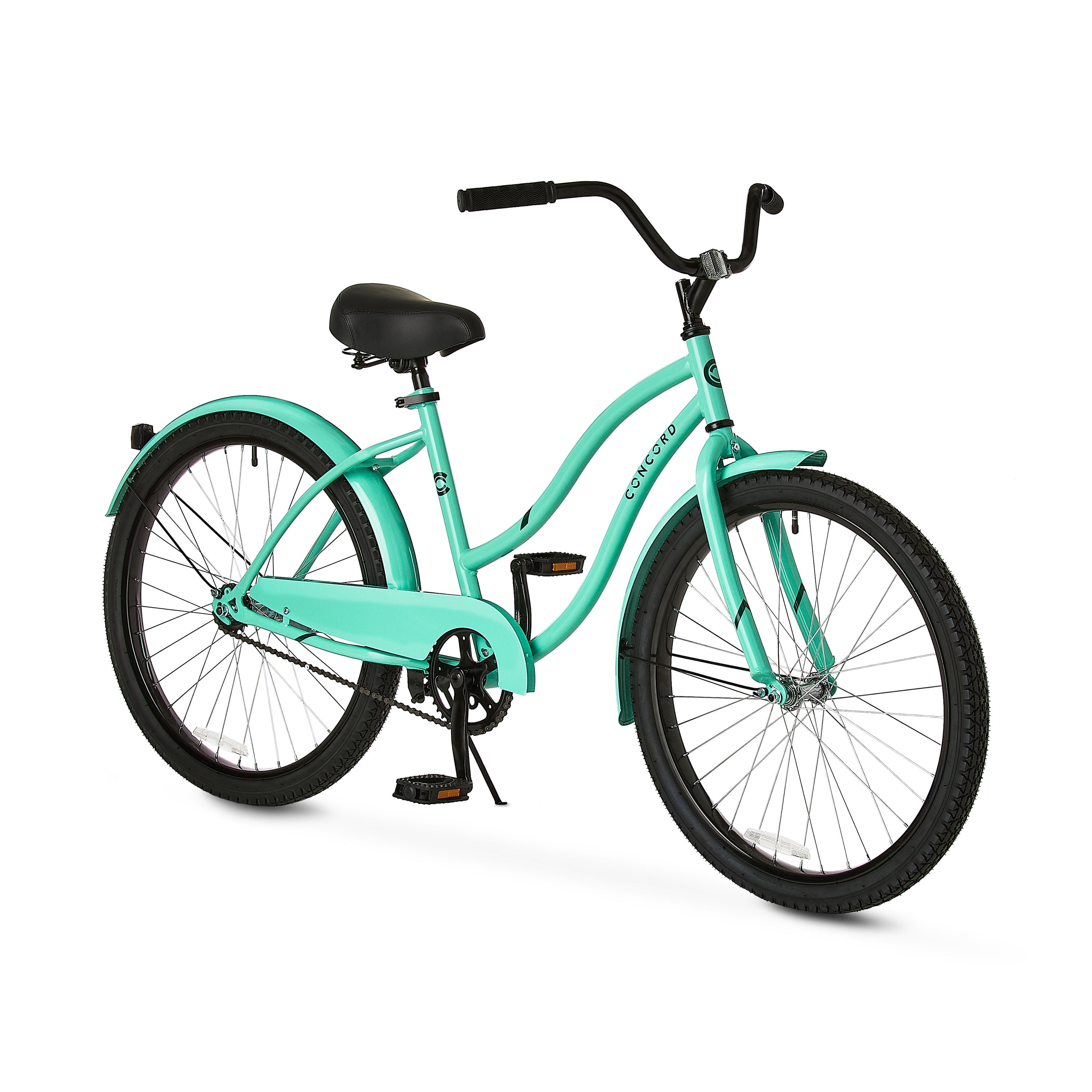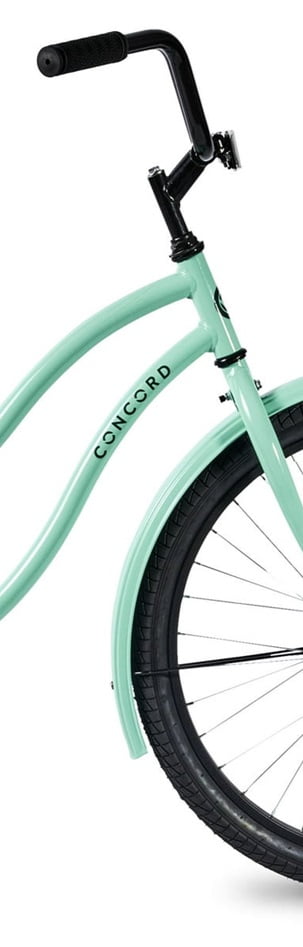 This 24-inch Concord Pacifica cruiser bike for girls offers comfort and style in a sleek package. The pastel green steel frame is simple, yet stylish without sacrificing durability. The padded spring saddle is slightly reclined, with a lower center of gravity, and the raised handlebar lets you ride in a more upright position that’s easier on your back, neck, and legs. With full leg extension while pedaling and the ability to place both feet flat on the ground when stopped, this bike provides excellent balance and control. The coaster brake offers easy stopping, and fenders keep splashes at bay. Dual-density grips and pedals add extra comfort. Cruise on to wherever life takes you next on the Concord Pacifica cruiser. Ideal for ages 12 to 19 years old.