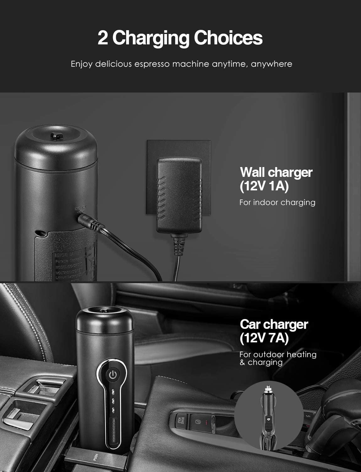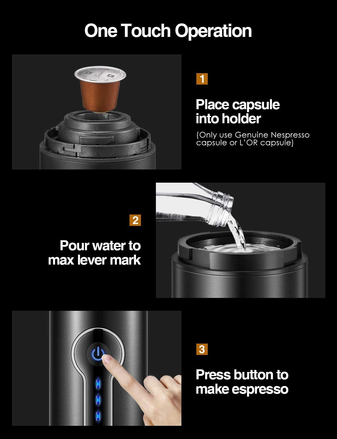 ***Please read the instruction manual before using the coffee machine. ***This machine is only compatible with Nespresso original capsules and Starbucks espresso capsules, using other capsules or repeatable capsules may not be compatible or damage the machine. ***If you have any questions while using it, please feel free to contact us. We will help you within 24 hours. 【Electric brewing espresso】Electric Portable Espresso Machine:when using hot water, after pressing the button for 5 seconds, you can get the aromatic coffee. When using cold water, press the button for 2 seconds to start heating and enjoy coffee in about 8 to 12 minutes.Up to 15 bar high-pressure pump allows for a barista-style result, unlocking the delicate flavor and premium aromas of coffee capsule during the brewing process. Espresso volume is always around 45ml/1.5oz per cup. 【Travel espresso machine】Self heating and automatically pumps for you, you can enjoy espresso coffee anywhere. Portable Espresso Maker can be placed in easily in a cup holder or bottle holder in a backpack which can save the space of the backpack, so it will be your perfect partner when traveling, camping, hiking,etc. To reduce the fatigue of the journey. 【About charging & heating】Portable Espresso Maker has quipped with a Car charger(12V 7A) for heating&charging in outdoors, and home charger(12V 2A) for charging inside. 【Easy to use and clean】Portable Espresso Maker is fully automatic. Only just need to wash the coffee cup, simply press the switch button for 5s to run the machine without capsules, it will auto wash, more simple and convenient. 【About capsule compatibility 】Genuine Original Line Nespresso Capsules & Starbucks capsules Only,it is designed and tested for Nespresso capsules (it does not work with Nespresso compatible capsule). And if you have any questions or concerns,please contact us immediately.