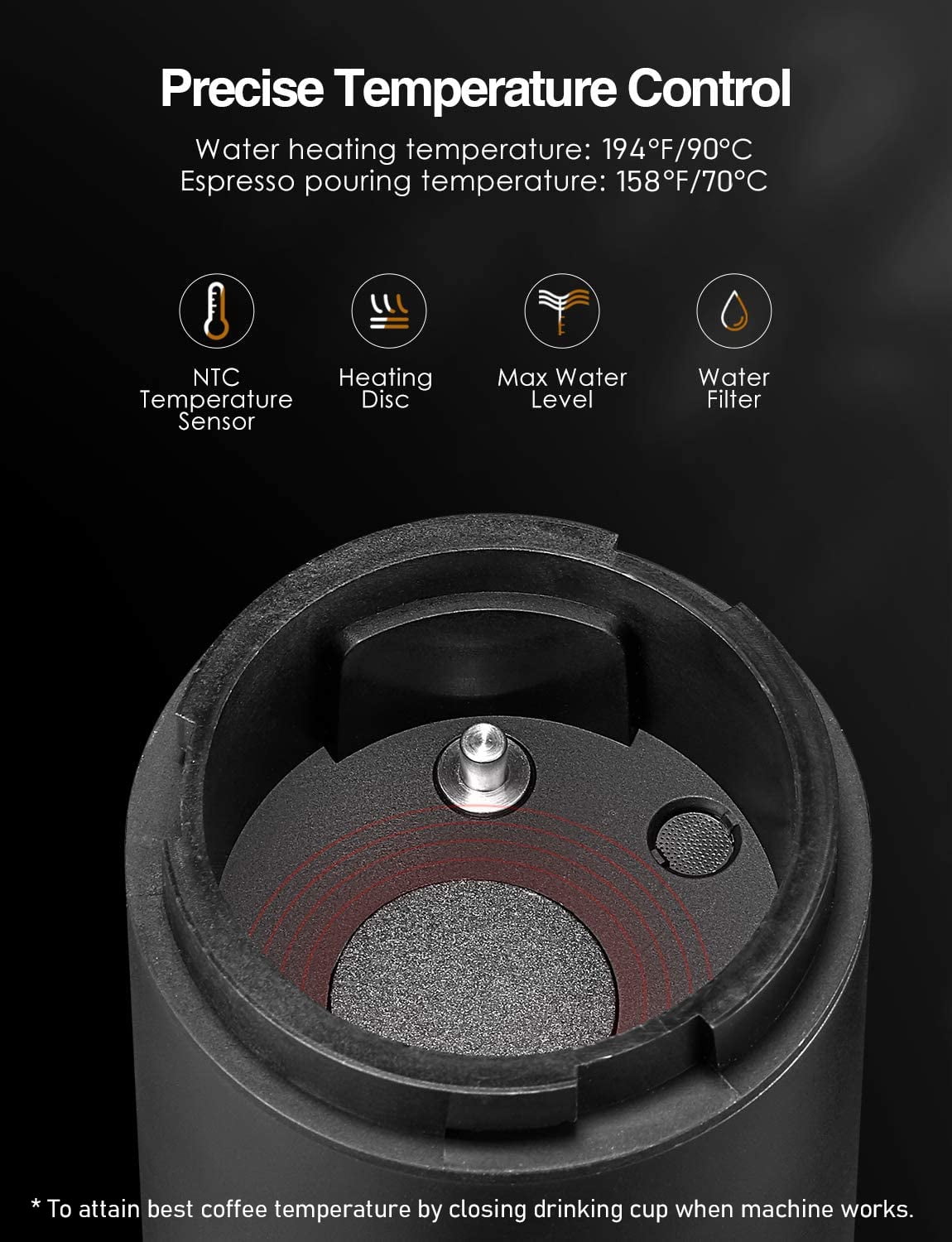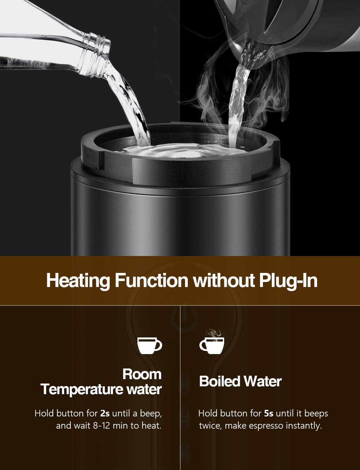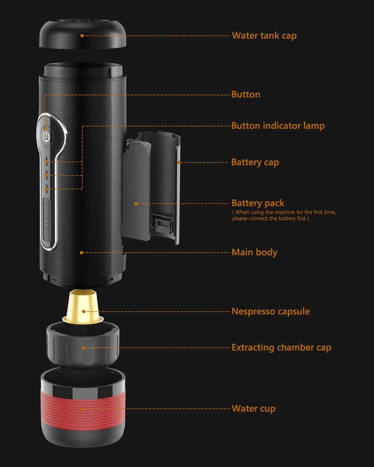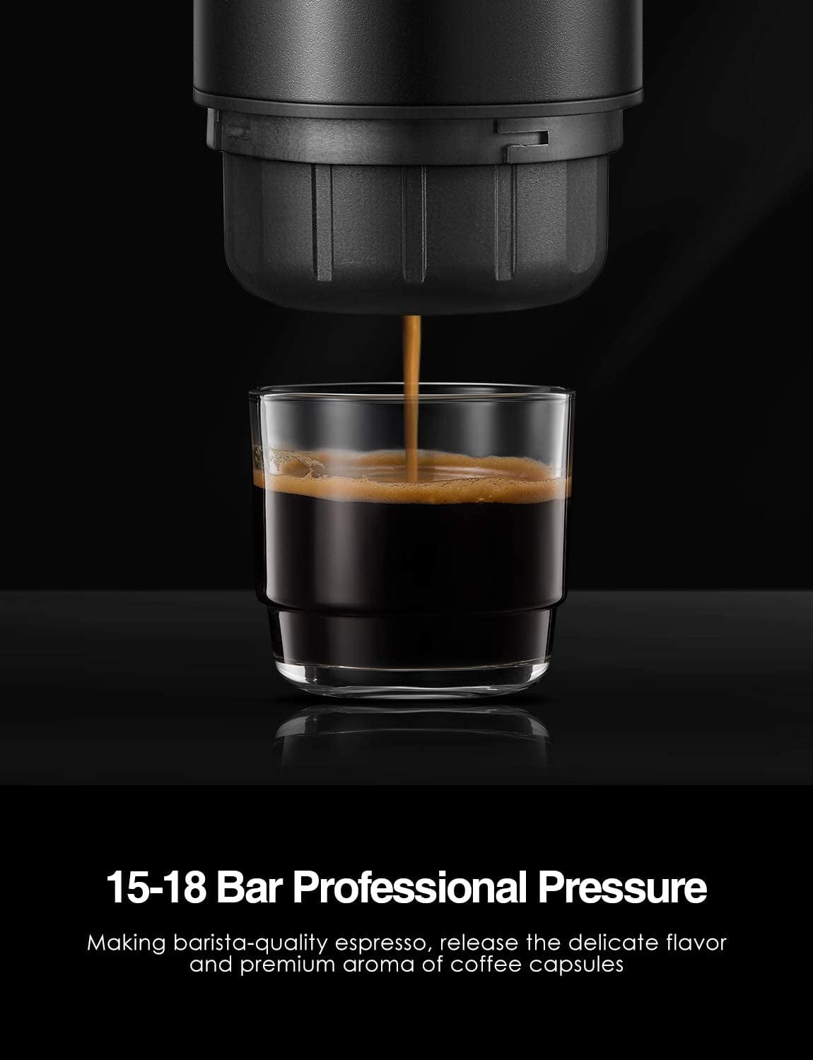 CONQUECO Portable 20 Bar, 1-Cup Black Travel Espresso Machine Built-in battery allows you to brew coffee anytime, even in remote locations In-vehicle coffee room: Connect the included 12V charger to heat the coffee machine independently, eliminating wait time for battery charging 15 Bar pressure extracts the delicate flavors and premium aromas from coffee capsules for a rich espresso experience Heating function: No need for bulky kettles; just add water and let the CONQUECO coffee maker do the work for a hot espresso Compact size fits most car cup holders, making it an ideal travel companion without taking up suitcase space