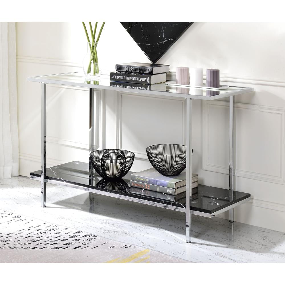 Rectangular Table Top Bottom Faux Marble Shelf Mirrored Top metal framM Chrome finish Square-straight metal legs
