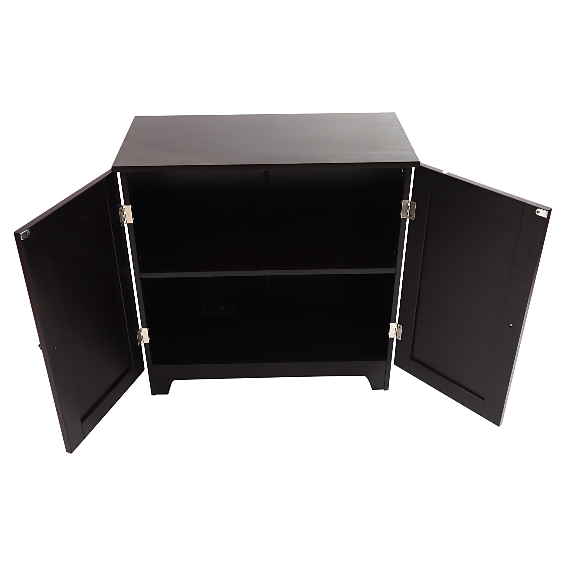 Contemporary Country Double Door Cabinet: The bathroom door cabinet has a stylish look Plenty of room inside for placing various items such as bath towels, washcloths, and more Made from high-quality MDF for a long life Has a semi-gloss finish Goes nicely with many other items, such as a wastebasket and shower curtain Available in different colors, including Espresso, white