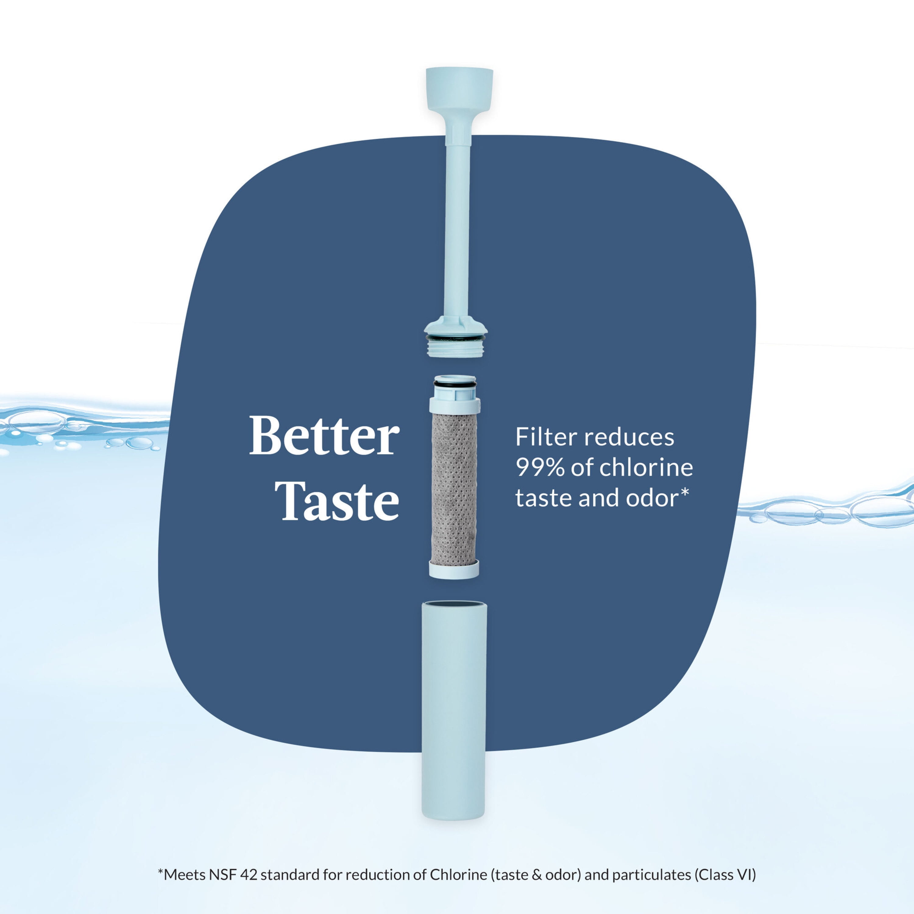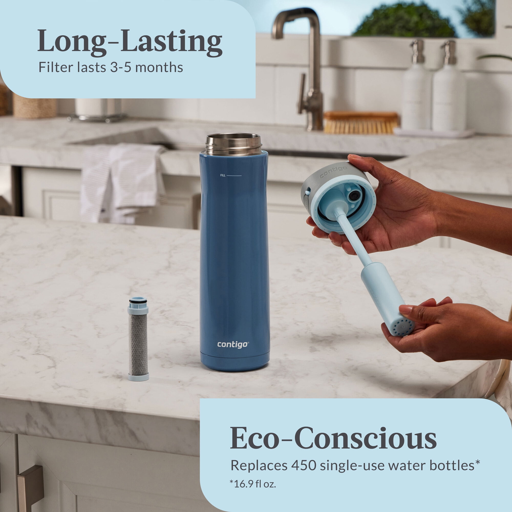 Carbon fiber filter technology reduces 99% of chlorine taste and odor for better-tasting water* Long-lasting filter lasts 3-5 months (60 gallons); replaces 450 (16.9 fl. oz.) single use water bottles No-leak AUTOSPOUT® lid spout pops up for easy drinking from the straw; seals with straw down for no spills Stainless steel body keeps drinks cold all day Button lock to prevent accidental opening Angled straw for easy sipping Lid and body are dishwasher-safe; rinse filter with water only Fits most car cup holders Meets NSF 42 standard for reduction of Chlorine (taste & odor) and particulates (Class VI)