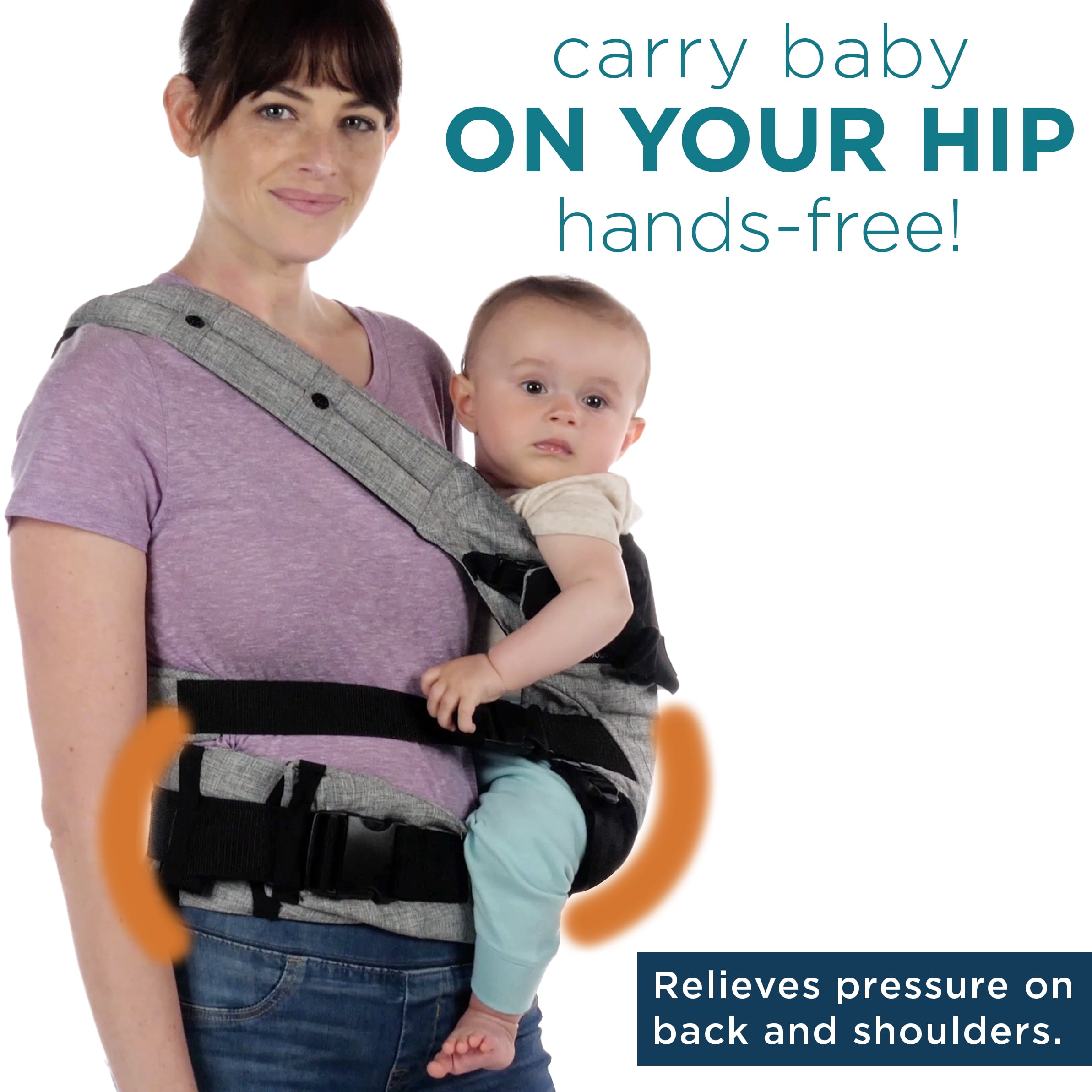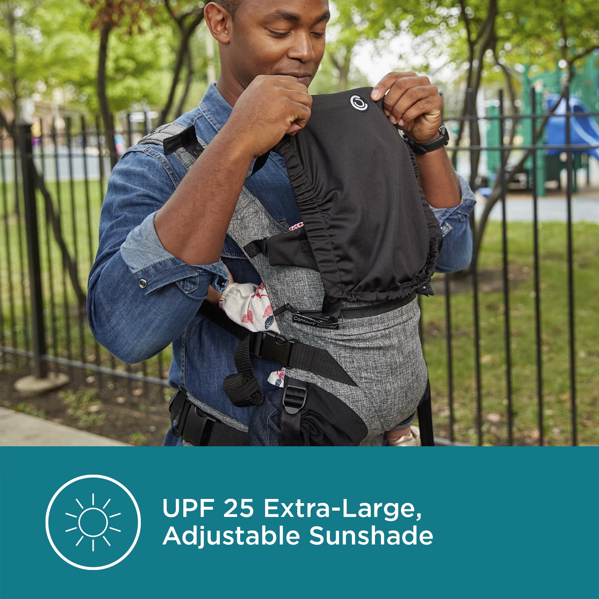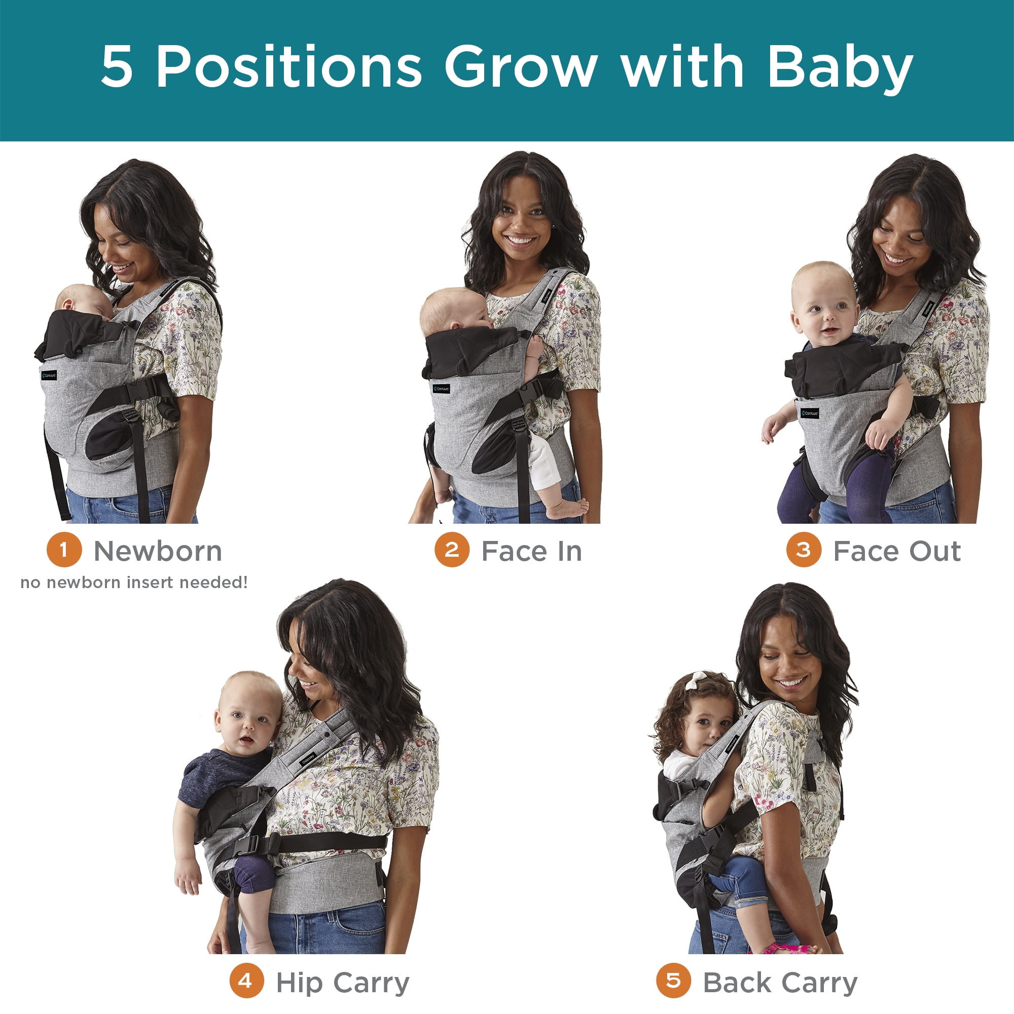 GROWS-WITH-BABY 5 CARRYING POSITIONS: carrying positions to adapt and grow with baby from 8-45 lb: Newborn, Facing In, Facing Out, Hip, and Back. Hip-healthy design supports baby’s hips and legs in a supportive position, and follow the recommendations of the International Hip Dysplasia Institute. EASY TO WEAR & LIGHTWEIGHT: Padded, comfy shoulder straps and waistband distribute baby’s weight for a comfortable carrying position ONE SIZE FITS MOST: Fits Petite to XL so both parents can share the same baby carrier and the shoulder straps can be worn crossed or backpack style for a customizable fit MACHINE WASHABLE: Cleanups are a breeze, simply machine wash for easy cleanings FITS BABY 8-45 LB: No separate infant insert is required for your newborn (8 lb). All carry positions available right out of the box. HIP-HEALTHY M-Position for baby supports their legs and hips in a natural position for baby’s development 3 ZIPPERED STORAGE POCKETS: A separate pocket, just for the UPF 25+ sunshade, leaves you plenty of room to store your items in the two other zippered storage pockets. Easily carry your phone or cash in the convenient waistband pocket UPF 25+ SUNSHADE: Removable, extra-large sunshade provides UPF 25+ protection for baby. Sunshade can be moved up or down for just the right coverage, or can be removed when its not needed