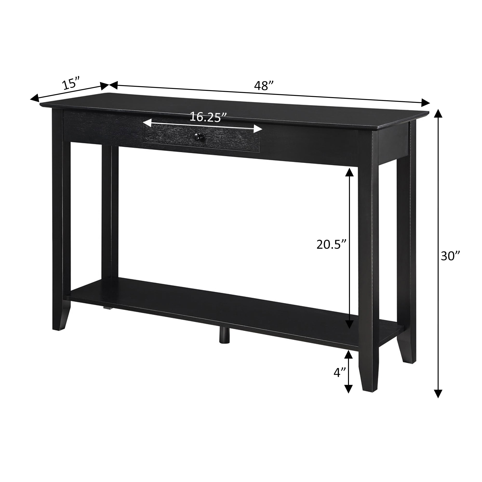 Part of the American Heritage Collection by Convenience Concepts Classic and traditional style Easy assembly with instruction manual provided Crafted from solid and manufactured wood Veneer finish One pull-out drawer Bottom shelf for additional storage or display Tapered feet Lightweight and easy to move Low maintenance, easy to clean, and built for durability To maintain and protect your furniture, regularly wipe down all surfaces with a soft clean dry cloth Preferably Indoors Assembled product weight: 40 lbs. Maximum weight capacity: 25 lbs. per shelf Assembled product dimensions: (W) 48 in. x (D) 15 in. x (H) 30 in. Color may vary slightly due to photography lighting or monitor display