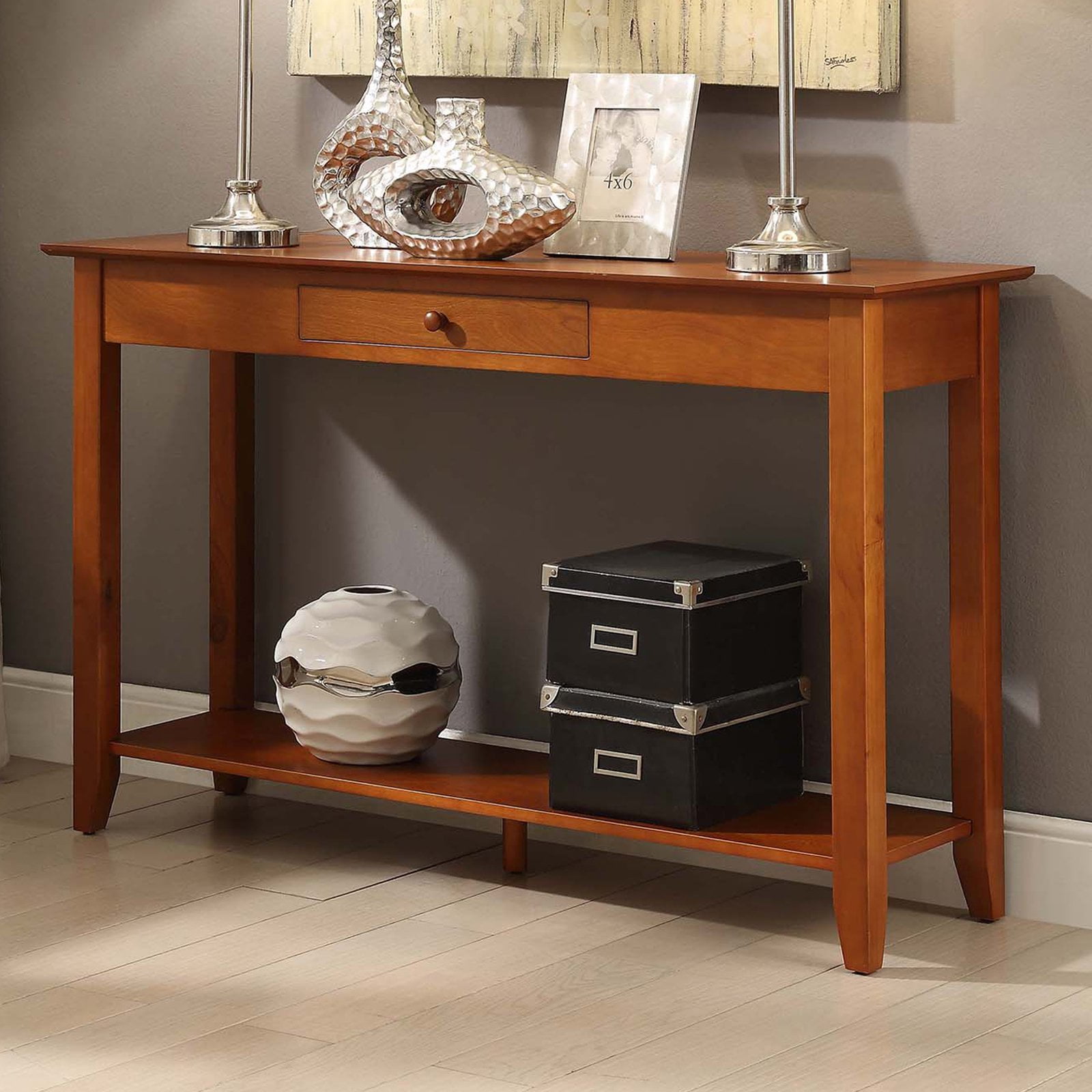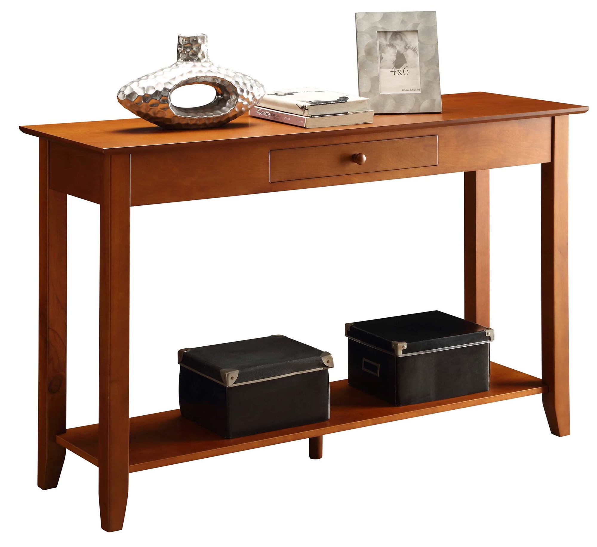 Convenience Concepts American Heritage 1 Drawer Console Table with Shelf, Cherry Features: Part of the American Heritage Collection Classic and Transitional Styles Available in Multiple Finishes 1 Drawer & 2 Tiers of Spacious Shelving Built from Solid Pine Wood, Ash Veneer, & MDF Assembled Item Weight: 40 lbs. Assembled Item Dimensions: (L) 48 in. x (W) 15 in. x (H) 30 in.