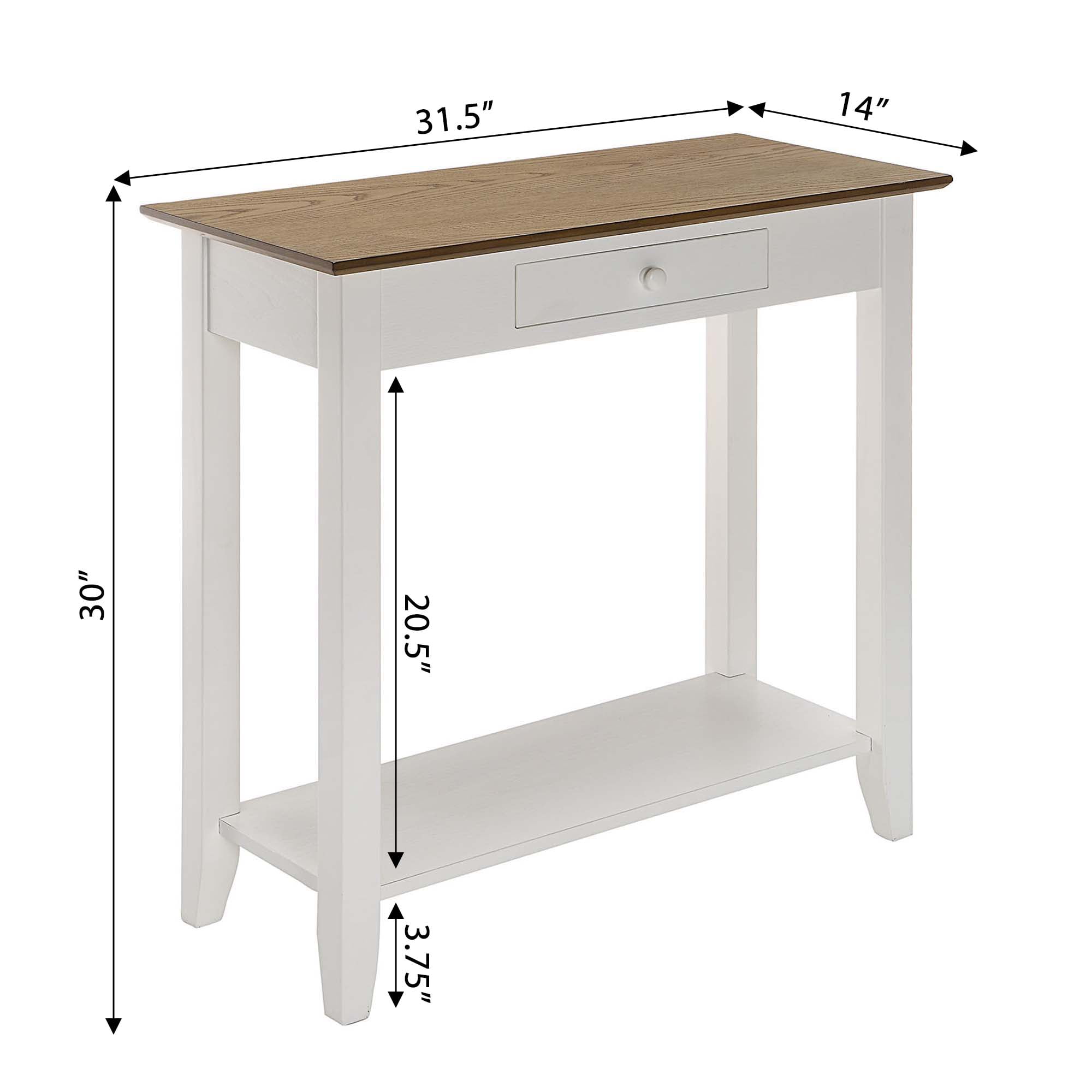 Convenience Concepts American Heritage 1 Drawer Hall Table with Shelf, Driftwood/White Features: Part of the American Heritage Collection by Convenience Concepts Classic and Transitional Styles 1 Drawer & 2 Tiers of Spacious Shelving Built from Solid Pine Wood, Ash Veneer, & MDF Assembled Item Weight: 27 lbs. Assembled Item Dimensions : (L) 31.5 in. x (W) 14 in. x (H) 30 in.