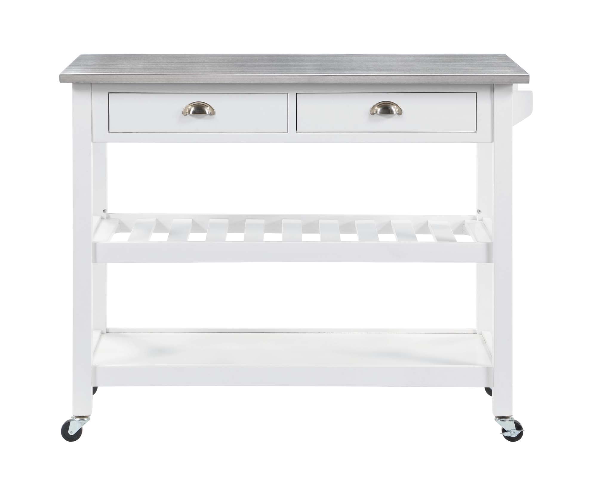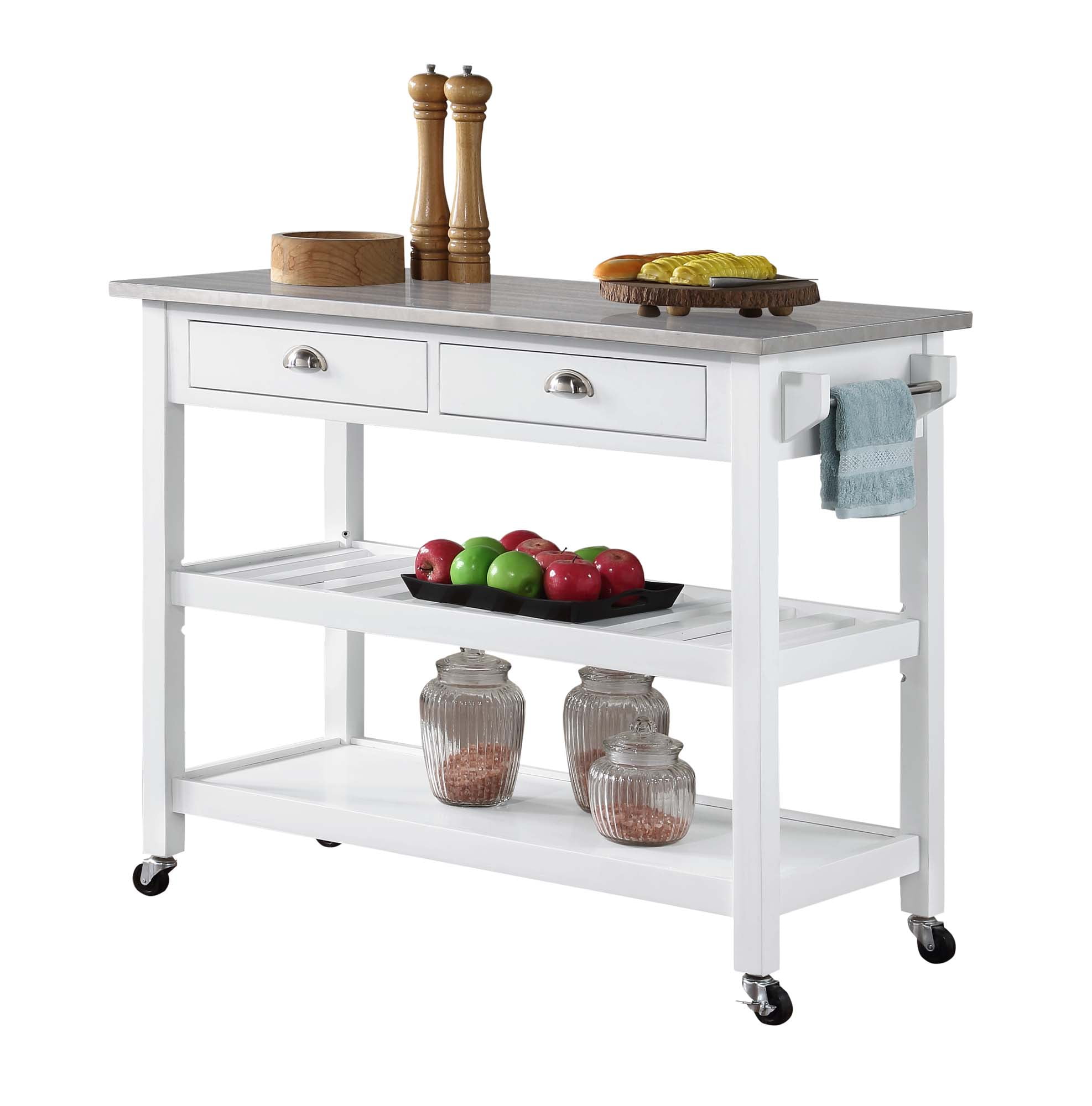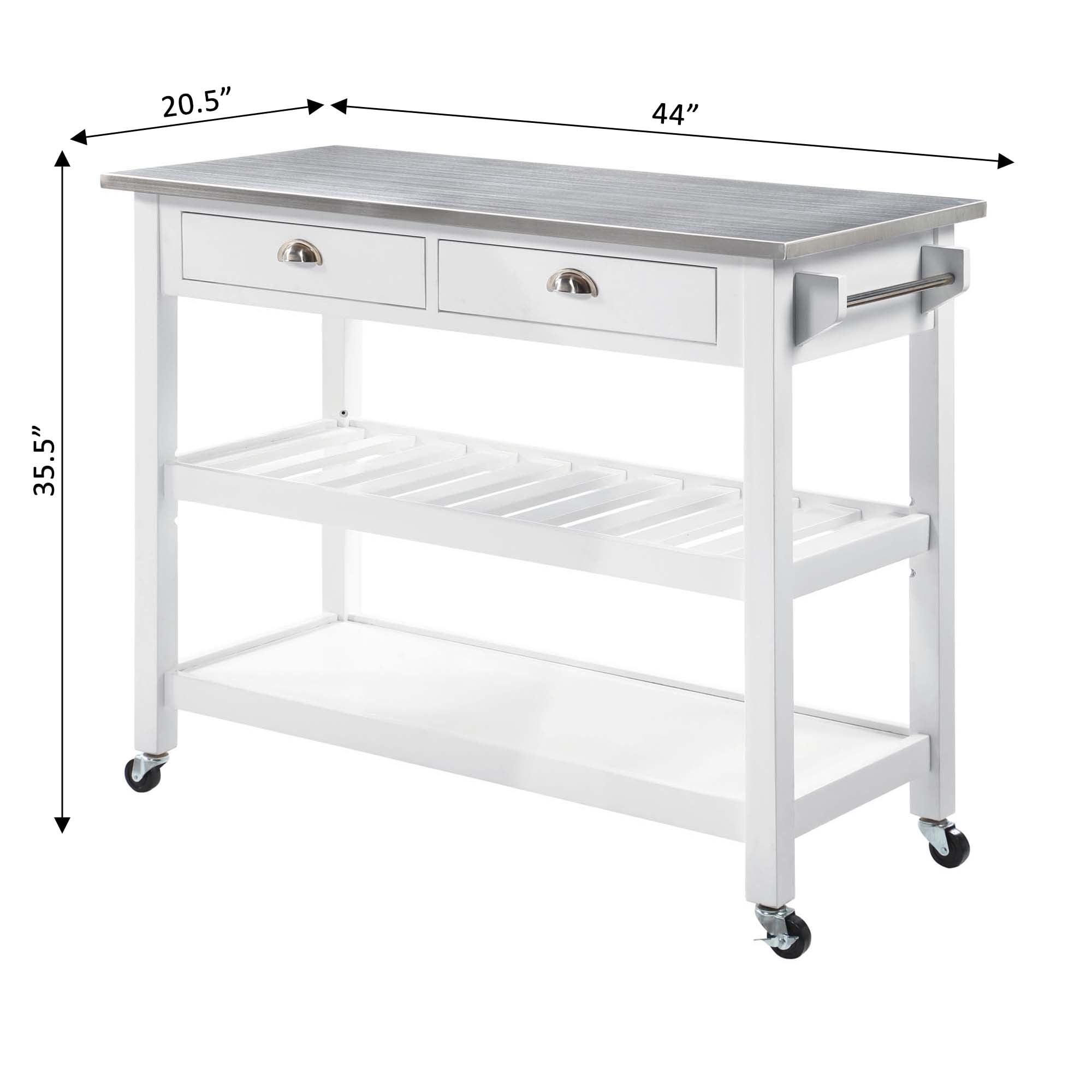 Convenience Concepts American Heritage 3 Tier Stainless Steel Kitchen Cart with Drawers, White/Stainless Steel Features: Part of the American Heritage Collection by Convenience Concepts Modern and contemporary style Features a stainless steel top for efficient food prep Stainless-steel towel rack Heavy-duty locking caster wheels provide a 360° swivel and easy mobility 2 drawers for concealed storage Middle shelf doubles as a wine rack 3 tiers of shelving, ideal for storing cooking essentials Constructed os solid wood Low maintenance, easy to clean, and built for durability Easy assembly with instructions provided Assembled Item Weight: 78 lbs. Maximum Weight Capacity Per Top Shelf: 60 lbs. Maximum Weight Capacity Per bottom 2 Shelves: 30 lbs. each Assembled product dimensions: (L) 45 in. x (W) 20.5 in. x (H) 36 in. Color may vary slightly due to photography lighting or monitor display