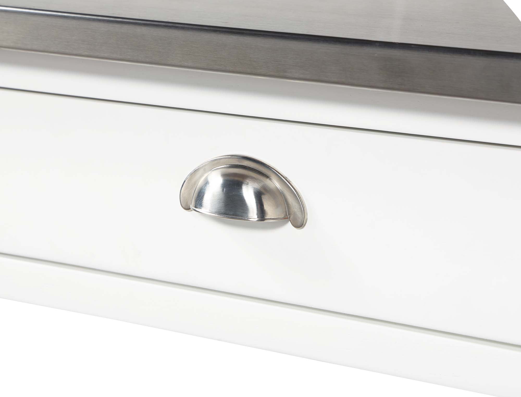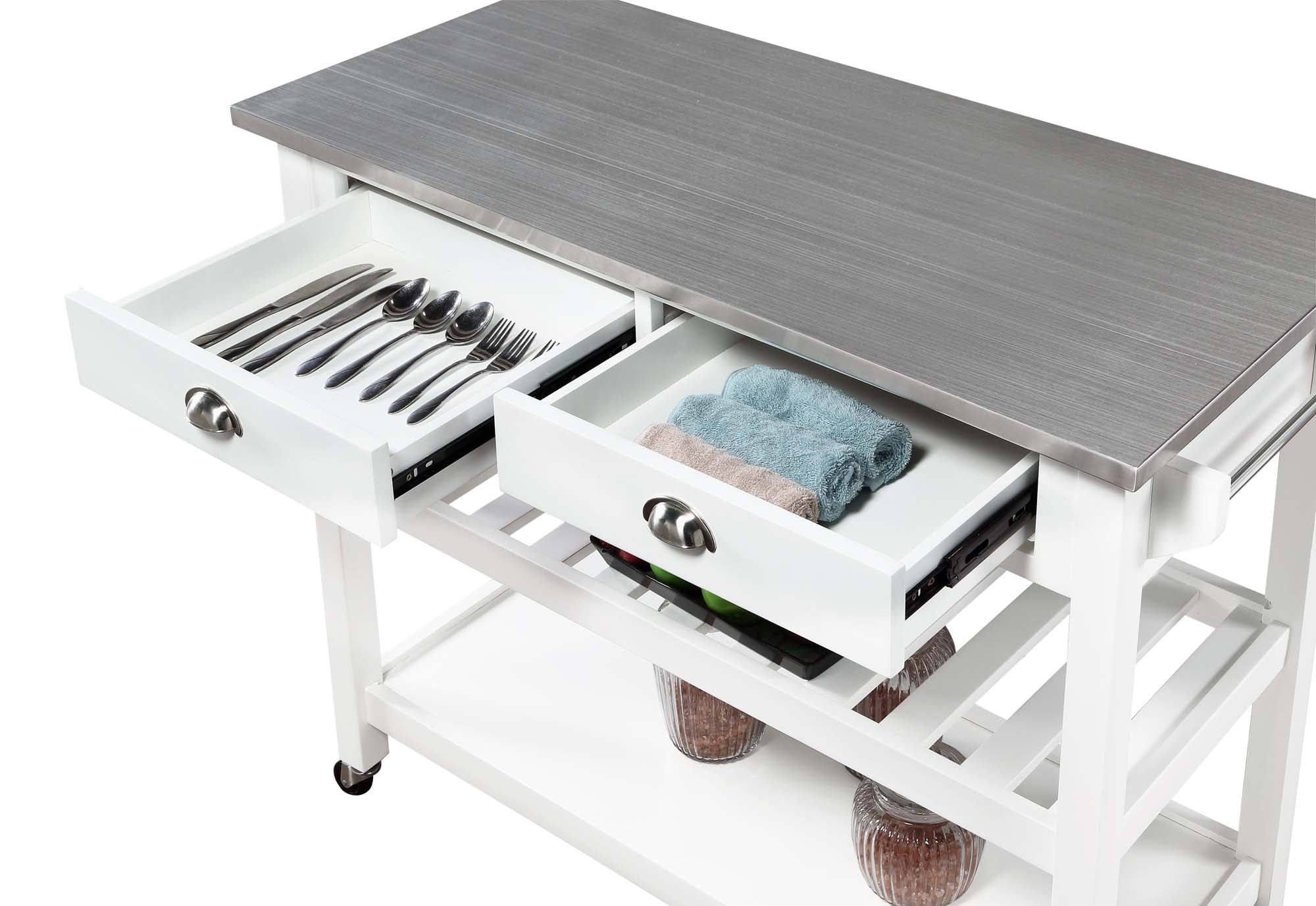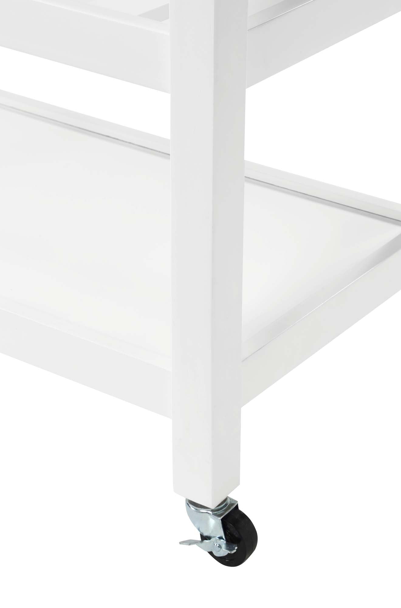 Convenience Concepts American Heritage 3 Tier Stainless Steel Kitchen Cart with Drawers, White/Stainless Steel Features: Part of the American Heritage Collection by Convenience Concepts Modern and contemporary style Features a stainless steel top for efficient food prep Stainless-steel towel rack Heavy-duty locking caster wheels provide a 360° swivel and easy mobility 2 drawers for concealed storage Middle shelf doubles as a wine rack 3 tiers of shelving, ideal for storing cooking essentials Constructed os solid wood Low maintenance, easy to clean, and built for durability Easy assembly with instructions provided Assembled Item Weight: 78 lbs. Maximum Weight Capacity Per Top Shelf: 60 lbs. Maximum Weight Capacity Per bottom 2 Shelves: 30 lbs. each Assembled product dimensions: (L) 45 in. x (W) 20.5 in. x (H) 36 in. Color may vary slightly due to photography lighting or monitor display
