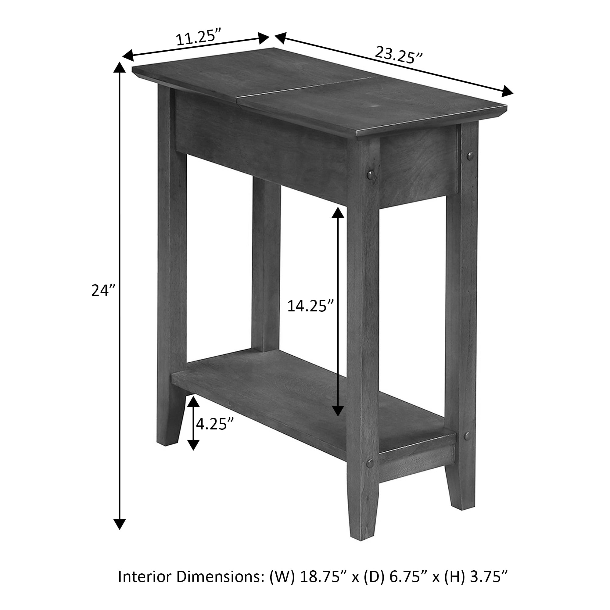 The American Heritage Flip Top End Table with Shelf by Convenience Concepts is the perfect solution for keeping entertainment essentials close by! This stylish yet functional end table features a hidden flip-top storage compartment. Open the tabletop to reveal plenty of space to store remote controls, charging cables, books, and much more. In addition to the flip-top storage compartment, a bottom shelf offers additional space for display or storage. Engineered from MDF, particleboard, and poplar wood, this table is built to last. In addition, this beautiful classic table is finished with a birch veneer for easy maintenance. Coordinating with current furnishings is easy thanks to the wide variety of finishes available. Shop the complete American Heritage Collection by Convenience Concepts, each sold separately.