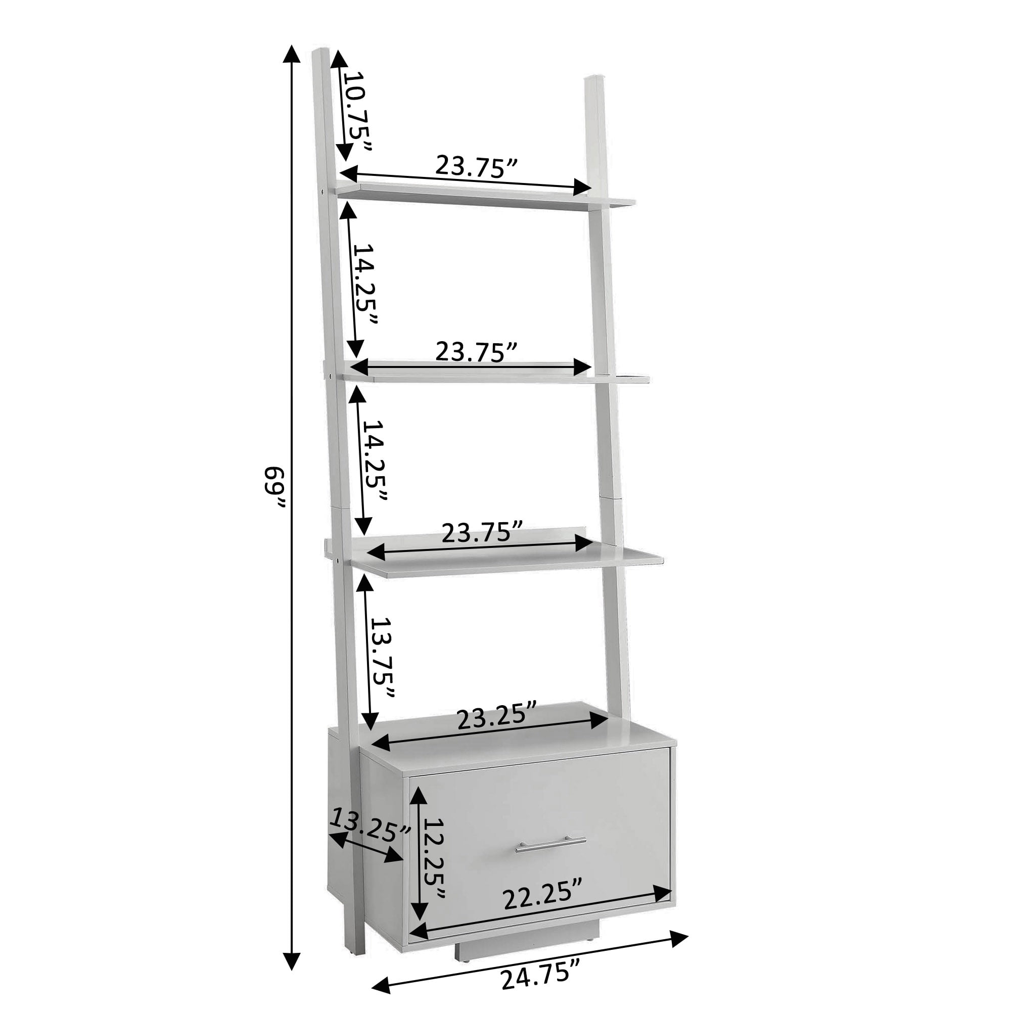 Features: Available in Multiple Finishes 4 Spacious Tiers Drawer for files and Concealed Storage Quick and Easy Set Up Will Complement Any Decor Overall dimensions: 24.75″W x 15.75″D x 69″H Color May Vary Slightly Due to Photography Lighting or Monitors Display