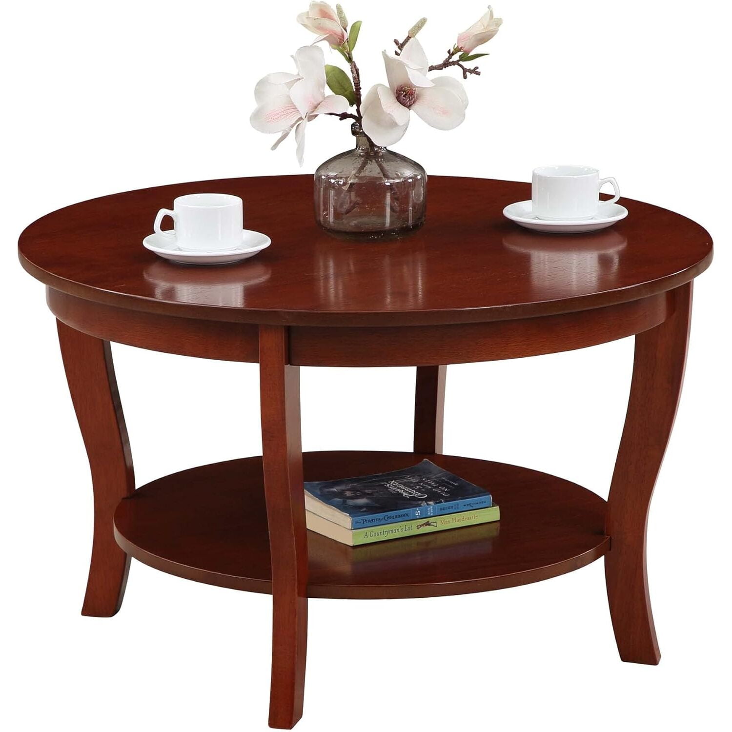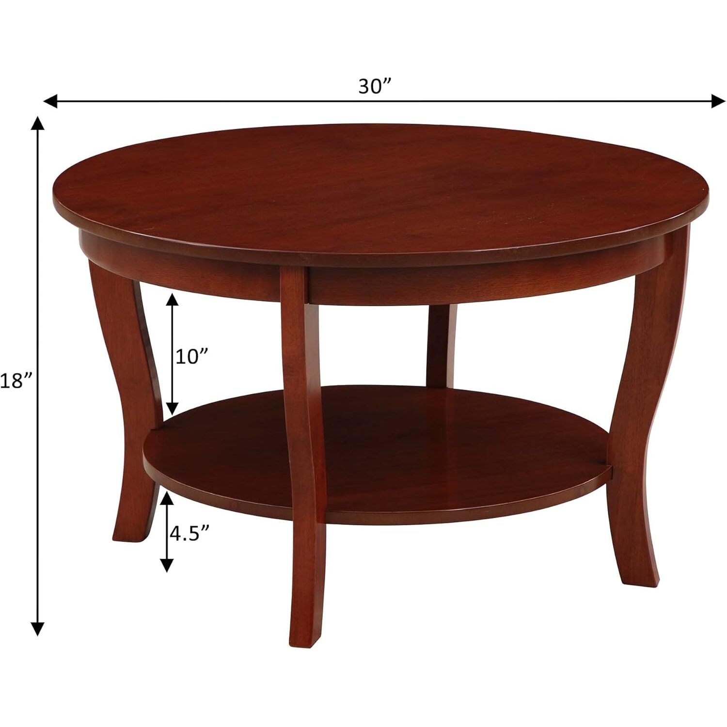 Convenience Concepts American Heritage Round MDF Coffee Table with Shelf, Mahogany Classic round design with slightly curved legs Bottom shelf provides additional storage and display space Two circular tiers for showcasing centerpieces or essentials Crafted from durable manufactured wood with a rich veneer finish Sturdy legs made from solid rubberwood for enhanced stability Easy assembly with only three simple steps Dimensions: 30 in. L x 30 in. W x 18 in. H Available in multiple finishes to match your home decor Part of the American Heritage Collection by Convenience Concepts Product Weight: 25 lbs