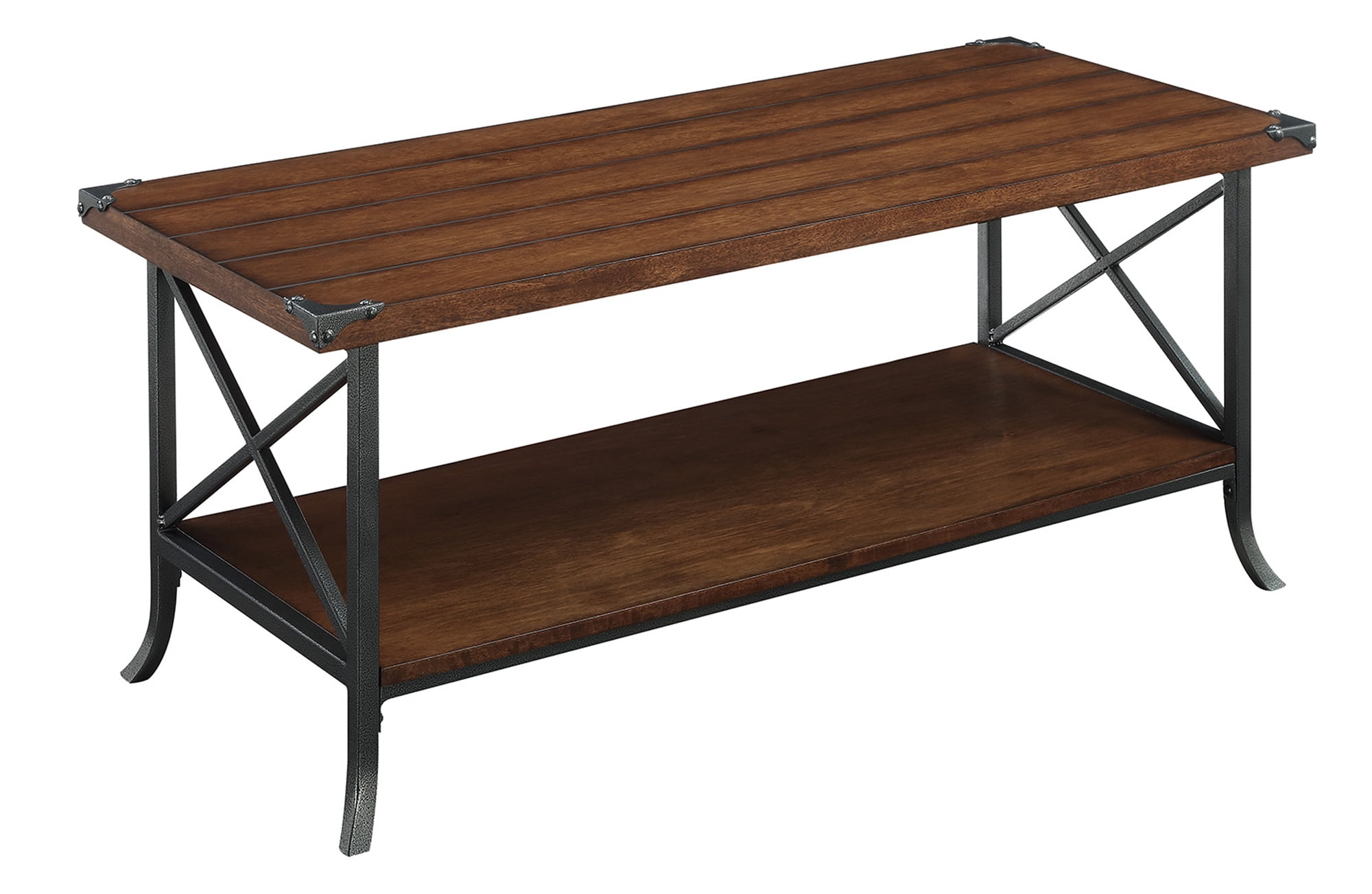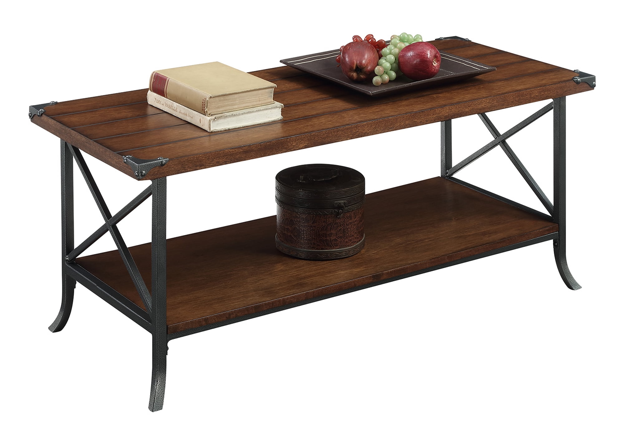 Convenience Concepts Brookline Coffee Table with Shelf, Dark Walnut/Slate Gray Features Part of the Brookline Collection by Convenience Concepts Grooved Top Panel Decorative Metal Corner Protectors Bottom Shelf for Additional Display Slightly Scrolled Feet Powder coated metal frame Assembled Product Weight: 35 lbs. Assembled Product Dimensions: 42″W x 17.75″D x 17.75″H