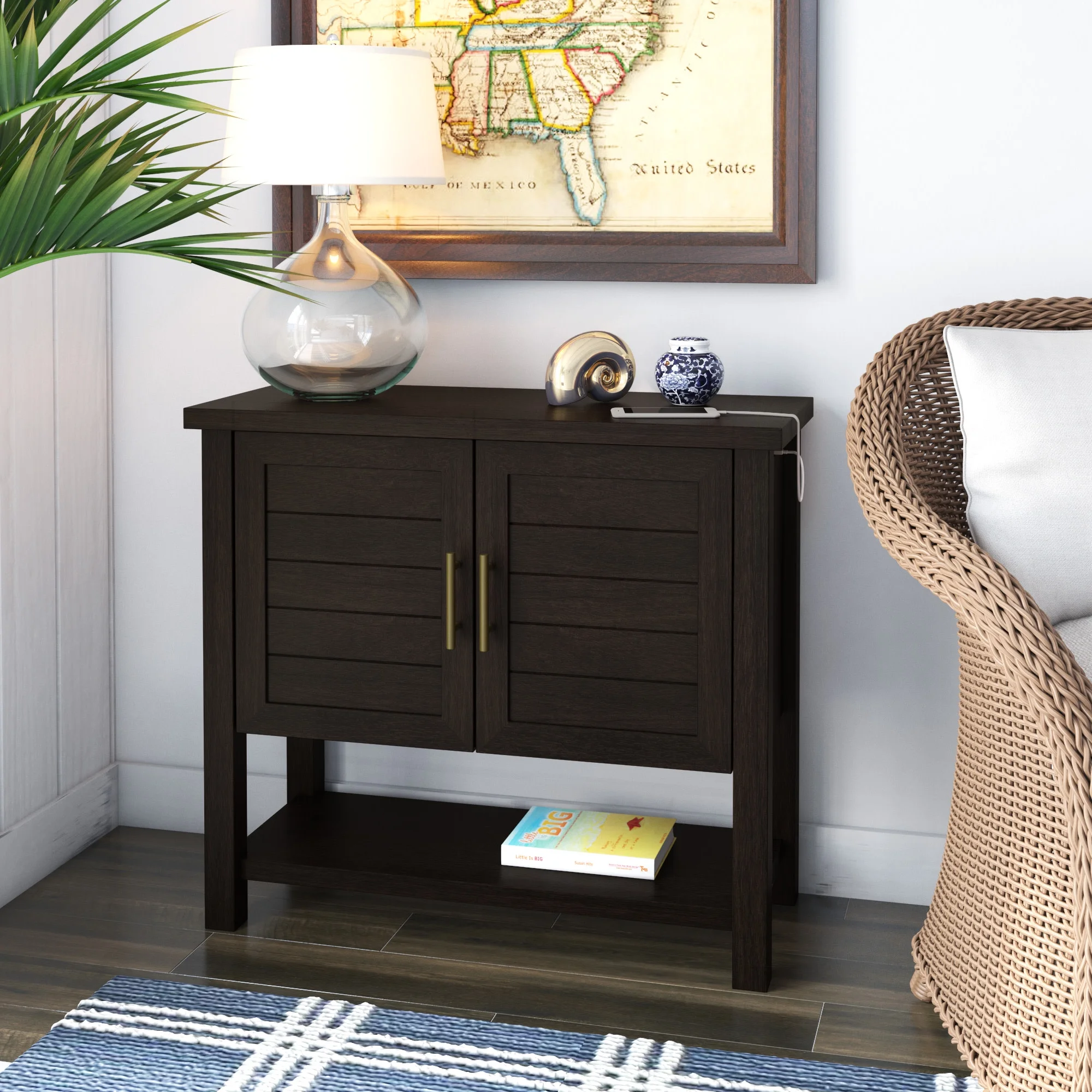 Features Grooved Top Panel Decorative Metal Corner Protectors Bottom Shelf for Additional Display Slightly Scrolled Feet Powder coated metal frame Overall Item Dimensions: 45.75″W x 15.75″D x 29.5″H