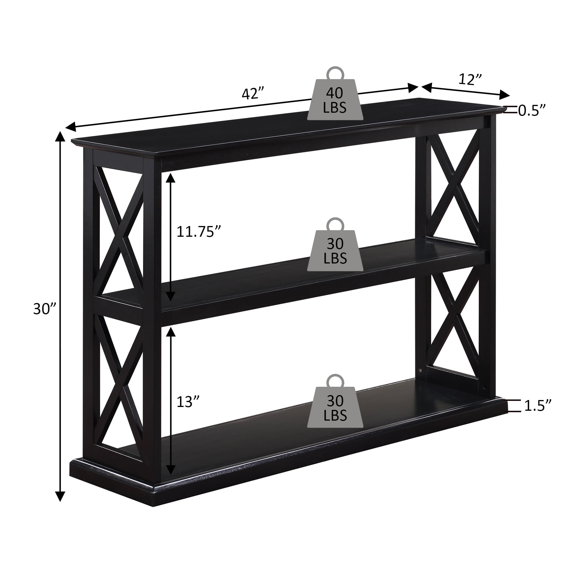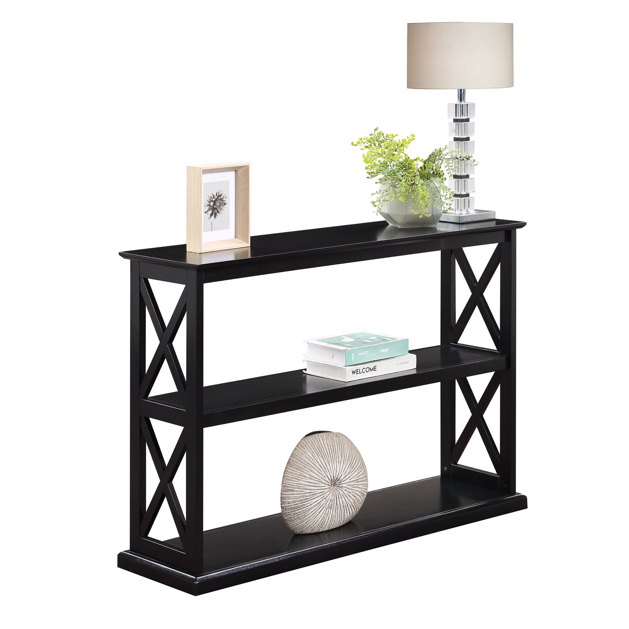 Bring luxury and elegance home with the Coventry Console Table with Shelves by Convenience Concepts. This beautiful piece boasts carefully crafted beveled edges while showcasing a classic double X design giving off a bold modern vibe. Multiple finishes are available to choose from that fit several home styles such as farmhouse; coastal; and transitional designs. Three spacious tiers of shelving offer plenty of room to display elegant home décor; collectibles; and storage if needed. This sophisticated console table has been built out of solid wood and is sure to be as durable as it looks. Assembly is easy and requires only three quick steps. Shop the complete luxurious Coventry Collection by Convenience Concepts; each sold separately.