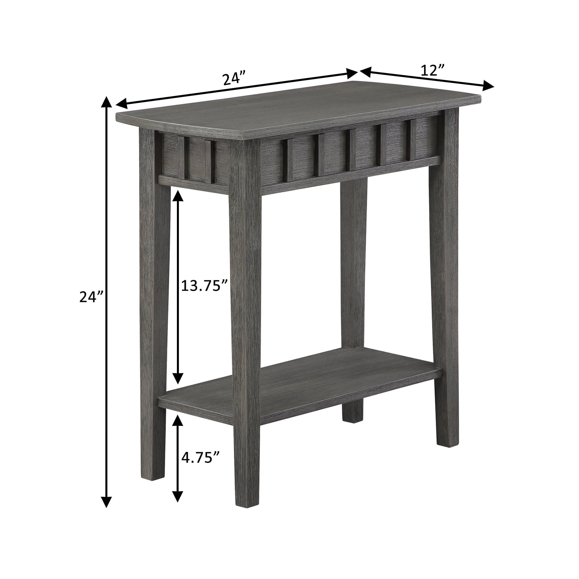 Convenience Concepts Dennis End Table with Shelf, Wirebrush Dark Gray Features: Part of the Classic Accents Collection by Convenience Concepts Modern & Transitional Style Two Tiers of Spacious Shelving Tapered Legs Built from Solid Rubberwood Tiers are Crafted from Sturdy MDF & Non-Lead-Based Paint Low Maintenance, Easy to Clean, & Built for Durability Easy assembly with instructions provided Maximum Weight Capacity Per Shelf: 25 lbs. Assembled Item Weight: 18 lbs. Assembled Item Dimensions: (L) 24 in. x (W) 12 in. x (H) 24 in.