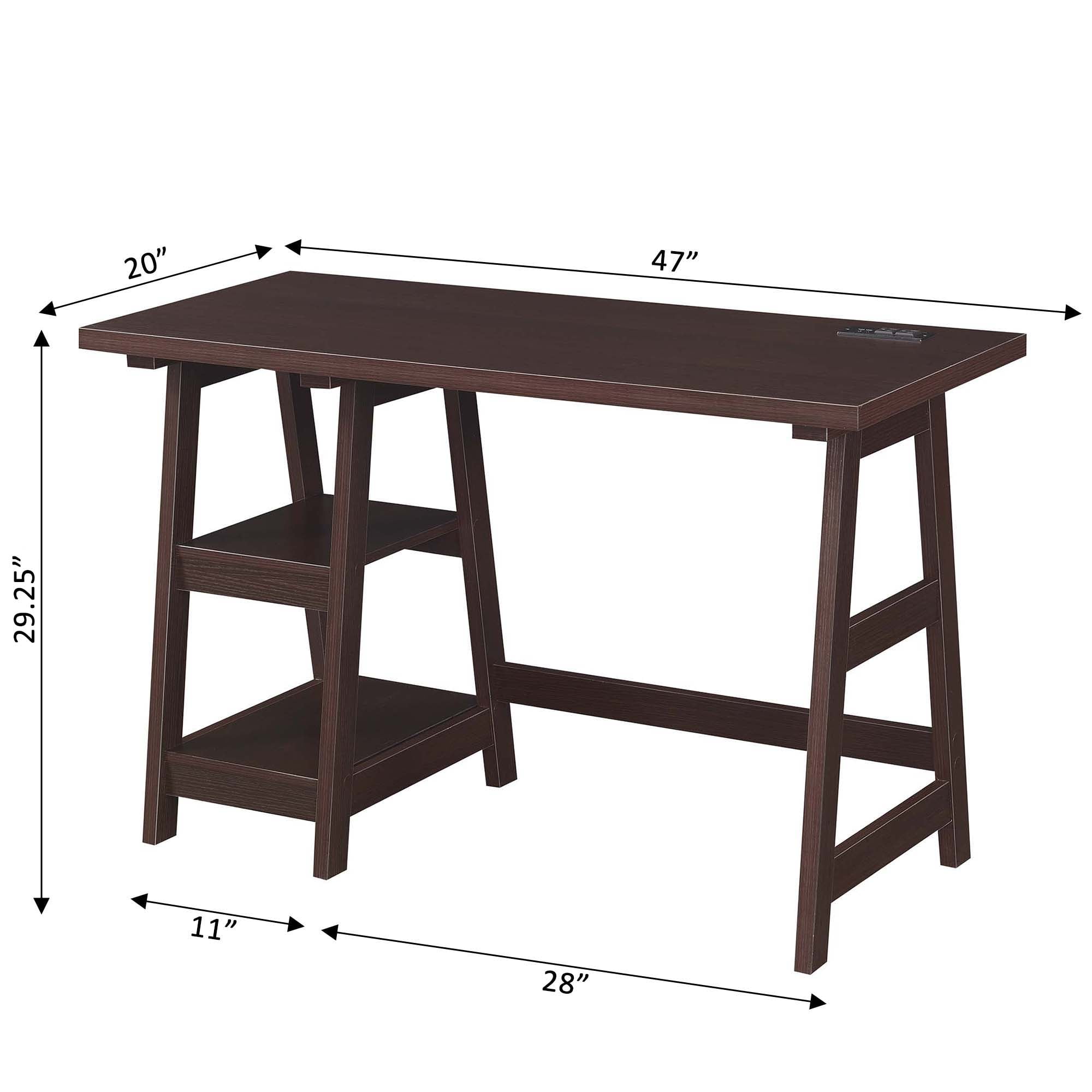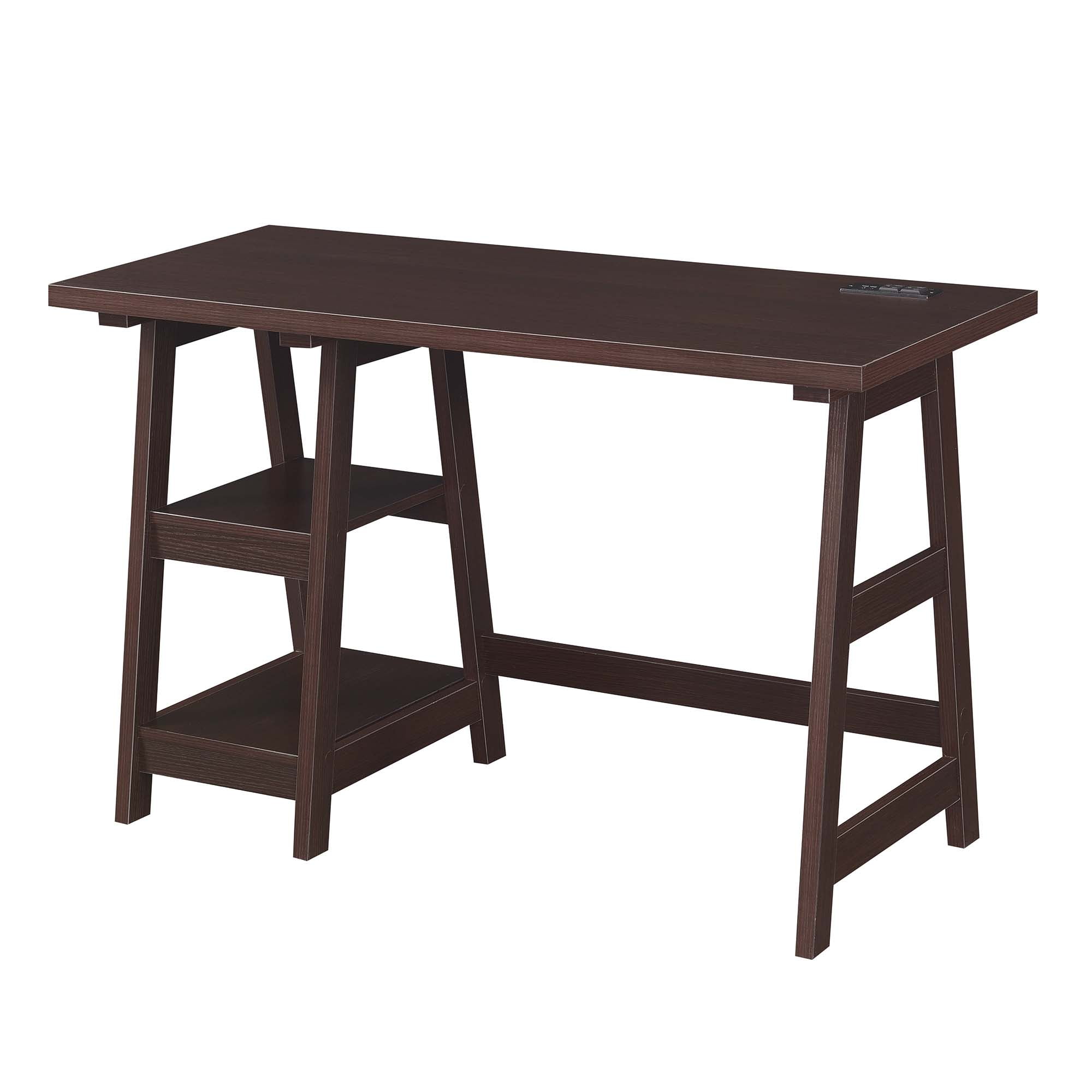 Improve your workspace with the Designs2Go Trestle Desk with Charging Station and Shelves by Convenience Concepts! This contemporary design has no age limits and combines simplicity and functionality all in one. Thanks to the large surface top; there is ample space for a student who is studying or for those working from home. The charging station conveniently located on the desktop includes two standard outlets and two USB ports that can charge a phone, tablet, laptop, and more! In addition, the power supply cord is 6 feet in length giving this desk the flexibility needed when it comes to placement. The left side of this piece features two sturdy shelves giving extra space to store schoolwork or office essentials. Built to last; this unit was crafted from Particleboard and MDF. The Designs2Go Trestle Desk with Charging Station and Shelves is available in a wide variety of bold colors that are sure to match any current furnishings. Good for all ages such as Students, Adults, and anyone wanting to add simplicity to their workload.