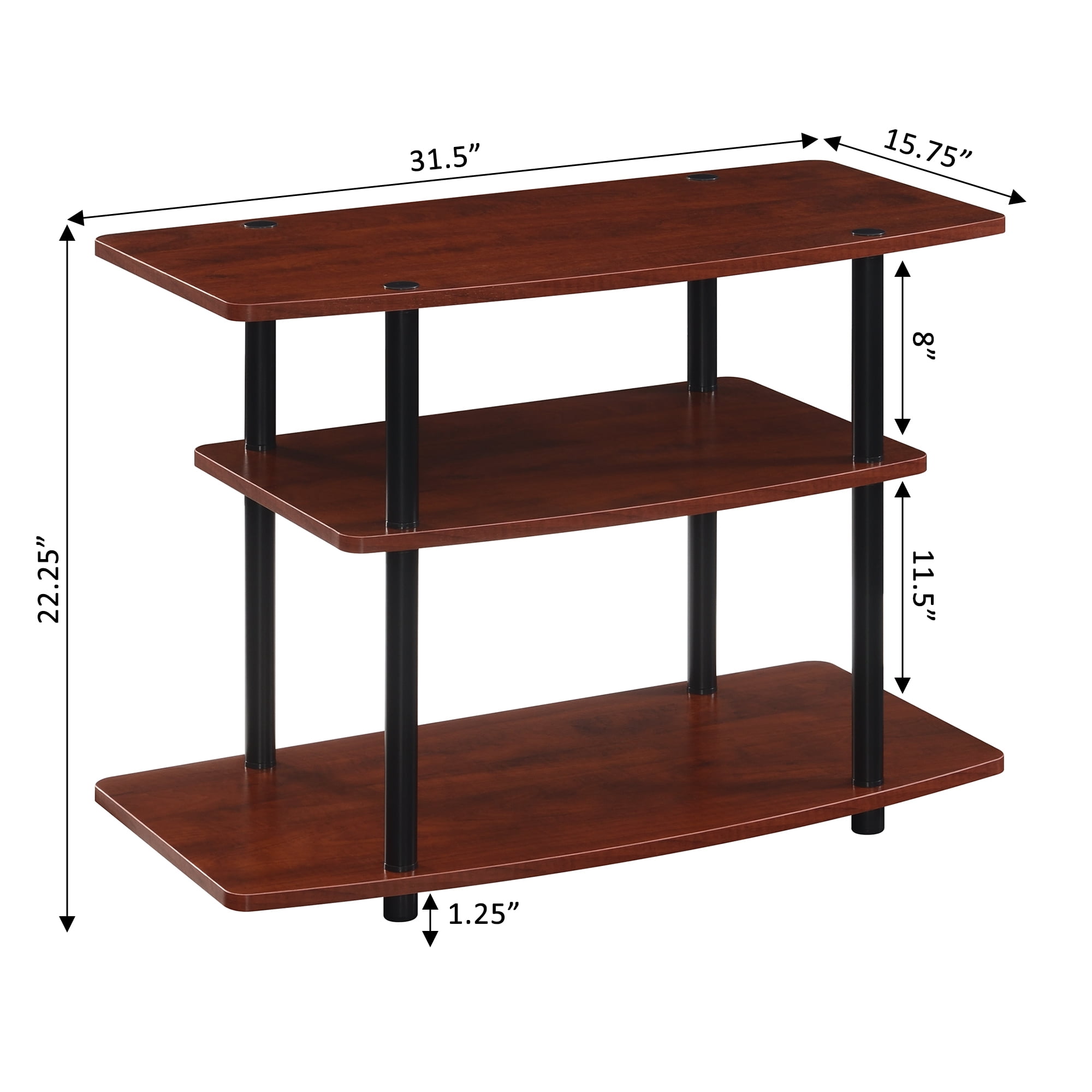 Features: Part of the Designs2Go Collection by Convenience Concepts Contemporary and transitional style Available in multiple finishes Pair with existing furniture collections in your home office, family room, or living room Can hold TVs up to 32 inches wide Wood grain laminate over particleboard construction for strength and durability Engineered from stainless-steel, particle board, and melamine Low maintenance, easy to clean, and built for durability Easy assembly with instructions provided and no tools needed Overall product dimensions: (L) 31.5 in. x (W) 15.75 in. x (H) 22.25 in.