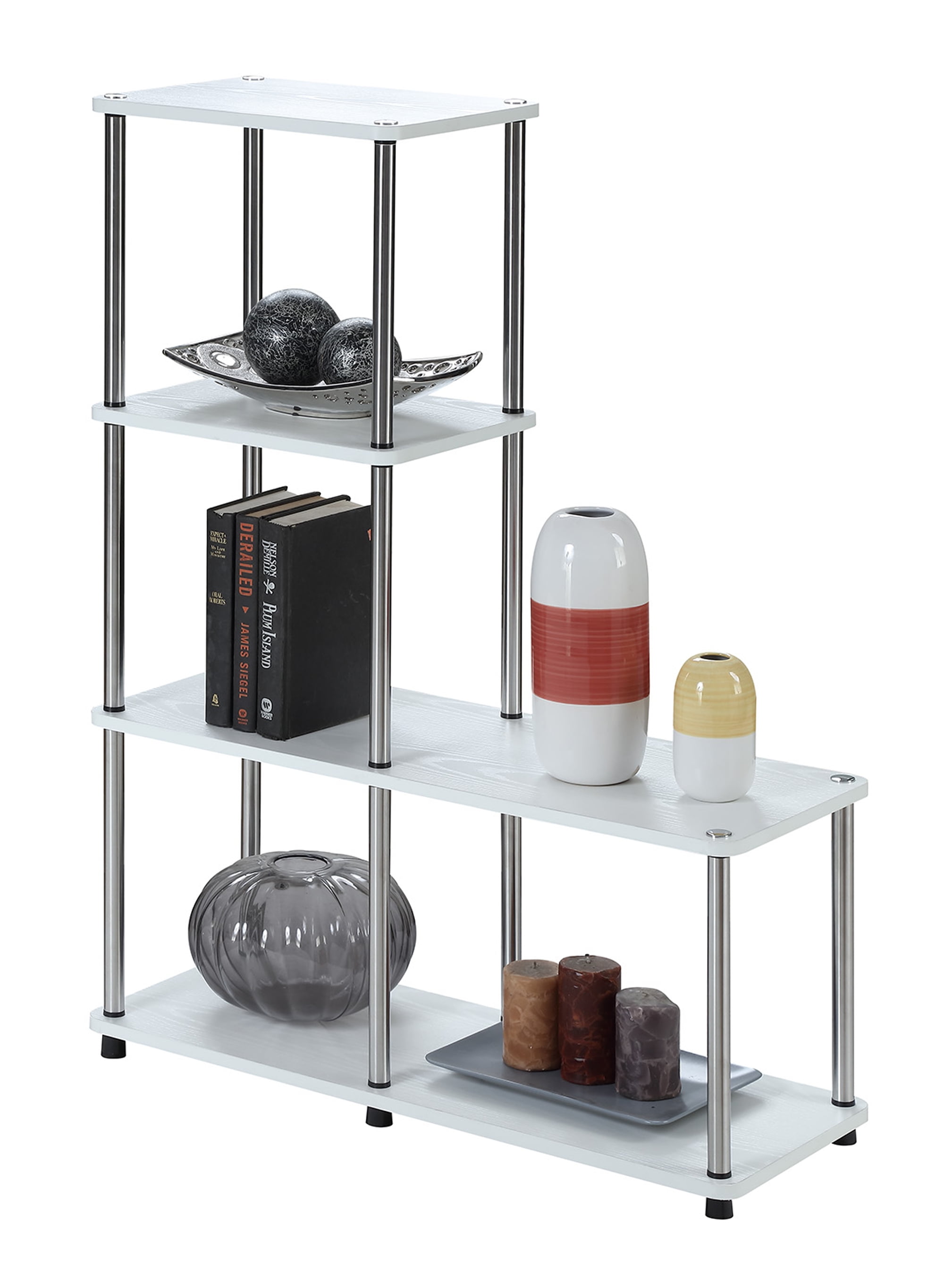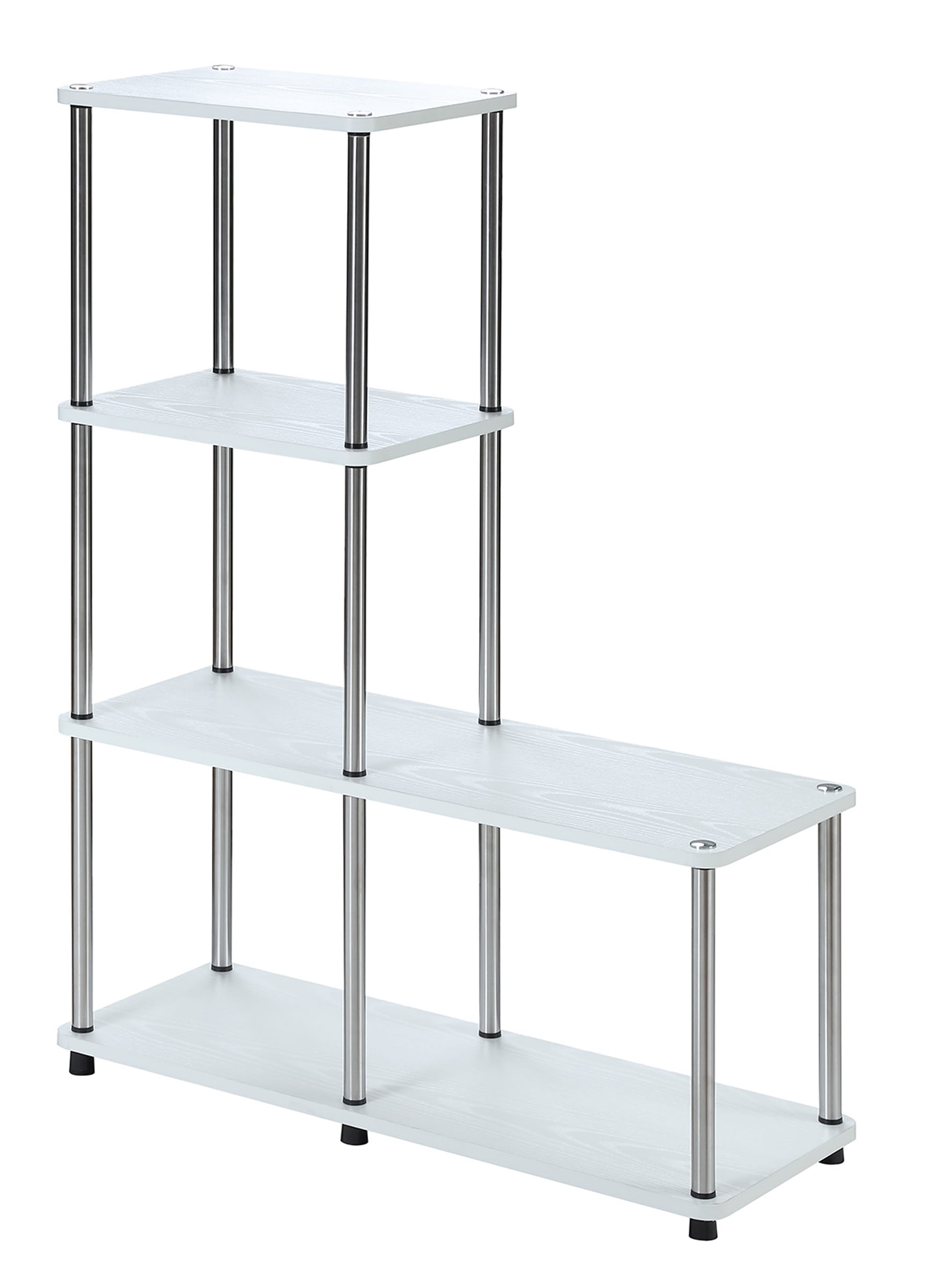 Convenience Concepts Designs2Go 4 Tier L Bookshelf, White Features: Part of Designs2Go Collection by Convenience Concepts Multi Levels Available in multiple finishes Stainless Steel Poles Wont Rust No Tools Required Assembled Item Weight: 22 lbs. Assembled Item Dimensions: (L) 31.5in. x (W) 12in. x (H) 41.75in. Color May Vary Slightly Due to Photography Lighting or Monitors Display