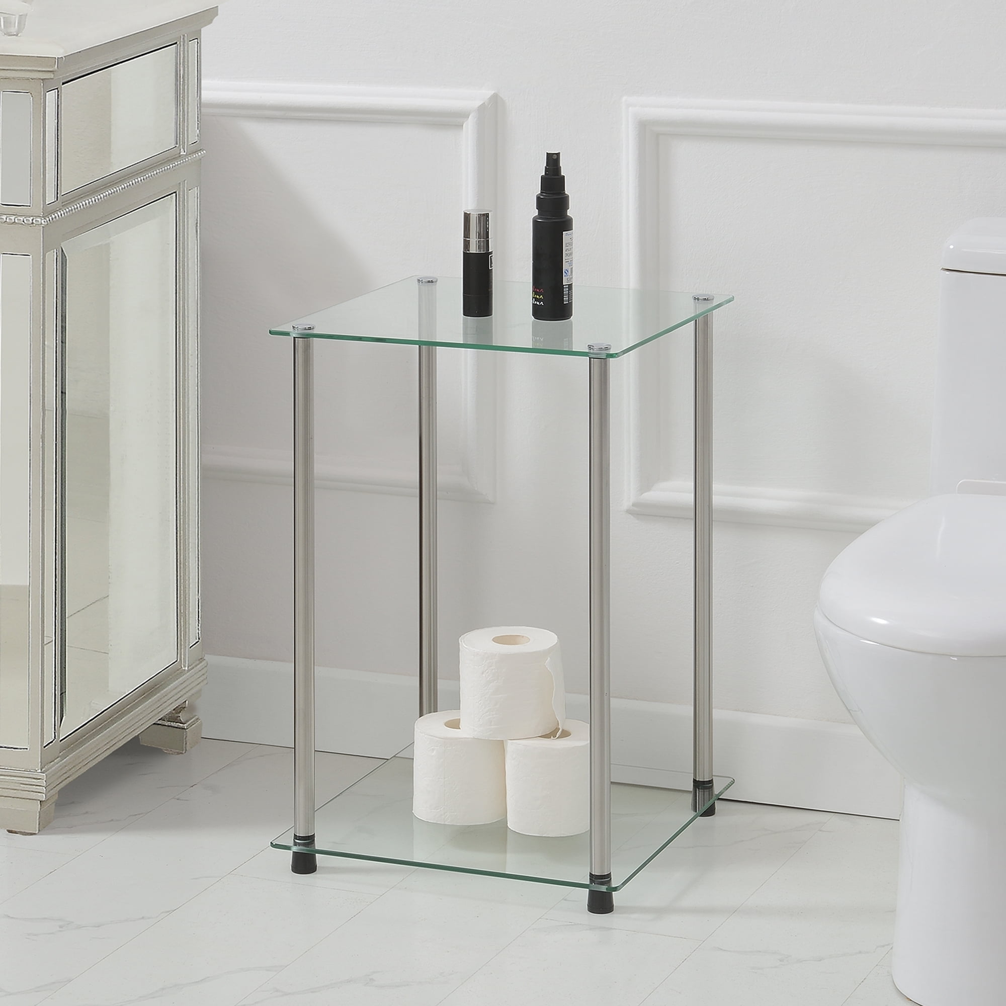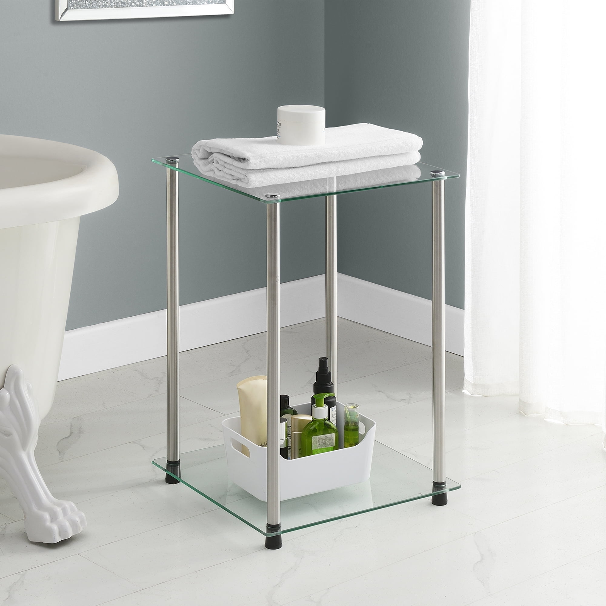 Part of the Designs2Go Classic Glass Collection by Convenience Concepts Modern, contemporary, and glam style 2 tiers of spacious tempered glass shelving Sturdy rust-resistant stainless-steel legs Rubber soles cover the bottom of stainless poles to help protect floors Easy assembly with no tools required To maintain and protect your furniture, regularly wipe down all surfaces with a soft clean dry cloth Assembled item weight: 14 lbs. Maximum weight capacity per shelf: 25 lbs. Assembled product dimensions: (L) 15.75 in. x (W) 15.75 in. x (H) 24 in. Color may vary slightly due to photography lighting or monitor display