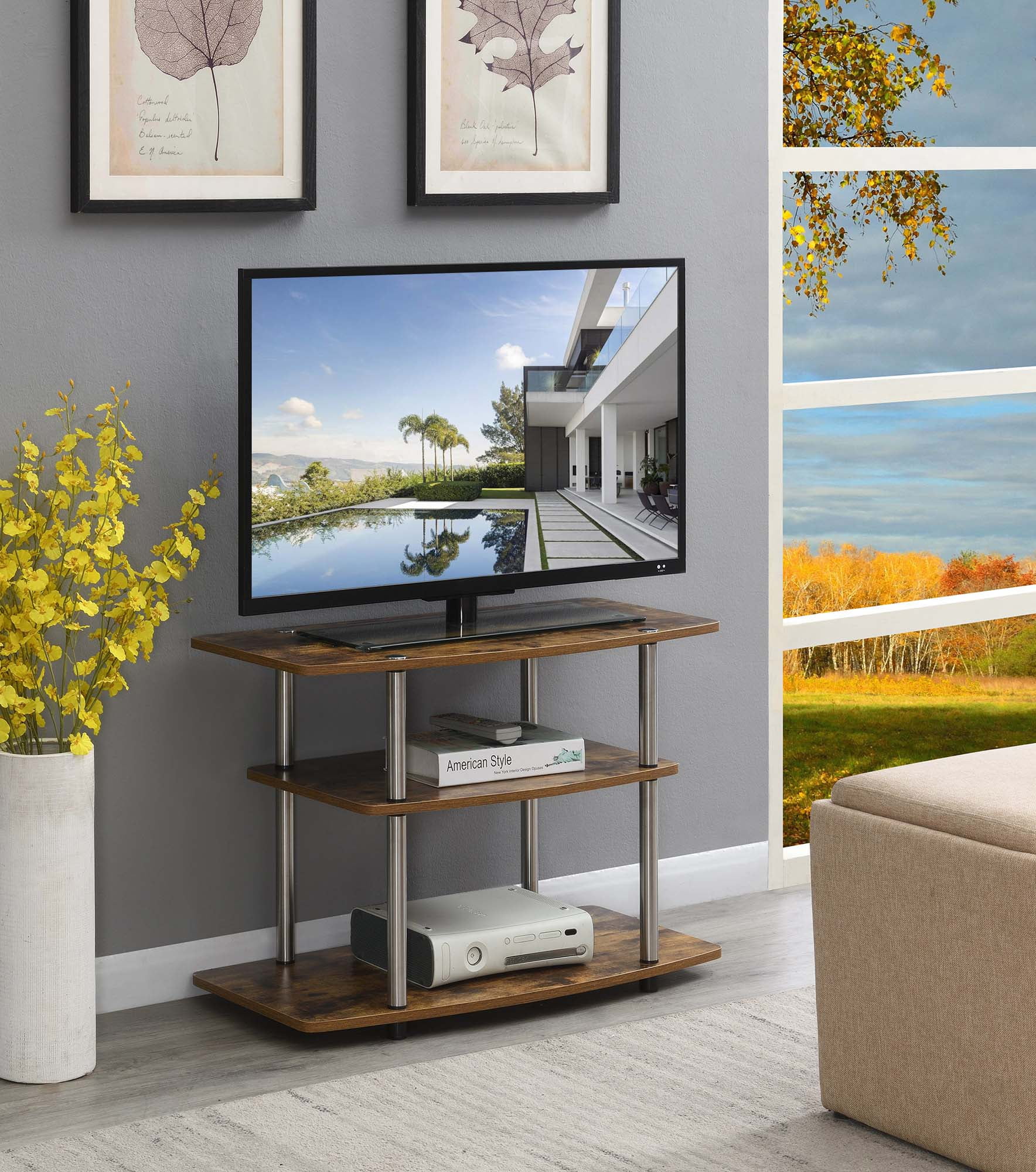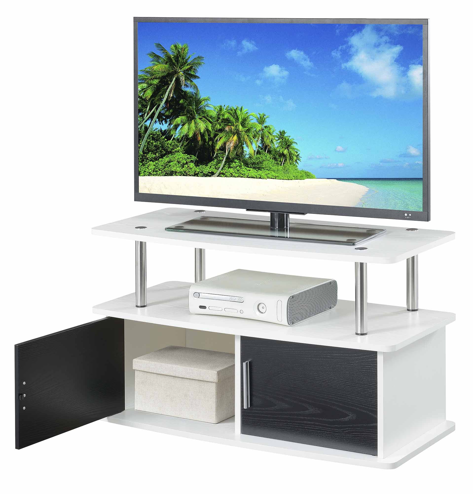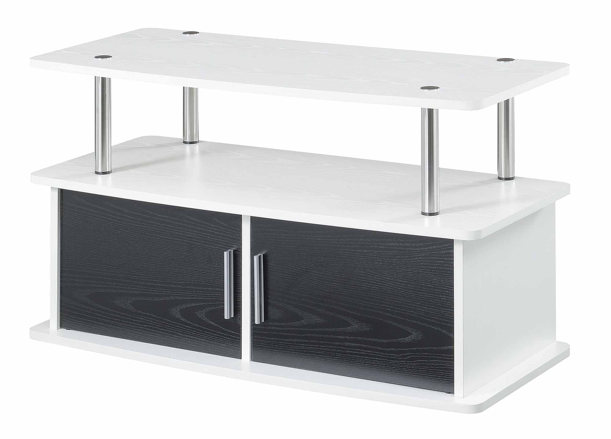 Upgrade your entertainment space with the Designs2Go Deluxe TV Stand with Storage Cabinets and Shelves by Convenience Concepts. Offering plenty of space, this TV stand is every movie lover’s dream. Large storage cabinet space can store DVDs, gaming controllers, and much more. Two tiers of shelving offer additional space for a TV, cable box, gaming consoles, and even décor. This unit is engineered from woodgrain veneer, particle board, and sturdy stainless steel tube poles that will not rust with proper care. Plastic caps with rubber soles also cover the bottom of each corner to help protect your floors. Little time will be wasted putting this unit together thanks to its easy set-up design. Add more convenience to your home from the Designs2Go Collection by Convenience Concepts; each sold separately. Features: Available in Multiple Finishes Two Cabinets for Concealed Storage Two Tiers of Spacious Shelving Engineered from Particleboard, Melamine Veneer, and Stainless Steel Beautiful white wood finish 20.5″ H x 35.5″ W x 15.75″ D Specifications: Product Dimensions: 20.5″ H x 35.5″ W x 15.75″ D Product Color: White