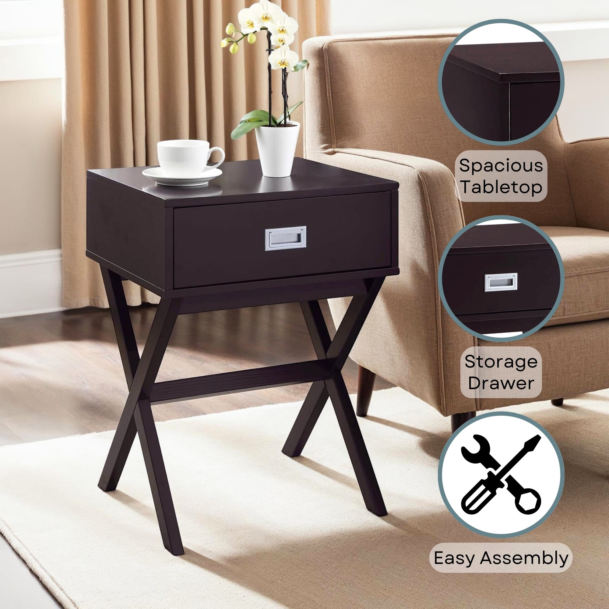 Features: Available in Multiple Finishes Quick and Easy Set Up Drawer for Concealed Storage Will Complement any Decor Modern Styling