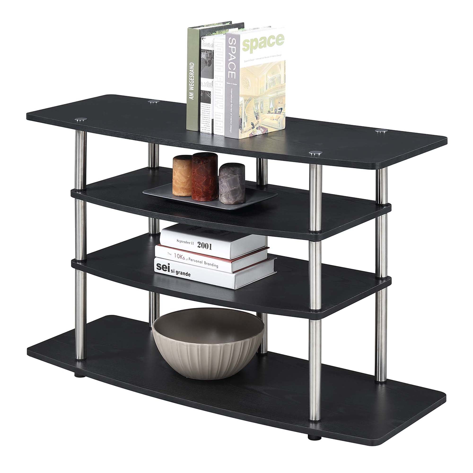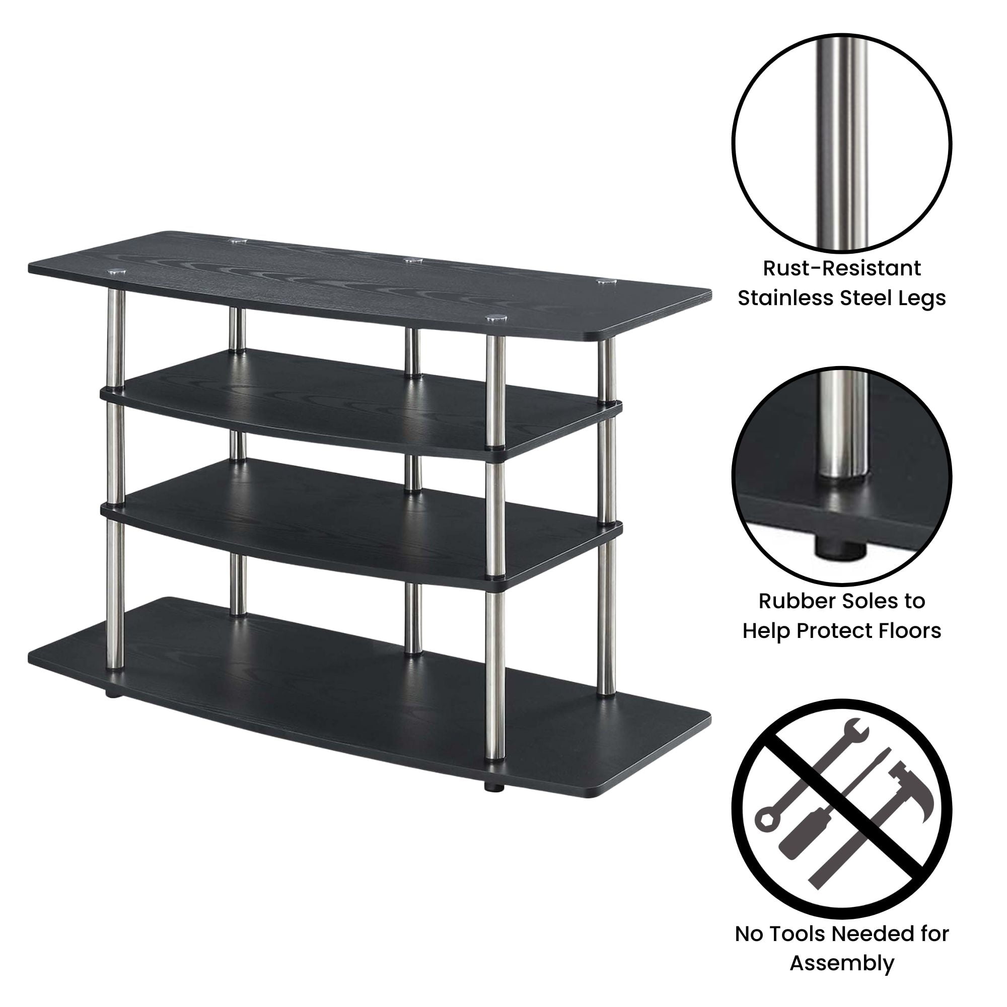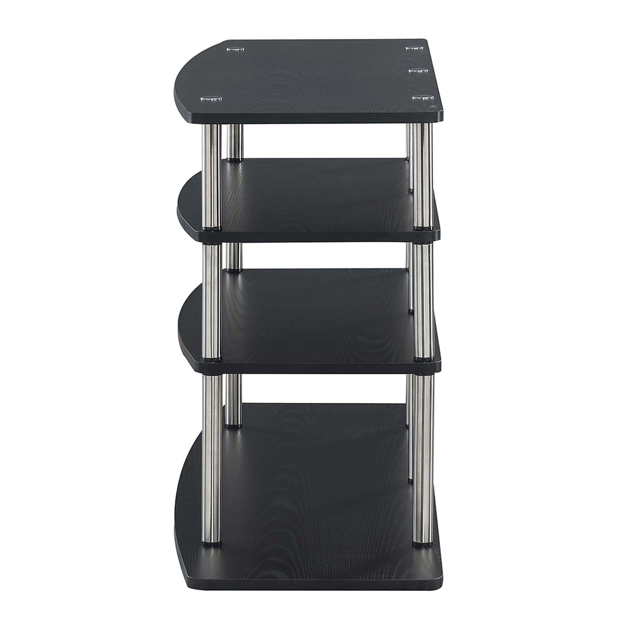 Make the most of your space with the Designs2Go No Tools Wide Highboy 4 Tier TV Stand from Convenience Concepts. Its open concept design and contemporary style will fit perfectly in your living room or home study. This stand features four wide tiers that provide ample space for all your entertainment essentials. The shelves are made of particle board and melamine supported by stainless steel poles, giving this piece a lifetime of durability. Enjoy your favorite shows in no time with its quick and easy assembly, no tools needed. Complete your home look with coordinating pieces from the Designs2Go Collection by Convenience Concepts, each sold separately.