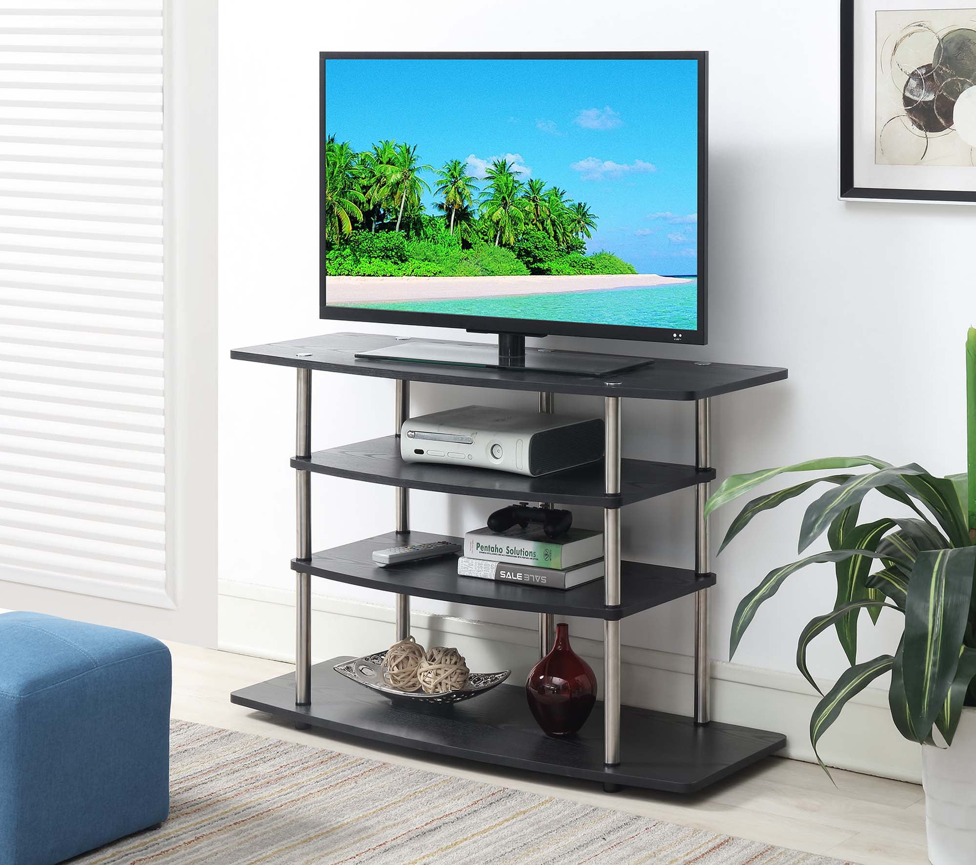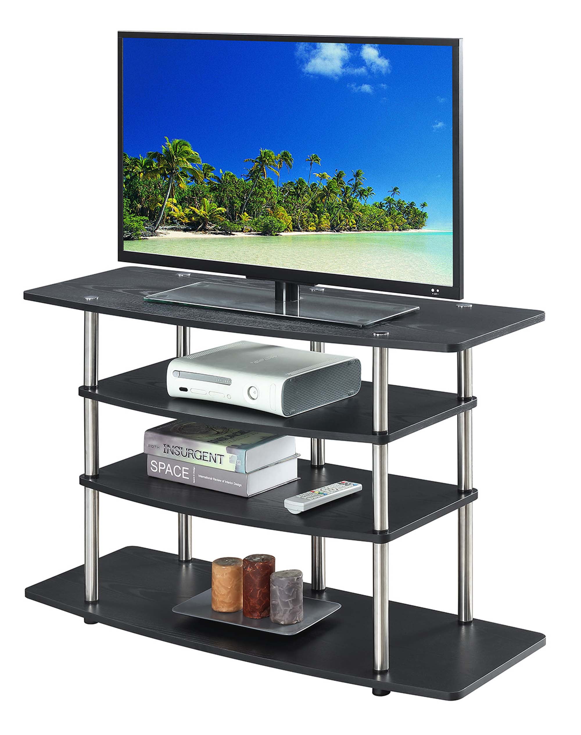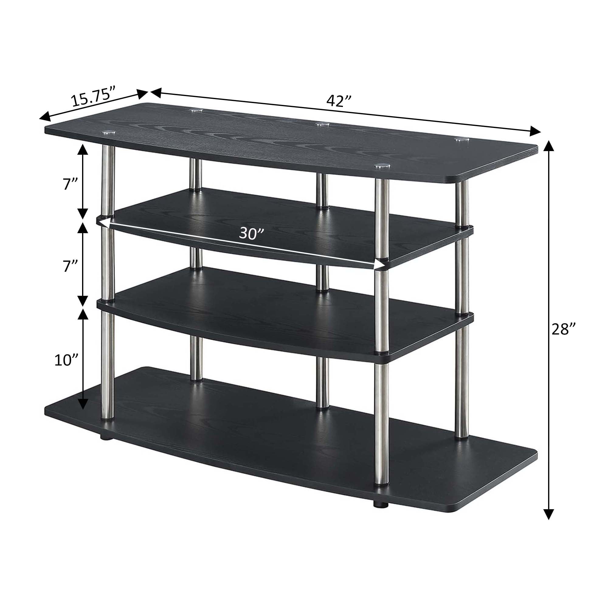 Make the most of your space with the Designs2Go No Tools Wide Highboy 4 Tier TV Stand from Convenience Concepts. Its open concept design and contemporary style will fit perfectly in your living room or home study. This stand features four wide tiers that provide ample space for all your entertainment essentials. The shelves are made of particle board and melamine supported by stainless steel poles, giving this piece a lifetime of durability. Enjoy your favorite shows in no time with its quick and easy assembly, no tools needed. Complete your home look with coordinating pieces from the Designs2Go Collection by Convenience Concepts, each sold separately.