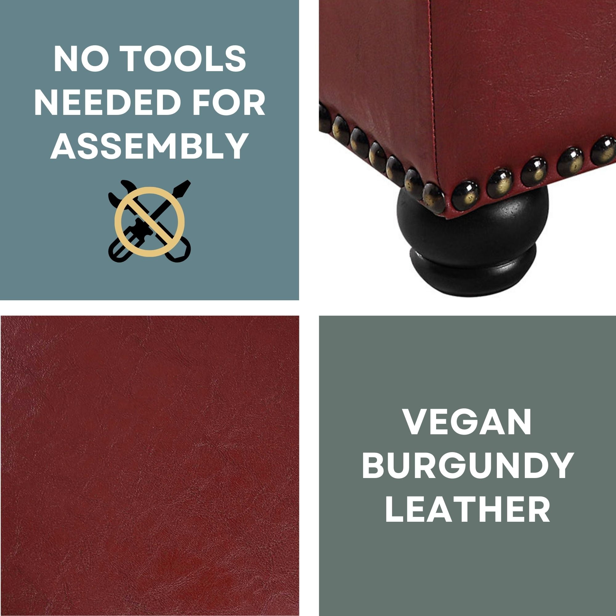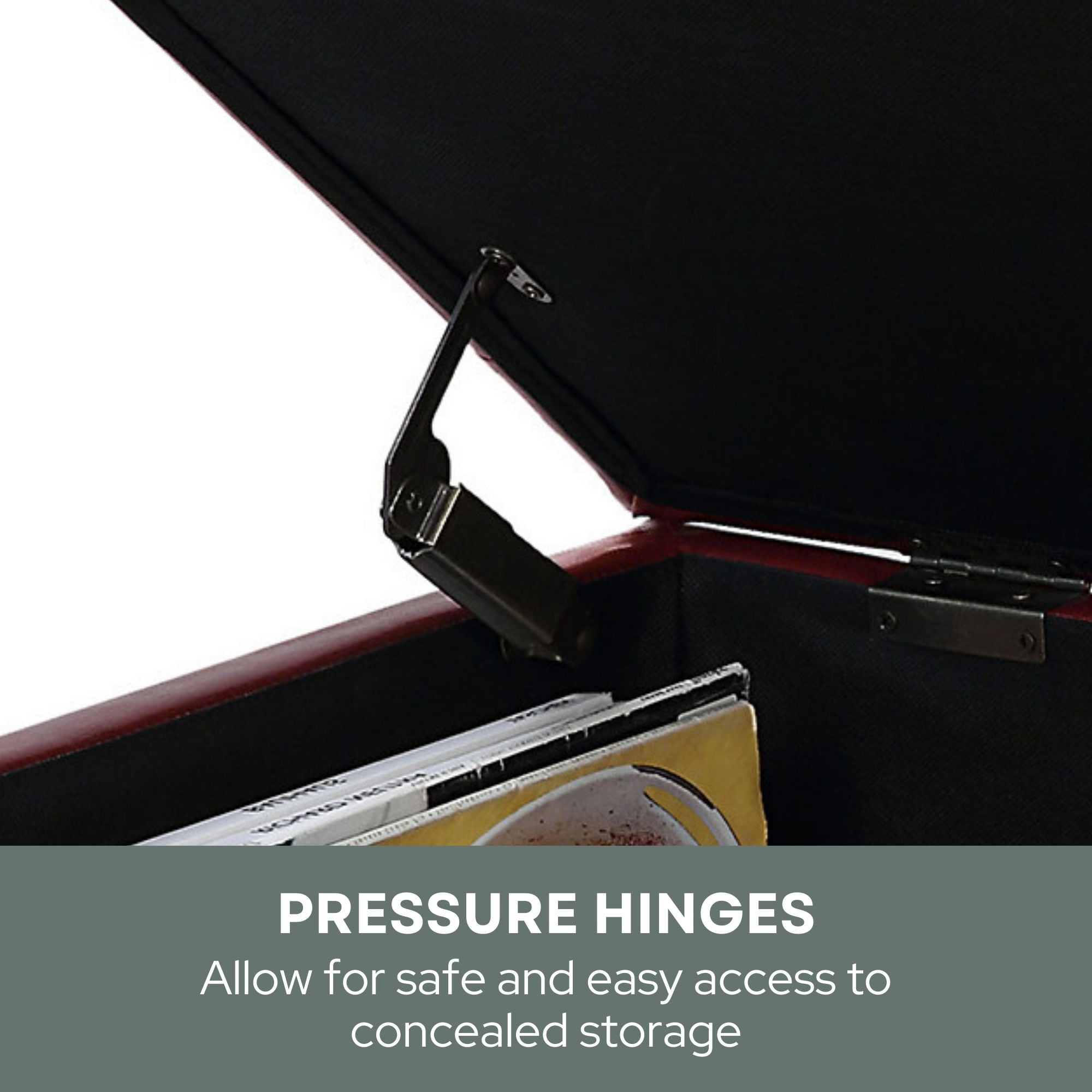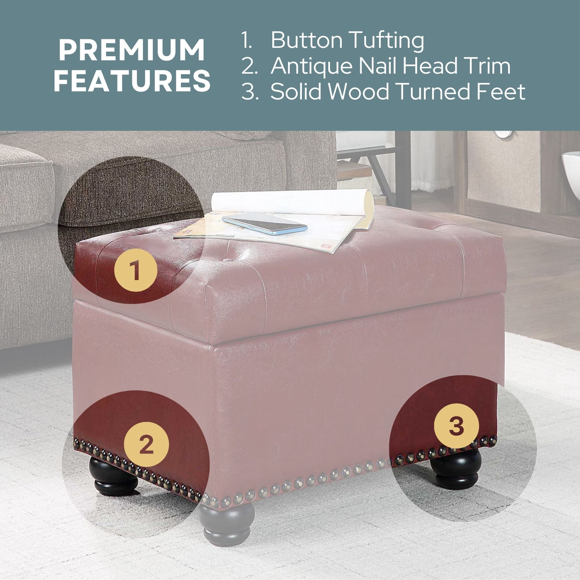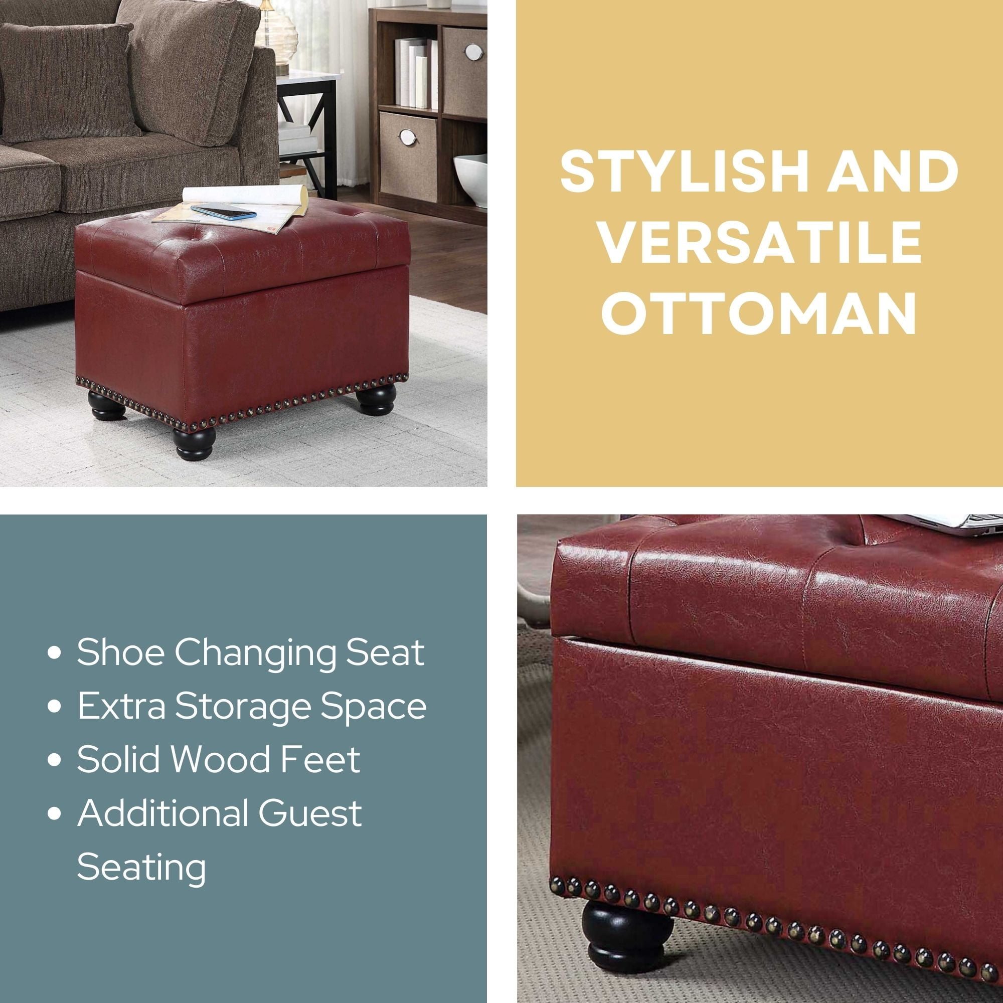 The Designs4Comfort 5th Avenue Storage Ottoman by Convenience Concepts brings style and functionality to any room. This multi-functioning ottoman doubles as extra seating; a footrest; and as a stylish storage unit. A gorgeous button-tufted top; fine stitching; and a beautiful antique nail head trim set this piece apart from the rest. The elegant storage unit offers plenty of space to tuck away blankets; small pillows; and more. A pressure hinge allows for the lid to stay open on its own giving safe and easy access to accessories stored within the ottoman. This contemporary piece is upholstered in a wide variety of luxurious fabrics and filled with padded foam cushions for maximum comfort. The well-built frame is engineered out of durable manufactured wood and supported by carefully crafted solid wood-turned feet. Assembly is simple with this beautiful piece arriving almost fully assembled and only the feet needing to be attached. With a wide variety of luxurious and timeless fabrics to choose from; you are sure to find an ottoman to tie any space together.