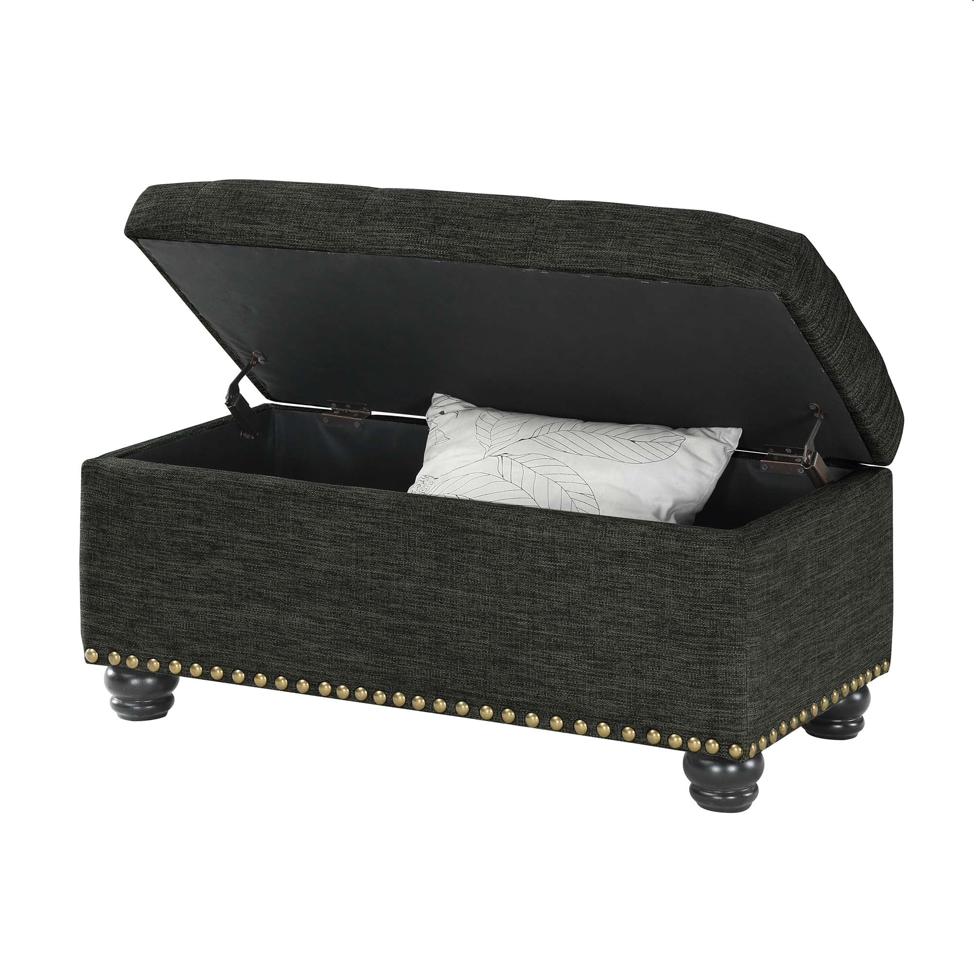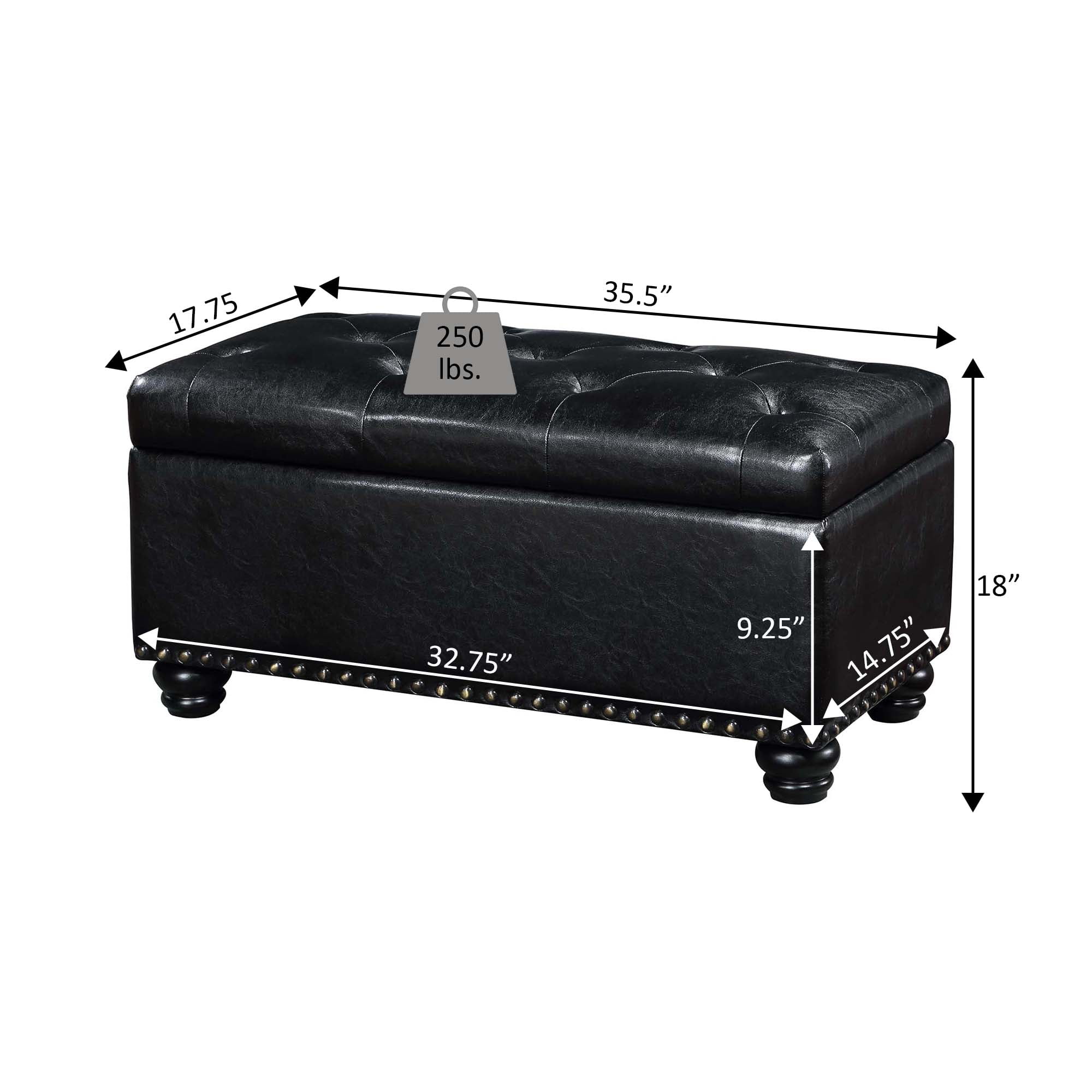 Convenience Concepts Designs4Comfort 7th Avenue Storage Ottoman, Dark Charcoal Gray Fabric Features: Part of the Designs4Comfort Collection by Convenience Concepts Contemporary Triples as a Footrest, Chair, and Storage Unit Pressure Hinge Allows for Safe and Easy Access to Concealed storage Space. Fine Stitching Detail, Button Tufting, Beautiful Nailhead Trim, and Solid Wood Turned Feet Sturdy Frame is Built From Solid and Manufactured Wood Low maintenance, easy to clean, and built for durability Easy 1-step assembly with instructions provided To Maintain and Protect your Furniture, Regularly Wipe Down All Surfaces with a Soft Clean Dry Cloth Color May Vary Slightly Due to Photography Lighting or Monitors Display Maximum Weight Capacity: 250 lbs. Assembled Item Weight: 22 lbs. Assembled product dimensions: (L) 35.5 in. x (W) 17.75 in. x (H) 18 in.”