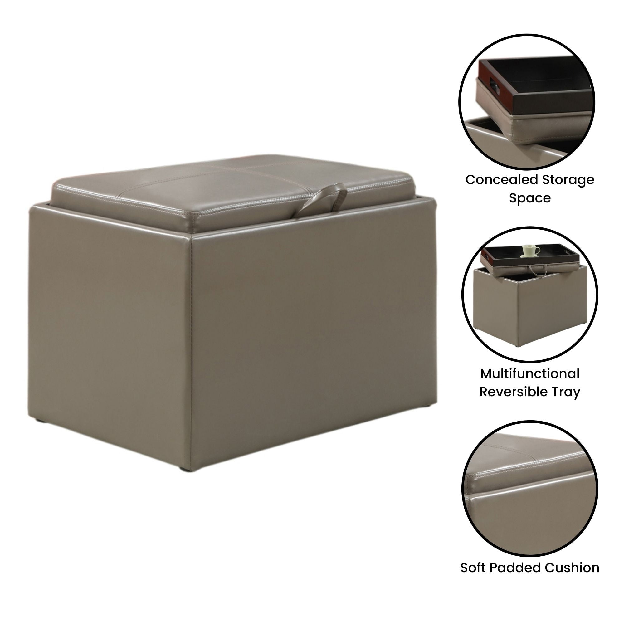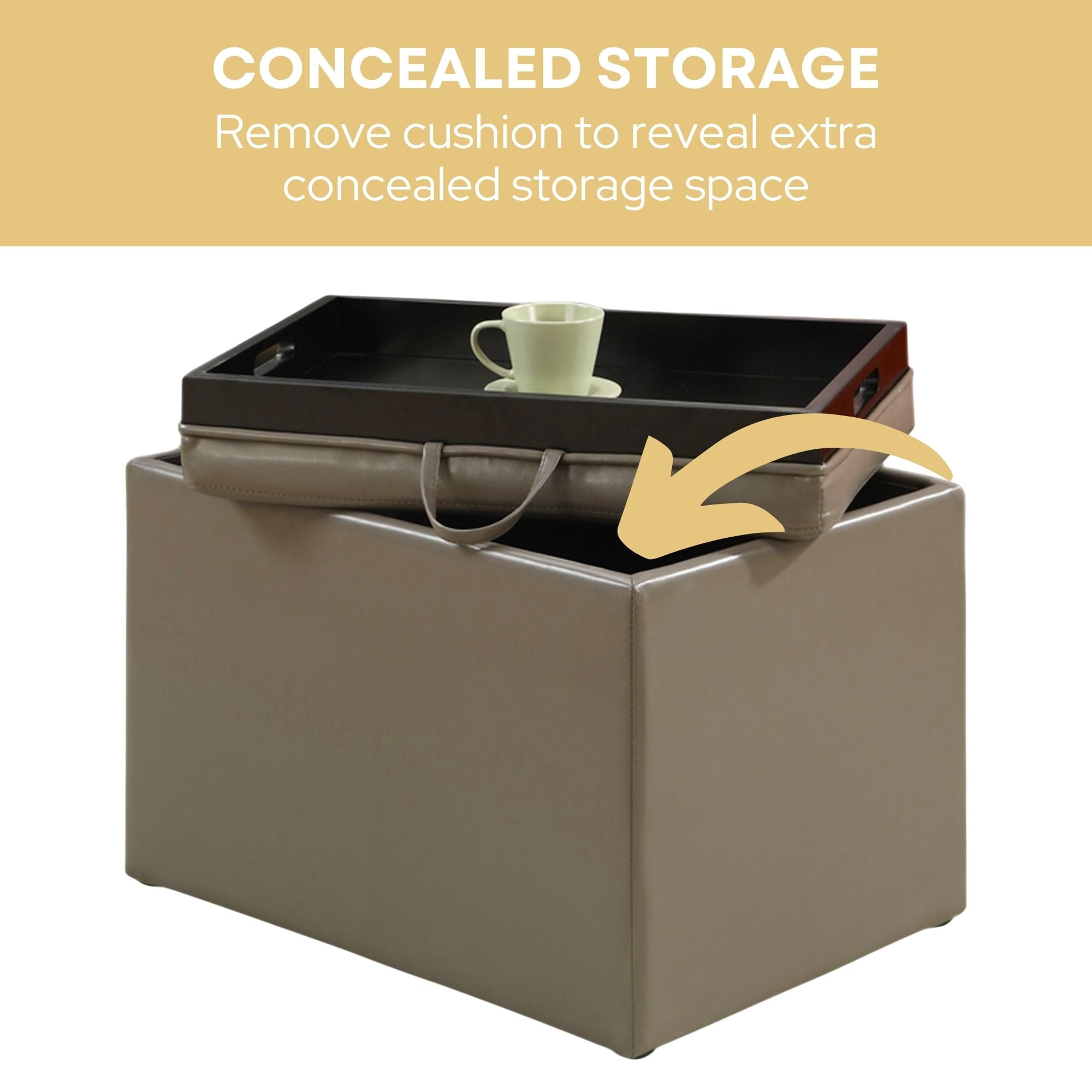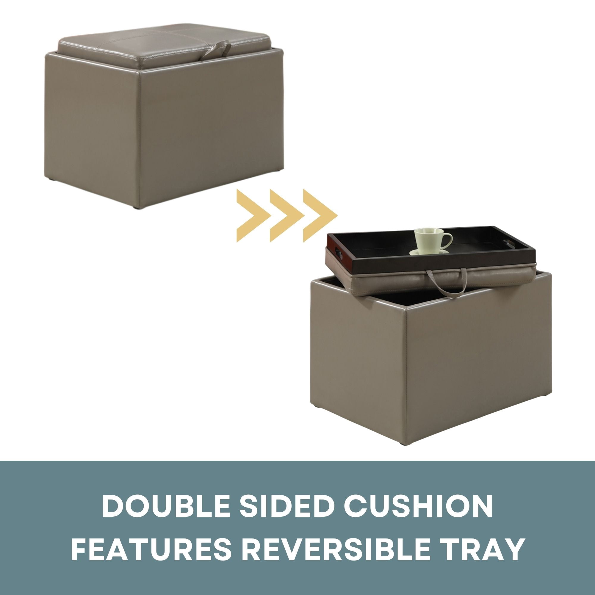 Convenience Concepts Designs4Comfort Accent Storage Ottoman, Taupe Gray Faux Leather Features: Part of the Designs4Comfort Collection by Convenience Concepts Modern & Contemporary Style Double-Sided Top Features Multifunctional Reversible Tray Remove Top to Reveal Additional Storage Space Foam Cushioned Top with Fine Stitching Detail Sturdy Frame is Crafted From Solid & Manufactured Wood Easy Assembly Requiring Only 1 Step! Low Maintenance, Easy to Clean, & Built for Durability Easy Assembly with Instructions Provided Color May Vary Slightly Due to Photography Lighting or Monitors Display Maximum Weight Capacity: 250 lbs. Assembled Item Weight: 11 lbs. Assembled Item Dimensions: (L) 22.75in x (W) 15.75in x (H) 16in.