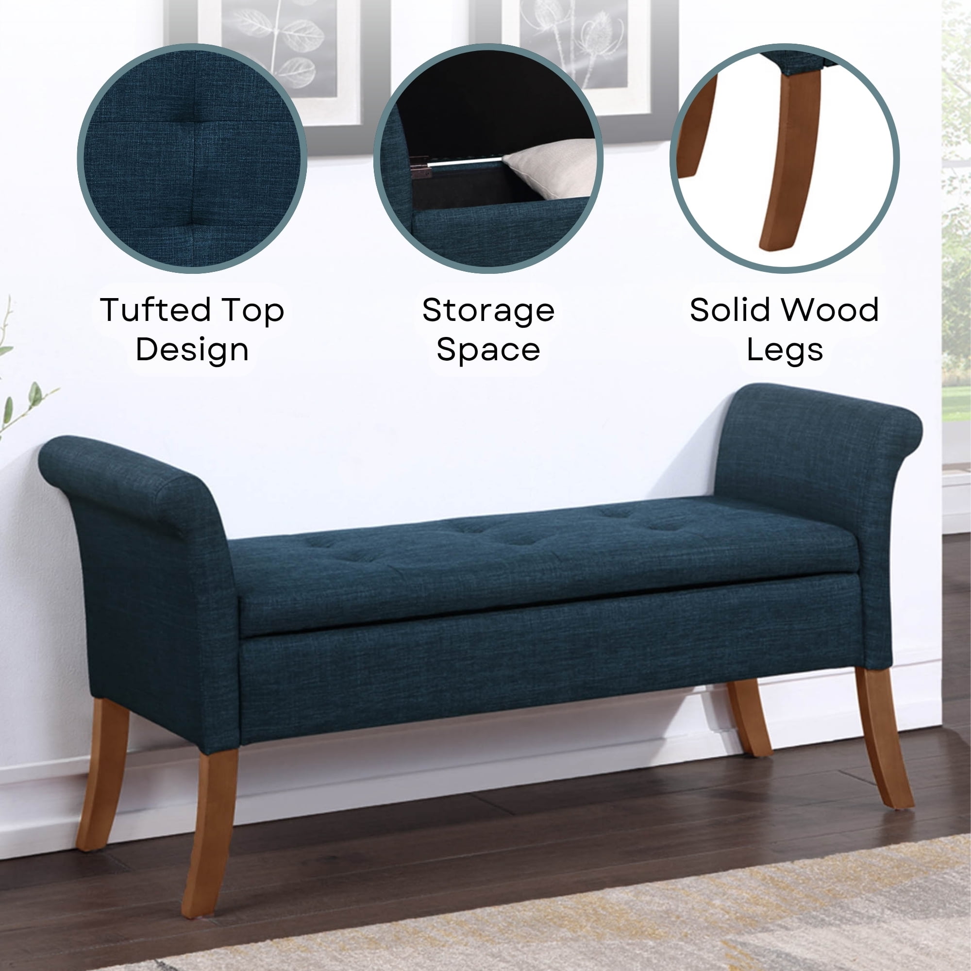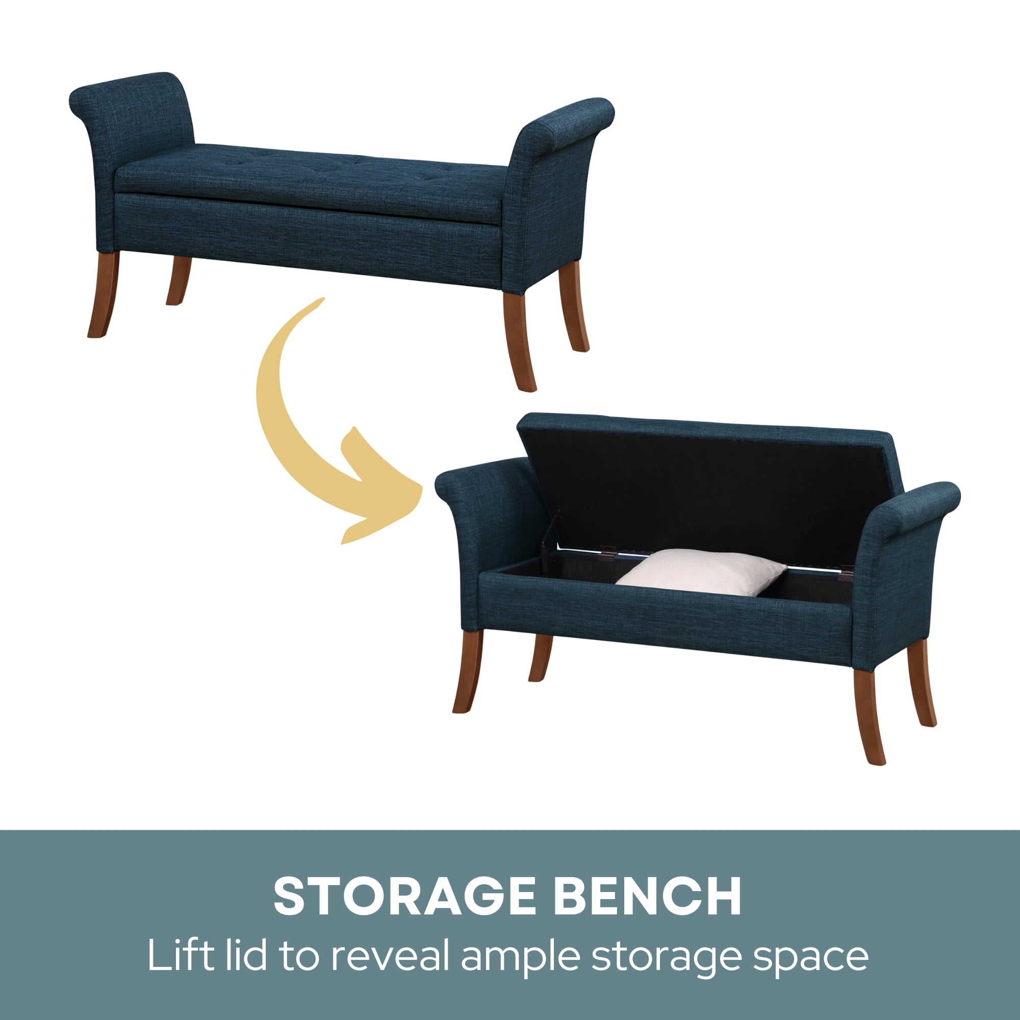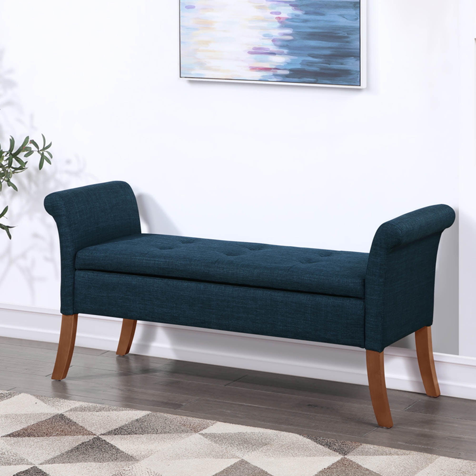 Convenience Concepts Designs4Comfort Garbo Storage Bench, Dark Blue Fabric Features: Part of the Designs4Comfort Collection by Convenience Concepts Contemporary and transitional style Upholstered in a variety of fabrics and faux Leathers Pressure hinges allow for safe and easy access to concealed storage Elegant rolled armrests, tufted stitching, and padded cushioned seat Sturdy Frame is Engineered from Solid Wood & Legs are Built from Solid Wood Easy assembly with instructions provided To maintain and protect your furniture, regularly wipe down all surfaces with a soft clean dry cloth Maximum Weight Capacity: 250 lbs. Assembled Item Weight: 36 lbs. Assembled Item Dimensions: (L) 51.25 in. x (W) 17 in. x (H) 25.25 in. Color may vary slightly due to photography lighting or monitors display