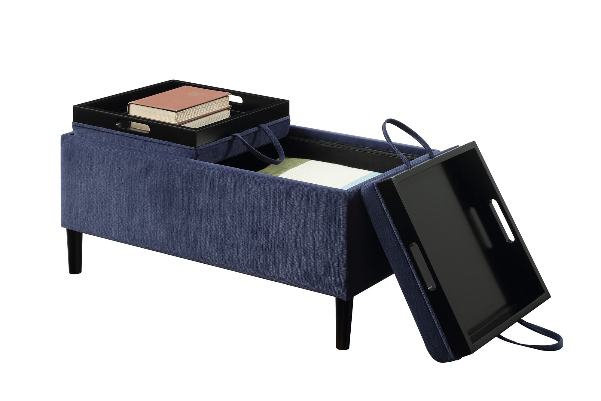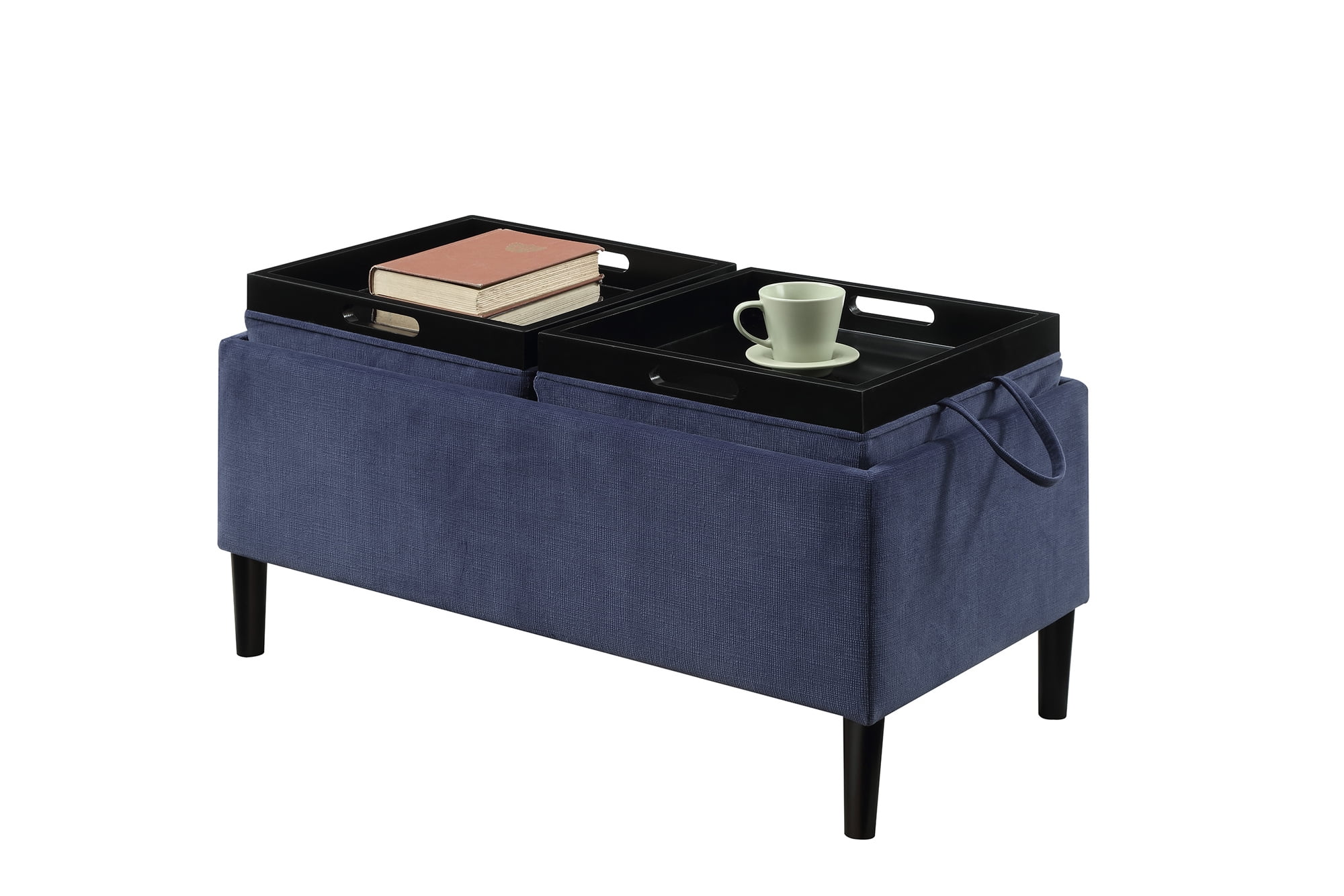 Convenience Concepts Designs4Comfort Magnolia Storage Ottoman with Reversible Trays, Dark Blue Corduroy Features: Part of the Designs2Go Collection by Convenience Concepts Modern and contemporary Style Upholstered in a variety of fabrics Double-sided top features two multifunctional reversible trays Concealed storage space Legs are crafted from solid wood Easy assembly with instructions provided To maintain and protect your furniture, regularly wipe down all surfaces with a soft clean dry cloth Maximum Weight Capacity: 250 lbs. Assembled Item Weight: 21 lbs. Assembled Item Dimensions: (L) 32 in. x (W) 16 in. x (H) 17 in. Color may vary slightly due to photography lighting or monitors display