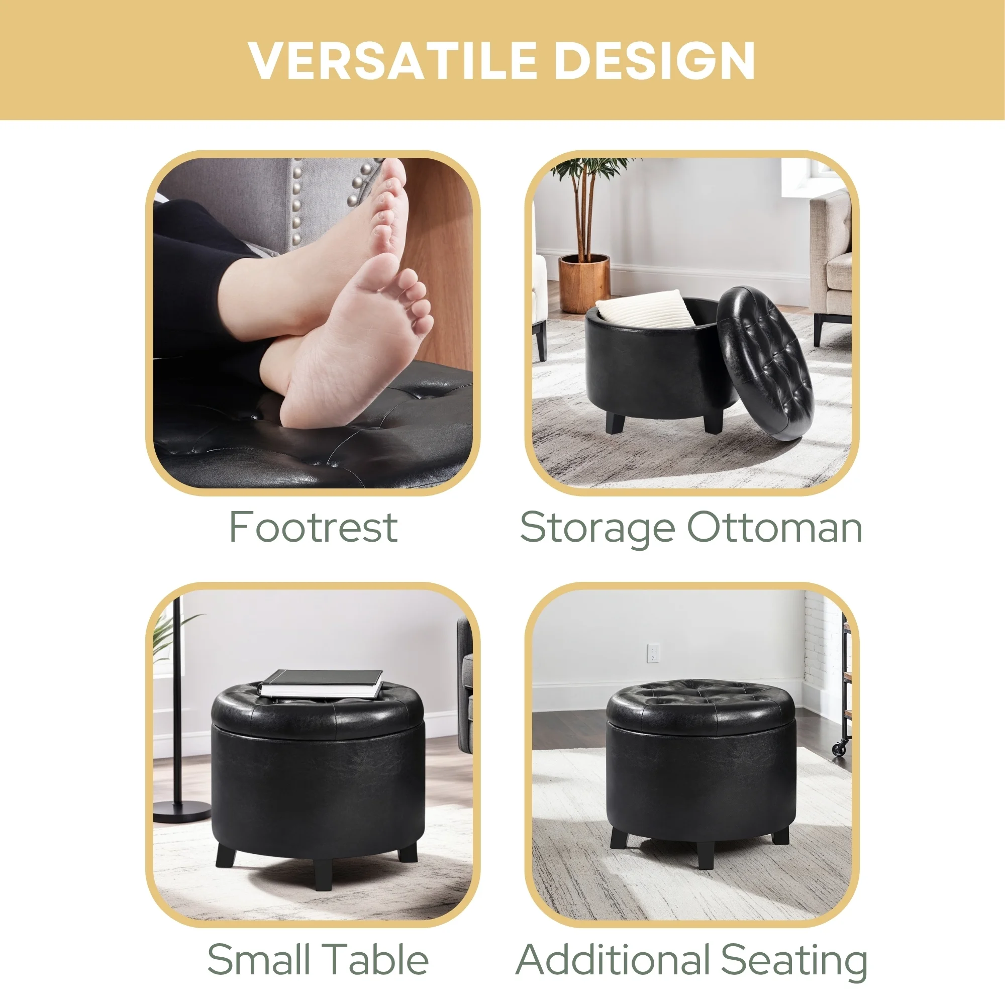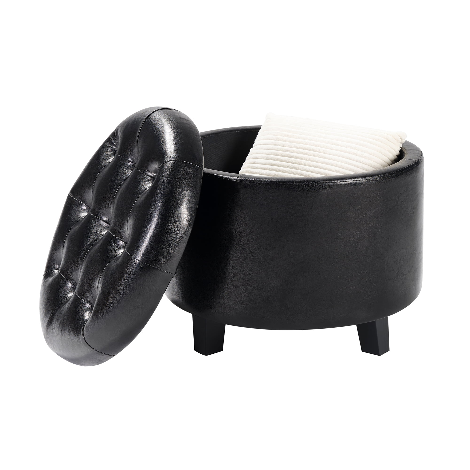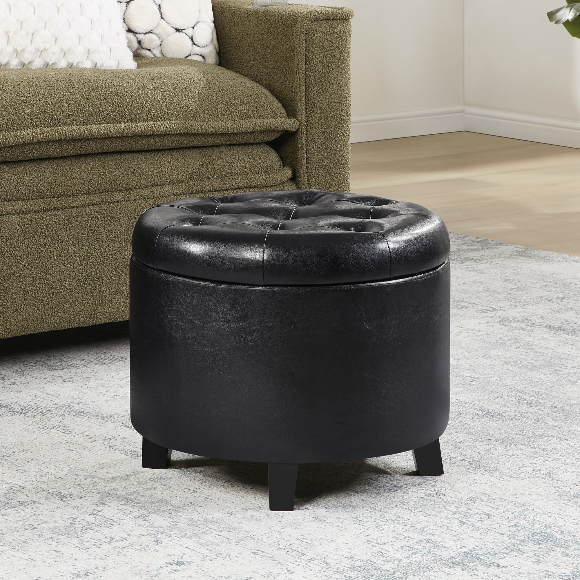 Convenience Concepts Designs4Comfort Round Storage Ottoman, Black Faux Leather Features: Part of the Designs4Comfort Collection by Convenience Concepts Transitional Style Removable Lid Offers Easy Access to Concealed Storage Foam Cushioned Top, Fine Stitching, & Button-Tufting Detail Sturdy Frame is Built From Solid & Manufactured Wood Easy Assembly Requiring Only 1 Step! Low Maintenance, Easy to Clean, & Built for Durability Easy Assembly with Instructions Provided Color May Vary Slightly Due to Photography Lighting or Monitors Display Maximum Weight Capacity: 250 lbs. Assembled Item Weight: 11 lbs. Assembled Item Dimensions: (W) 19.75in x (L) 19.75in x (H) 17in.