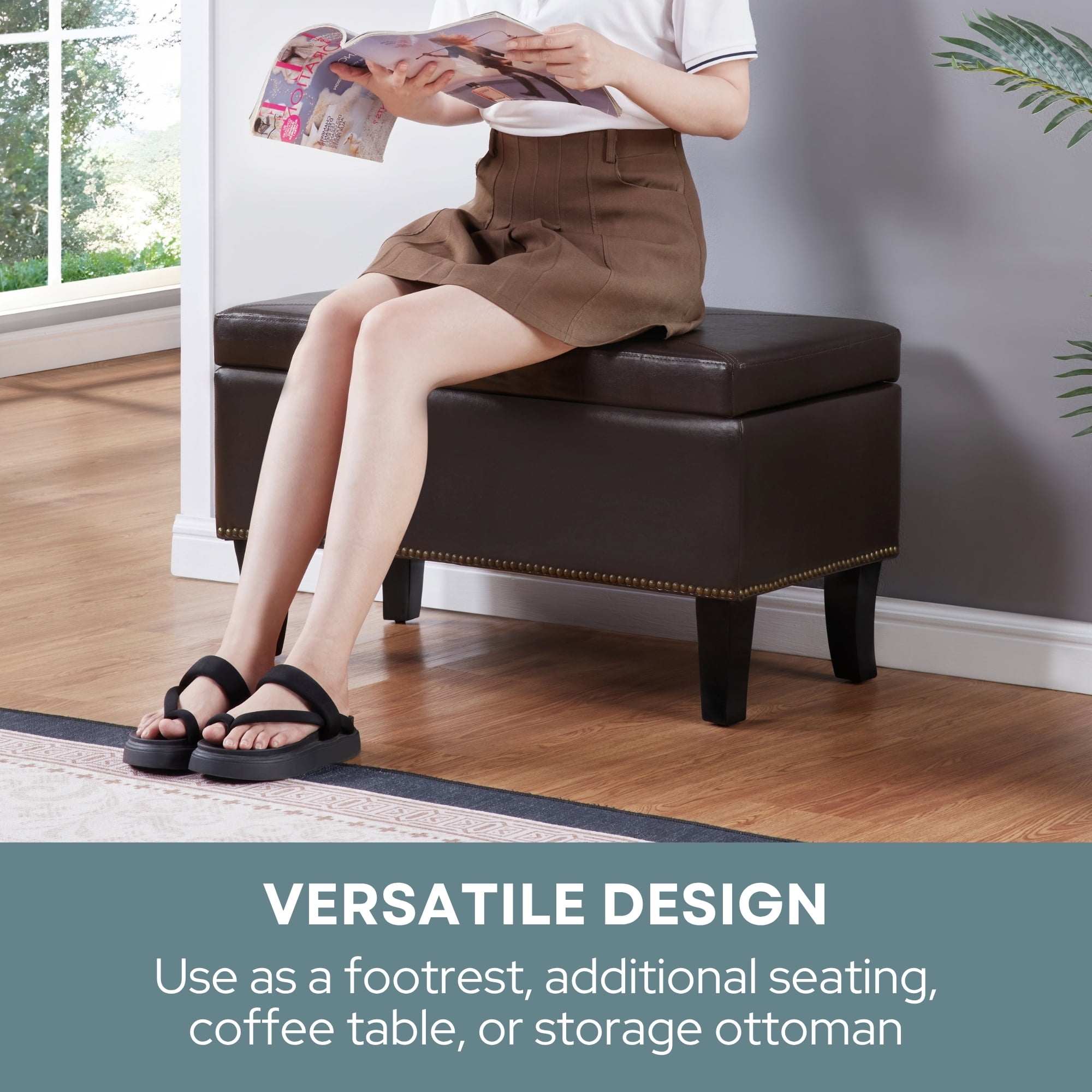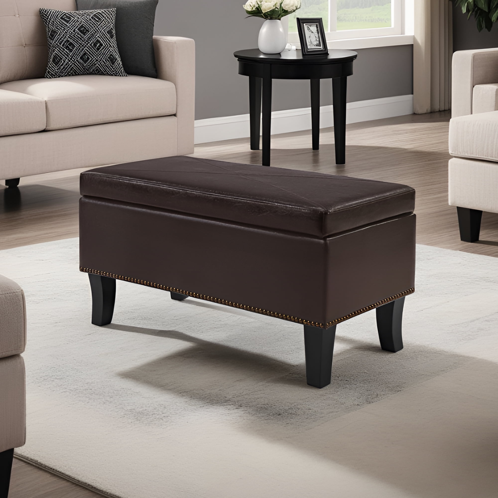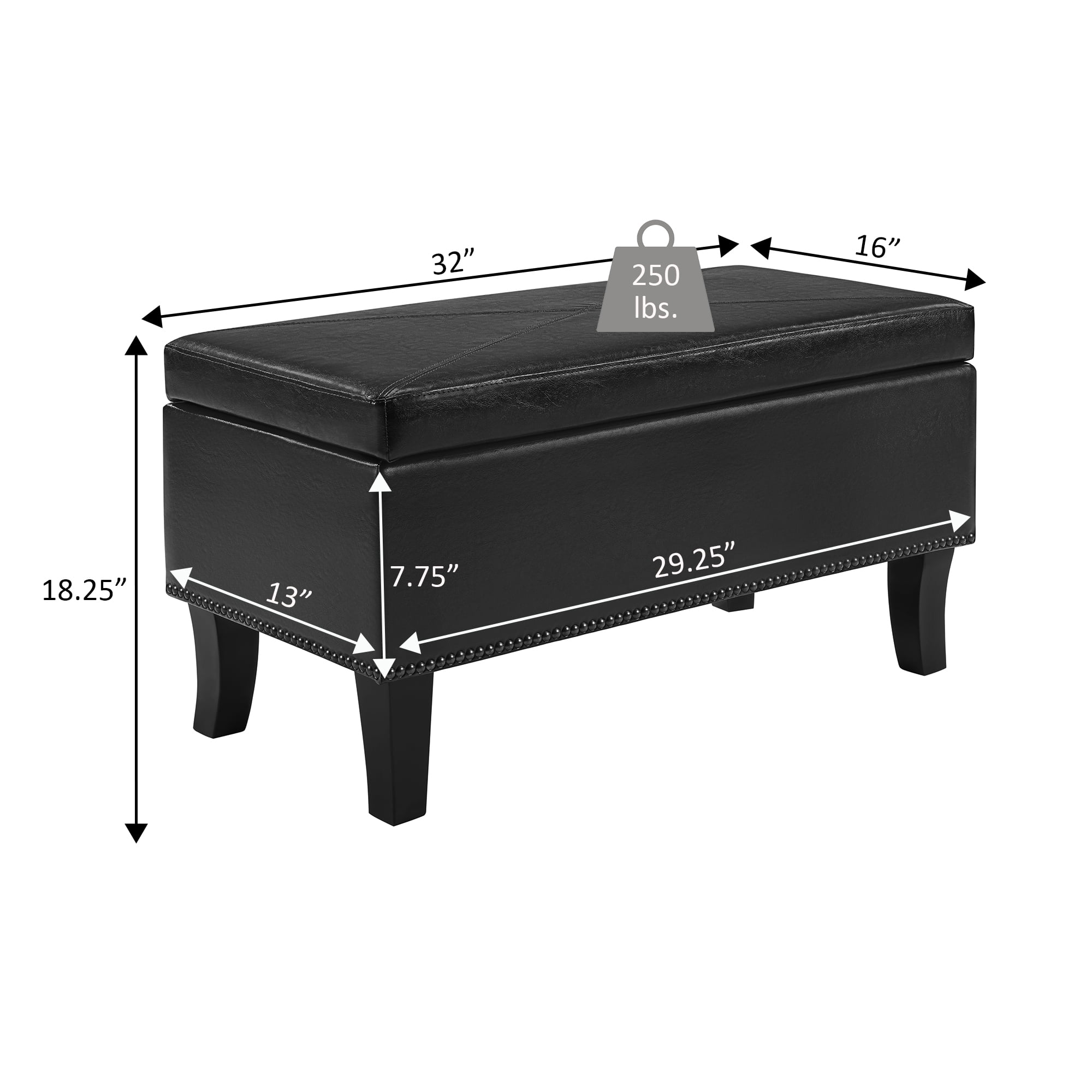 Beautiful Espresso faux leather finish Material: Faux Leather and Wood Nail Head Beads Hinged Lid Storage Space Additional Seating 18″ H x 16″ W x 32″ D